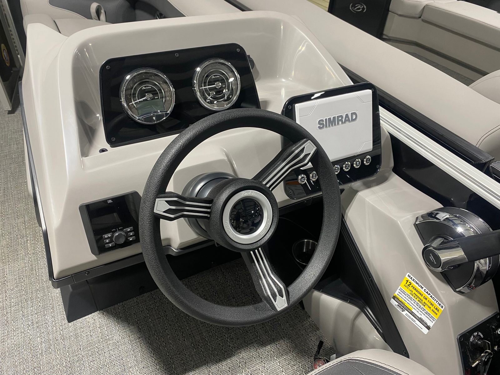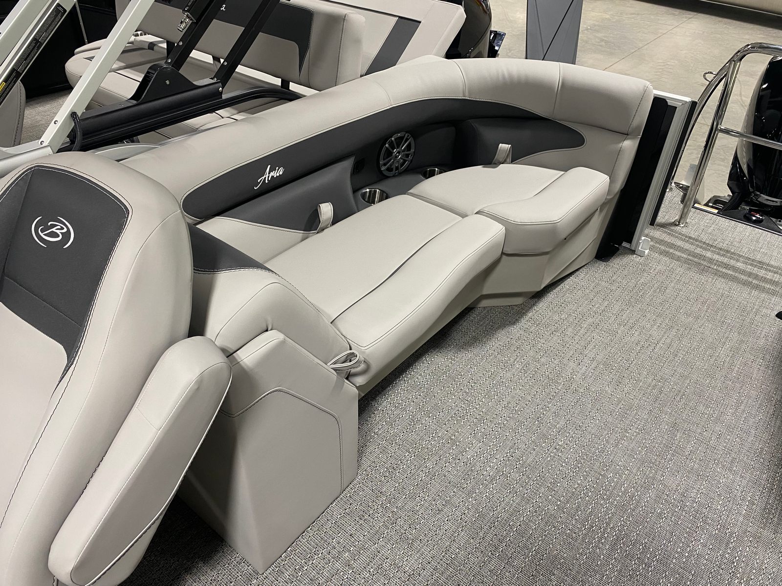 The Barletta Aria A22QC-Platinum is packed with premium features designed to enhance your time on the water. The stainless steel flag pole with an American flag adds a patriotic touch to the exterior, while the in-floor midship storage (available with the Triple Toon Package) provides ample space for all your gear and essentials. The helm is equipped with a state-of-the-art Simrad 7" G07 XSE, offering advanced navigation and control at your fingertips. The thoughtfully designed furniture in Tempest Gray ensures maximum comfort, and the Amore Gray flooring is both stylish and easy to maintain. Every detail has been carefully considered to provide a seamless blend of luxury, convenience, and functionality.