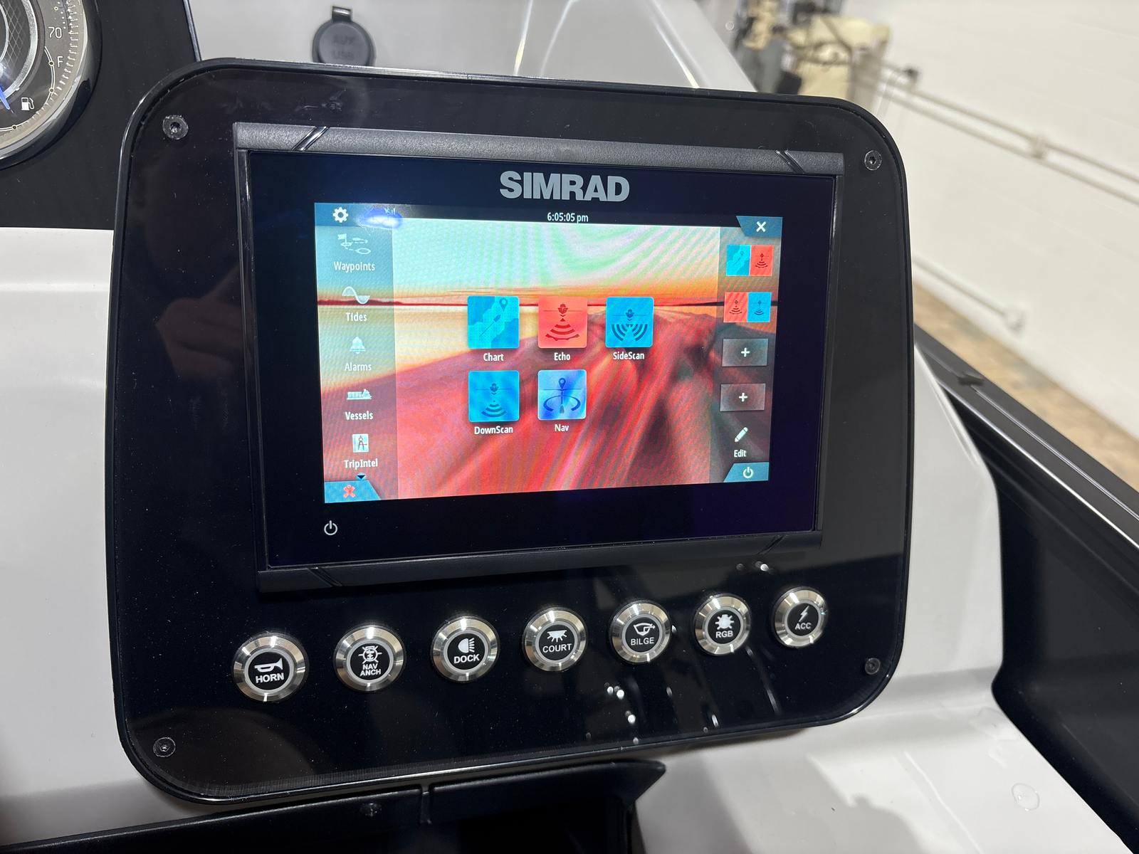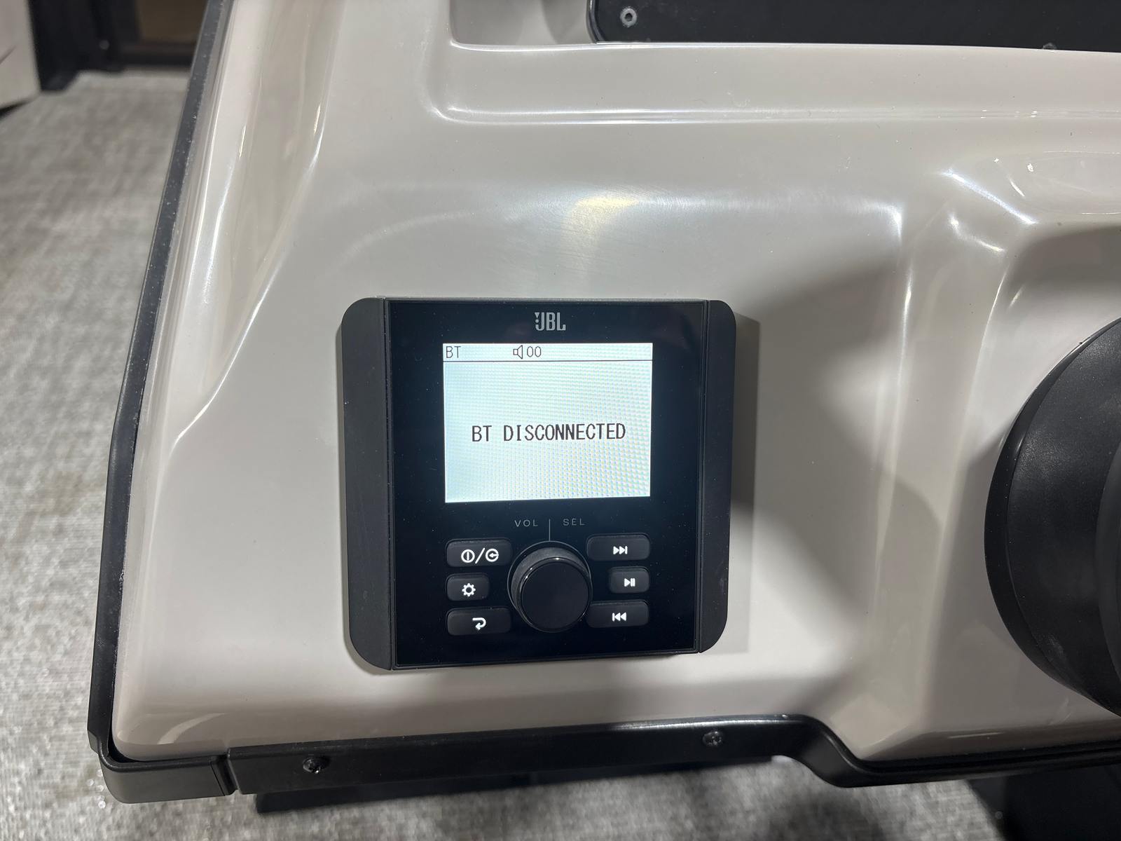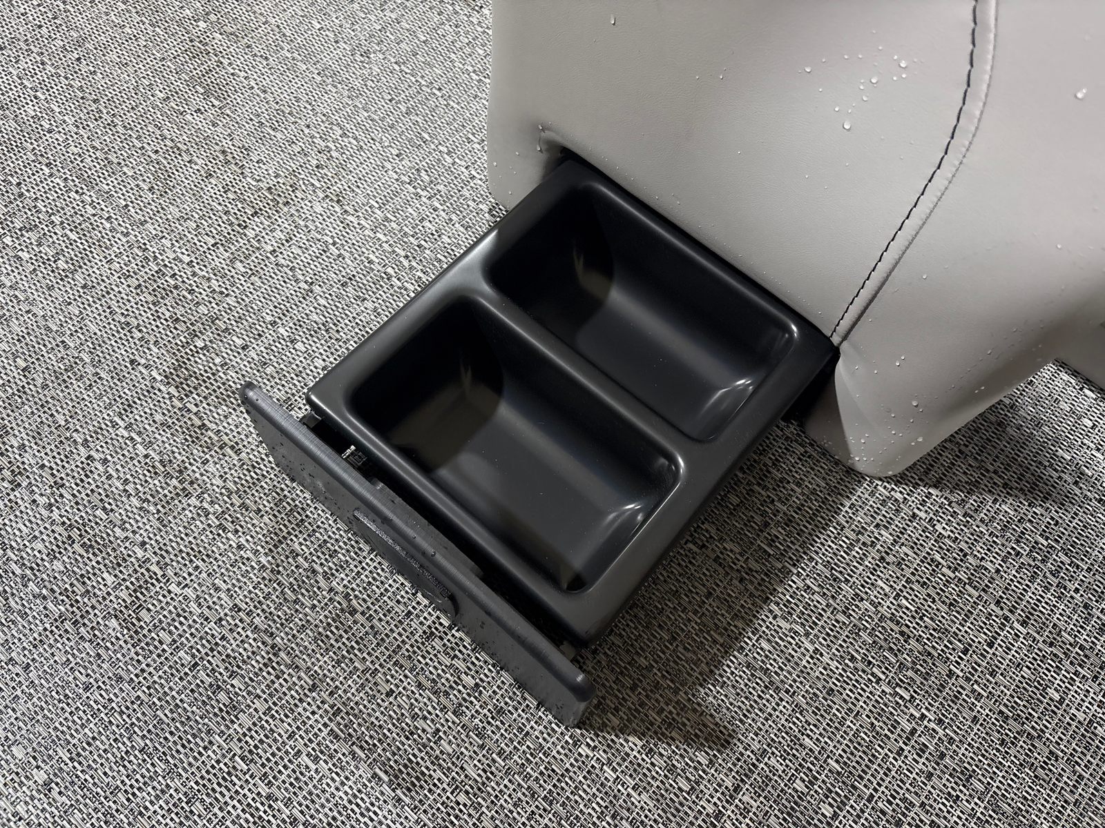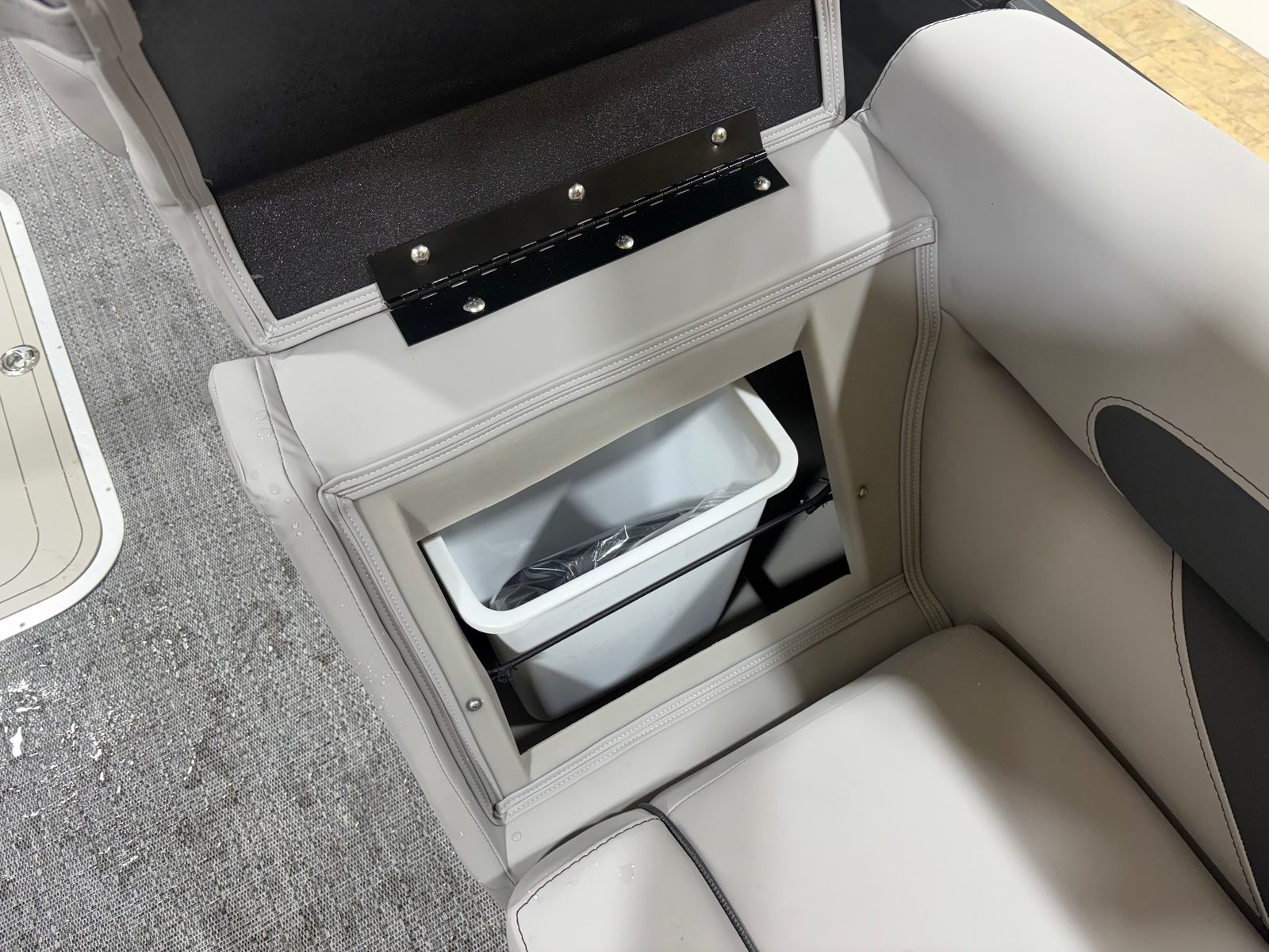 Step aboard and discover a world of comfort and style. The Tempest Gray furniture offers plush seating for family and friends, creating an inviting space to relax and socialize. The Amore Gray flooring is both elegant and practical, providing a slip-resistant surface that’s easy to clean and maintain. The Blackout Package Aria adds a bold, contemporary touch to the boat’s overall aesthetic, while the stainless steel flag pole with an American flag adds a patriotic flair to your outings. Every detail, from the Railskin accents to the triple toon configuration, is thoughtfully designed to enhance your boating experience.