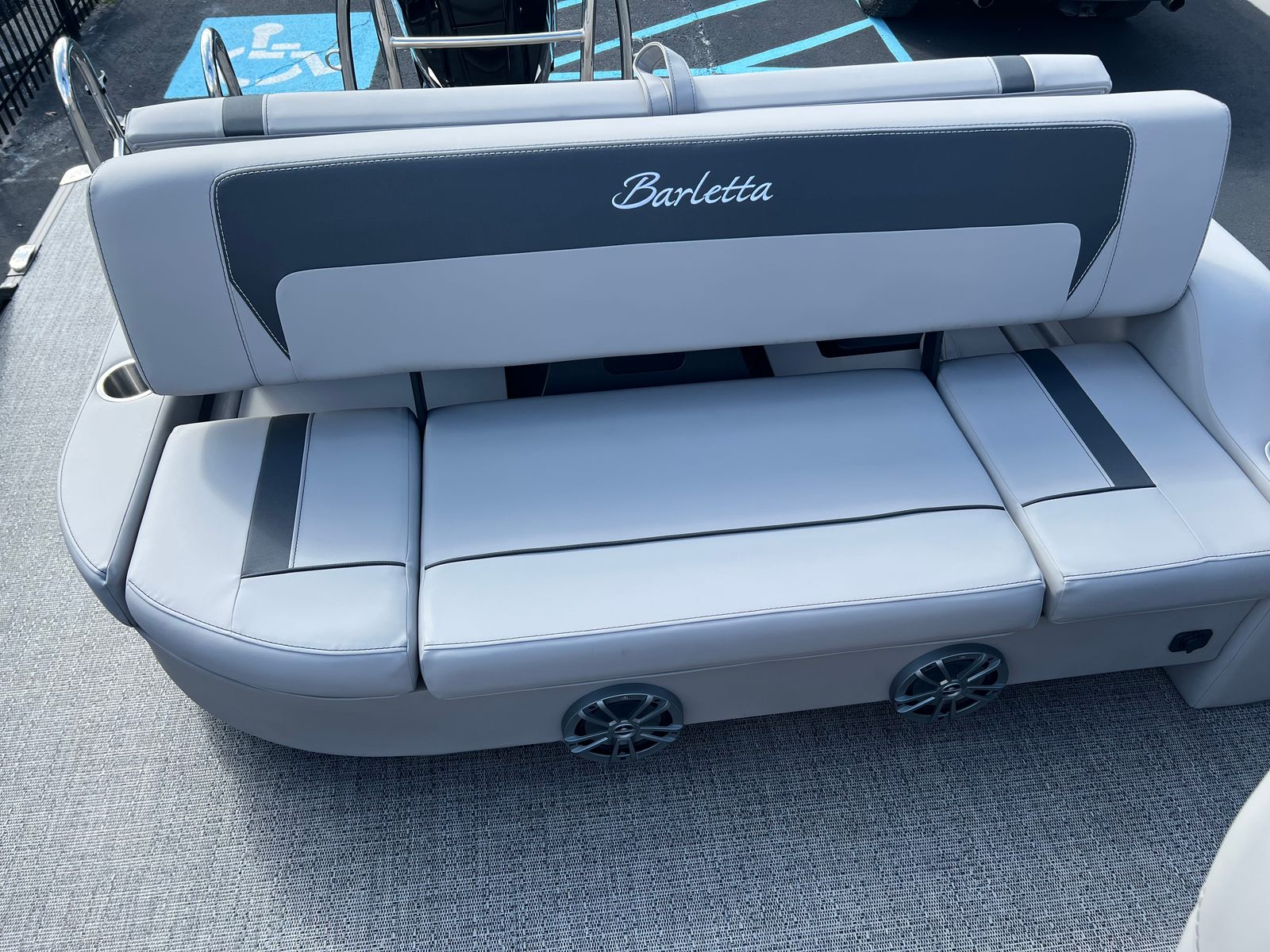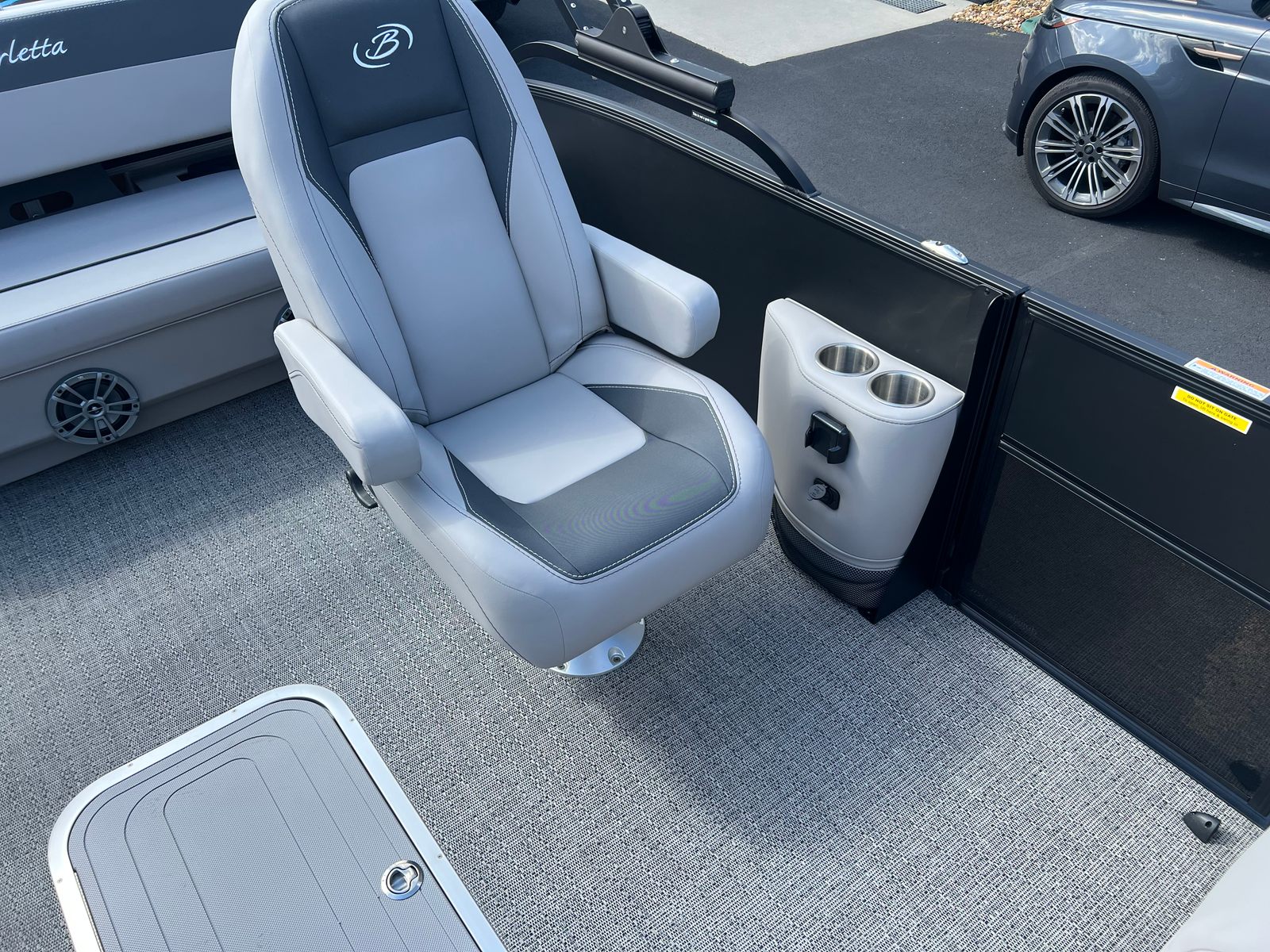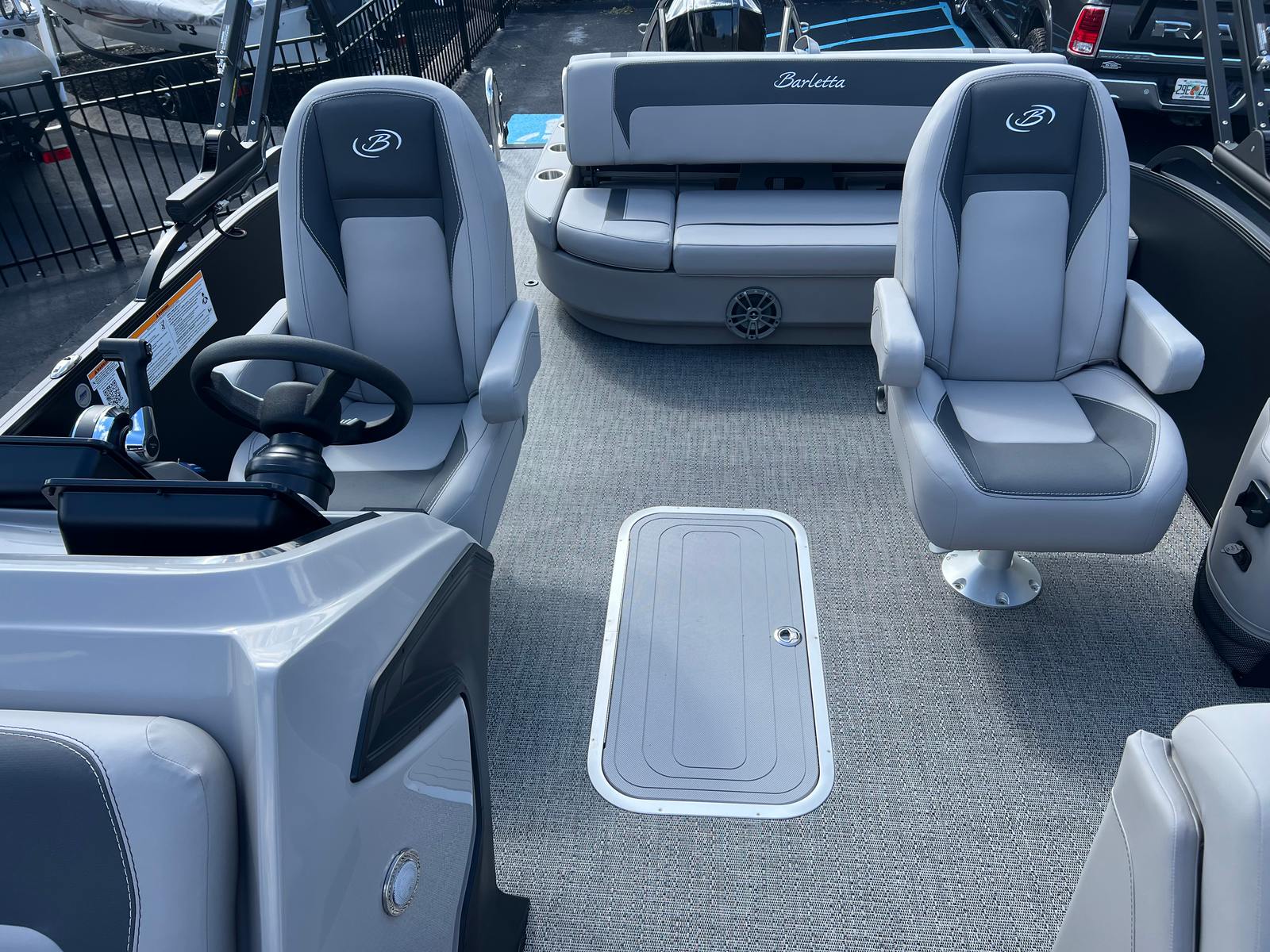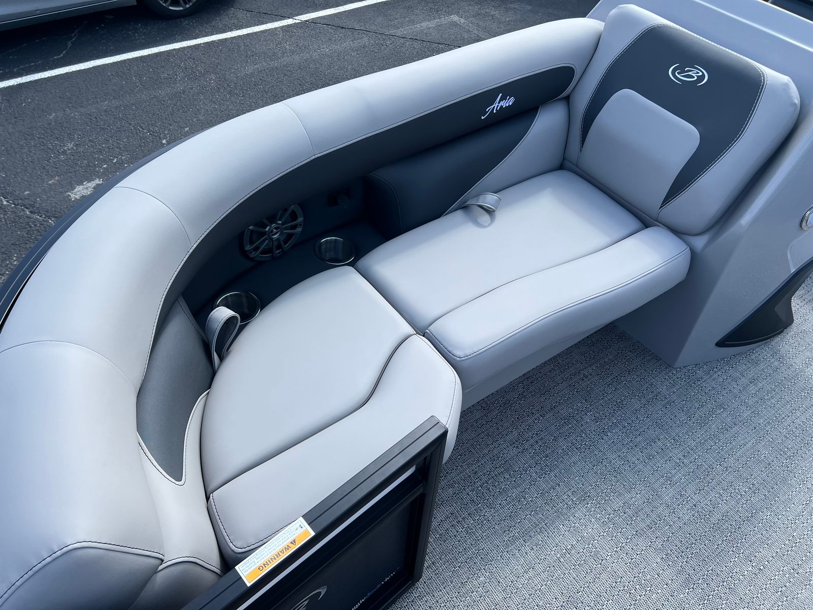 The Barletta Aria A22UC-Platinum is packed with special features that elevate your boating experience. The Railskin Color Aria in Matte Black, complemented by the Railskin Accent Aria in Winter White, creates a striking visual contrast that’s both modern and timeless. The Blackout Package Aria adds an extra touch of sophistication, ensuring your pontoon stands out from the crowd.Inside, the furniture is finished in Tempest Gray, offering plush seating and ample space for relaxation. The Amore Gray flooring is not only stylish but also practical, providing a comfortable and easy-to-clean surface. The Triple Toon Package Aria enhances stability and performance, making this pontoon boat ideal for a variety of water activities.A stainless steel flag pole with an American flag adds a patriotic flair, perfect for celebrating special occasions or simply showing your pride. Every detail is thoughtfully designed to maximize comfort, convenience, and enjoyment.