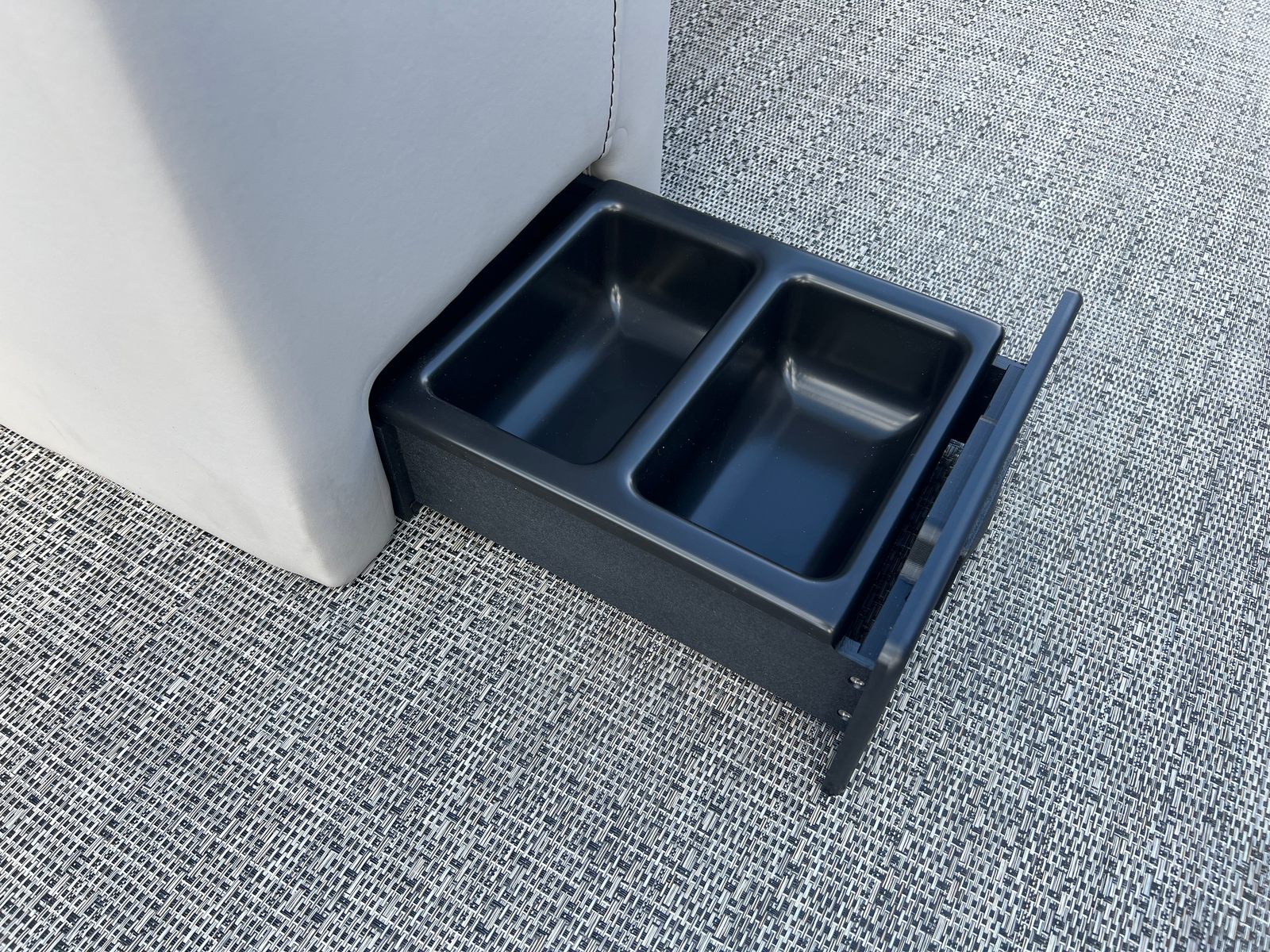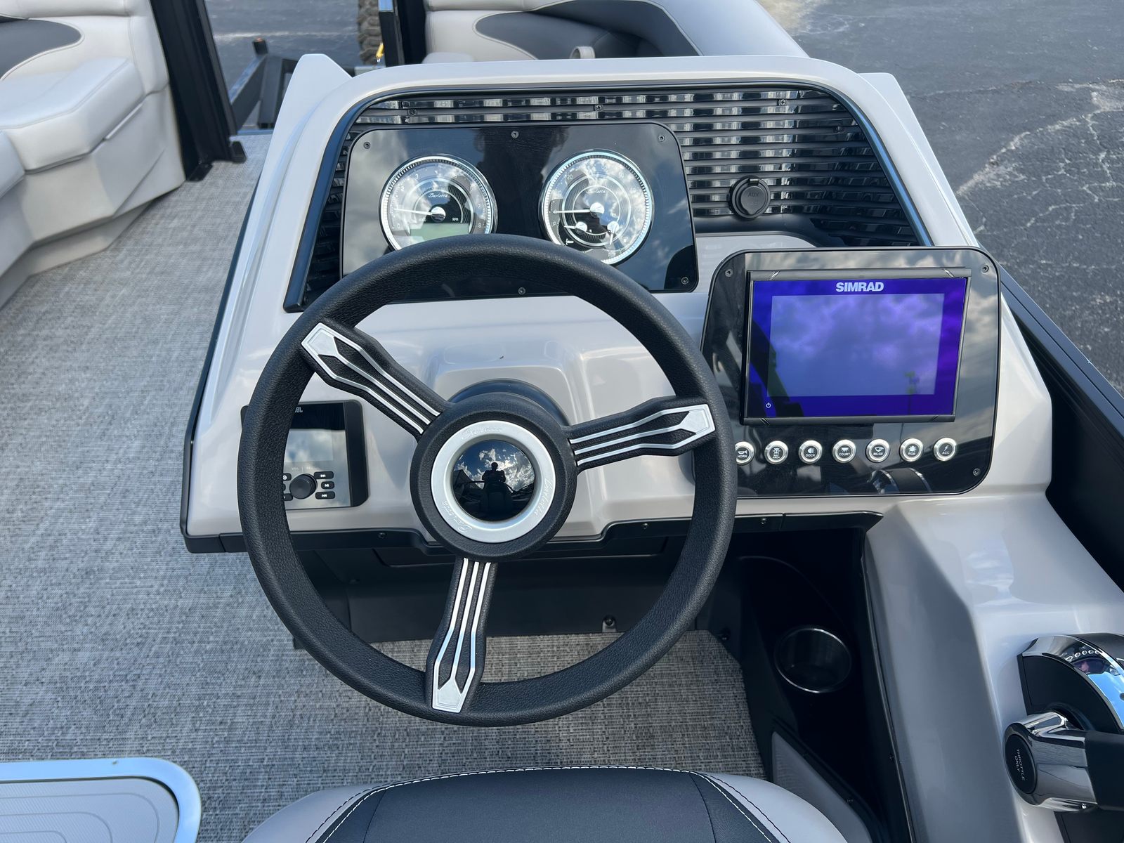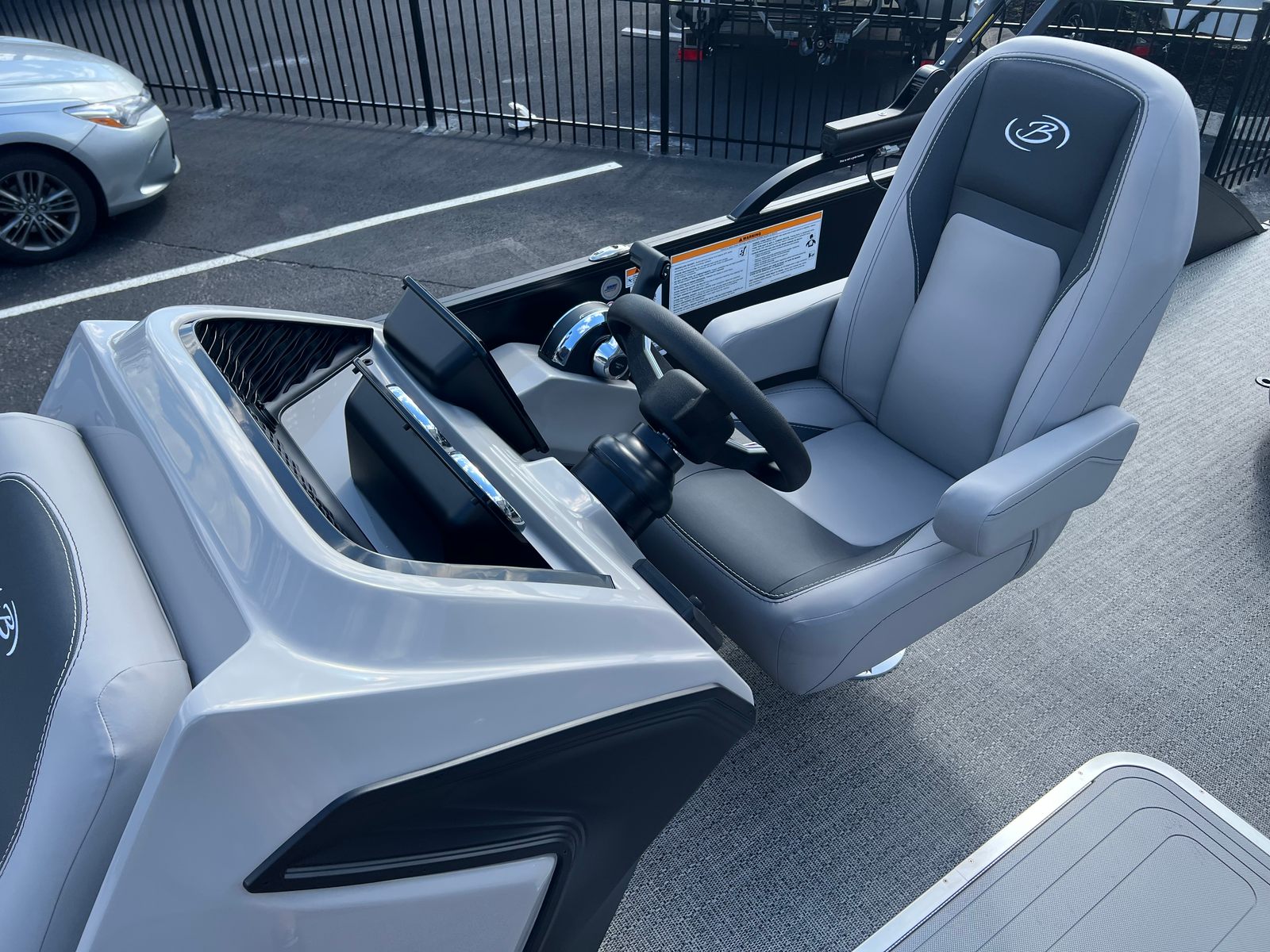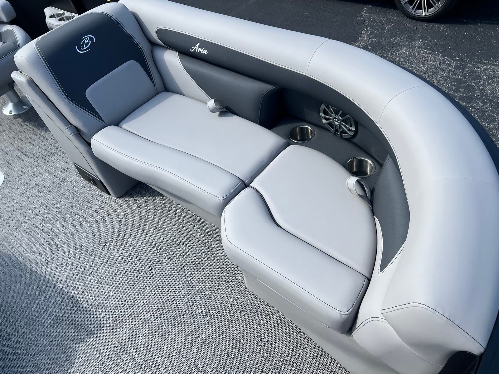 The Barletta Aria A22UC-Platinum is packed with special features that elevate your boating experience. The Railskin Color Aria in Matte Black, complemented by the Railskin Accent Aria in Winter White, creates a striking visual contrast that’s both modern and timeless. The Blackout Package Aria adds an extra touch of sophistication, ensuring your pontoon stands out from the crowd.Inside, the furniture is finished in Tempest Gray, offering plush seating and ample space for relaxation. The Amore Gray flooring is not only stylish but also practical, providing a comfortable and easy-to-clean surface. The Triple Toon Package Aria enhances stability and performance, making this pontoon boat ideal for a variety of water activities.A stainless steel flag pole with an American flag adds a patriotic flair, perfect for celebrating special occasions or simply showing your pride. Every detail is thoughtfully designed to maximize comfort, convenience, and enjoyment.