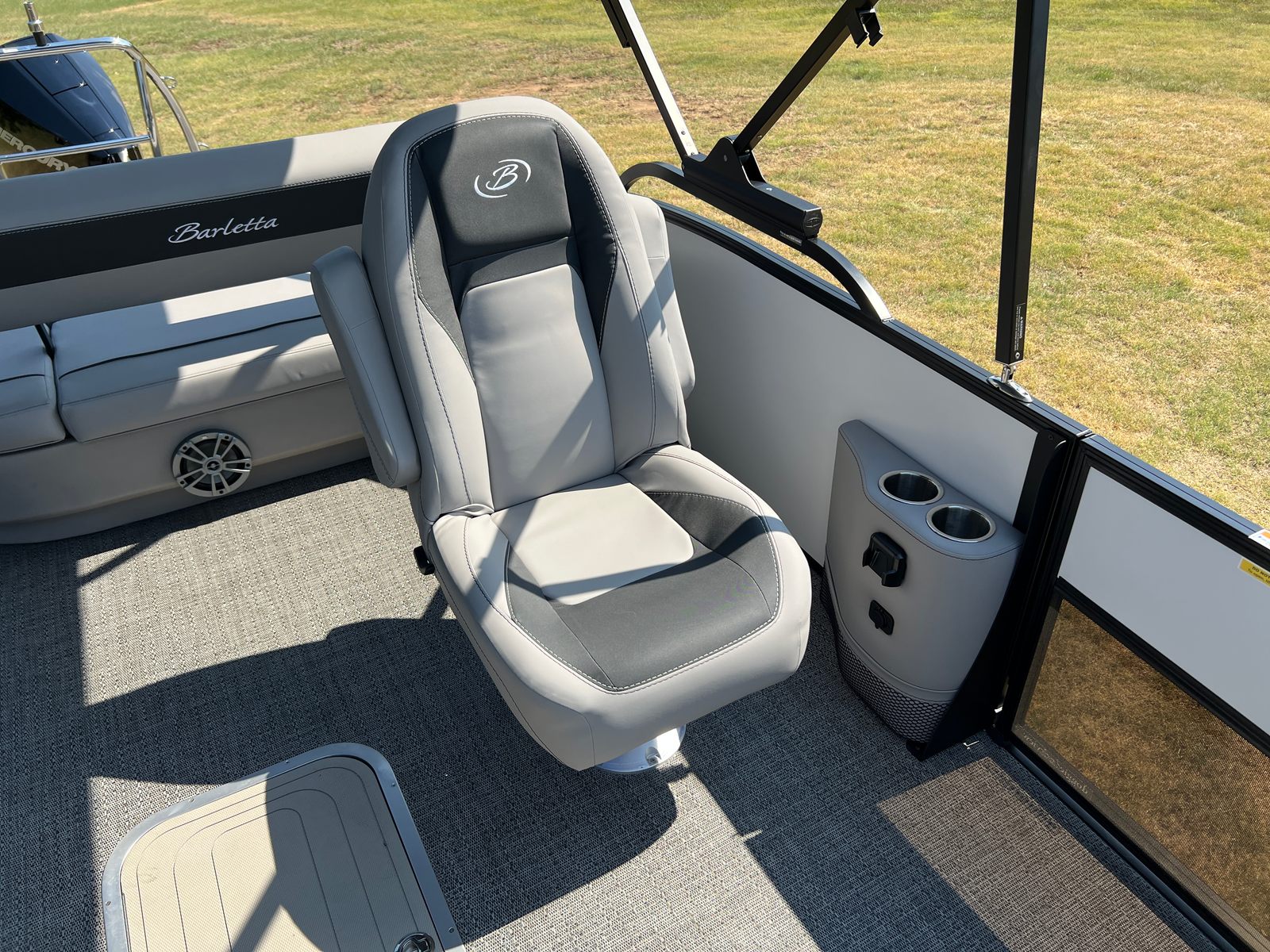 The Barletta Aria A22UC-Platinum is packed with features that set it apart from other pontoon boats for sale. The Railskin Color Aria in Winter White, combined with the Blackout Package Aria, creates a striking and sophisticated exterior that turns heads at every marina. Inside, the Tempest Gray furniture offers plush seating and a modern look, while the Amore Gray flooring adds a touch of elegance and is easy to maintain.The Triple Toon Package Aria provides enhanced stability and buoyancy, making this pontoon ideal for larger groups and ensuring a smooth ride even in choppier waters. The in-floor midship storage offers ample space for all your gear, keeping the deck clutter-free and organized. A stainless steel flag pole with an American flag adds a patriotic touch and a sense of pride to every outing.