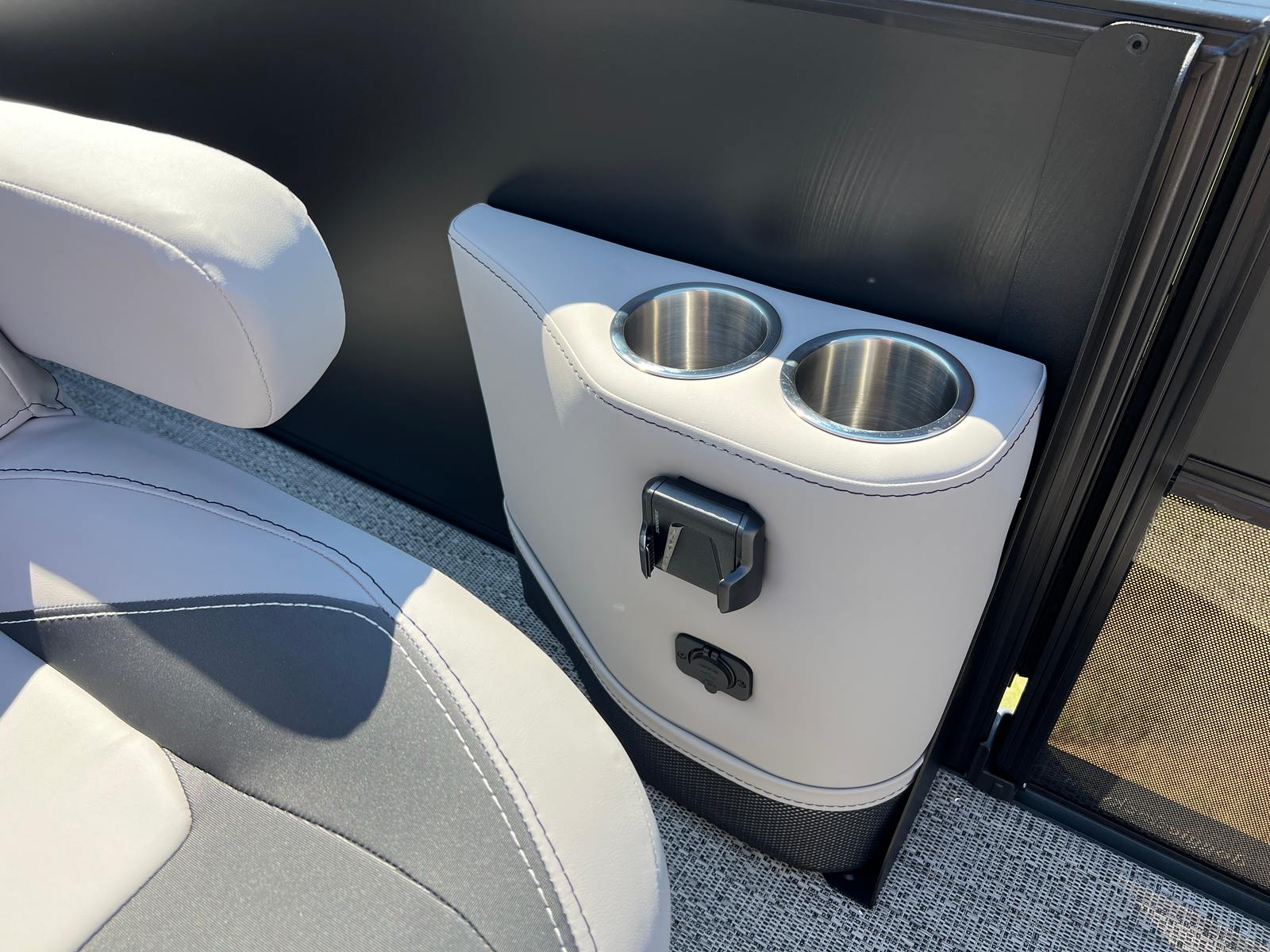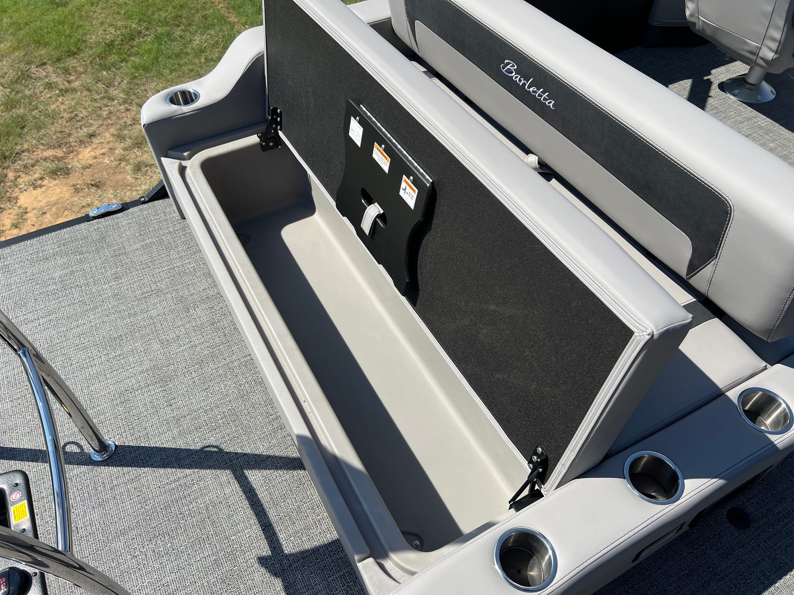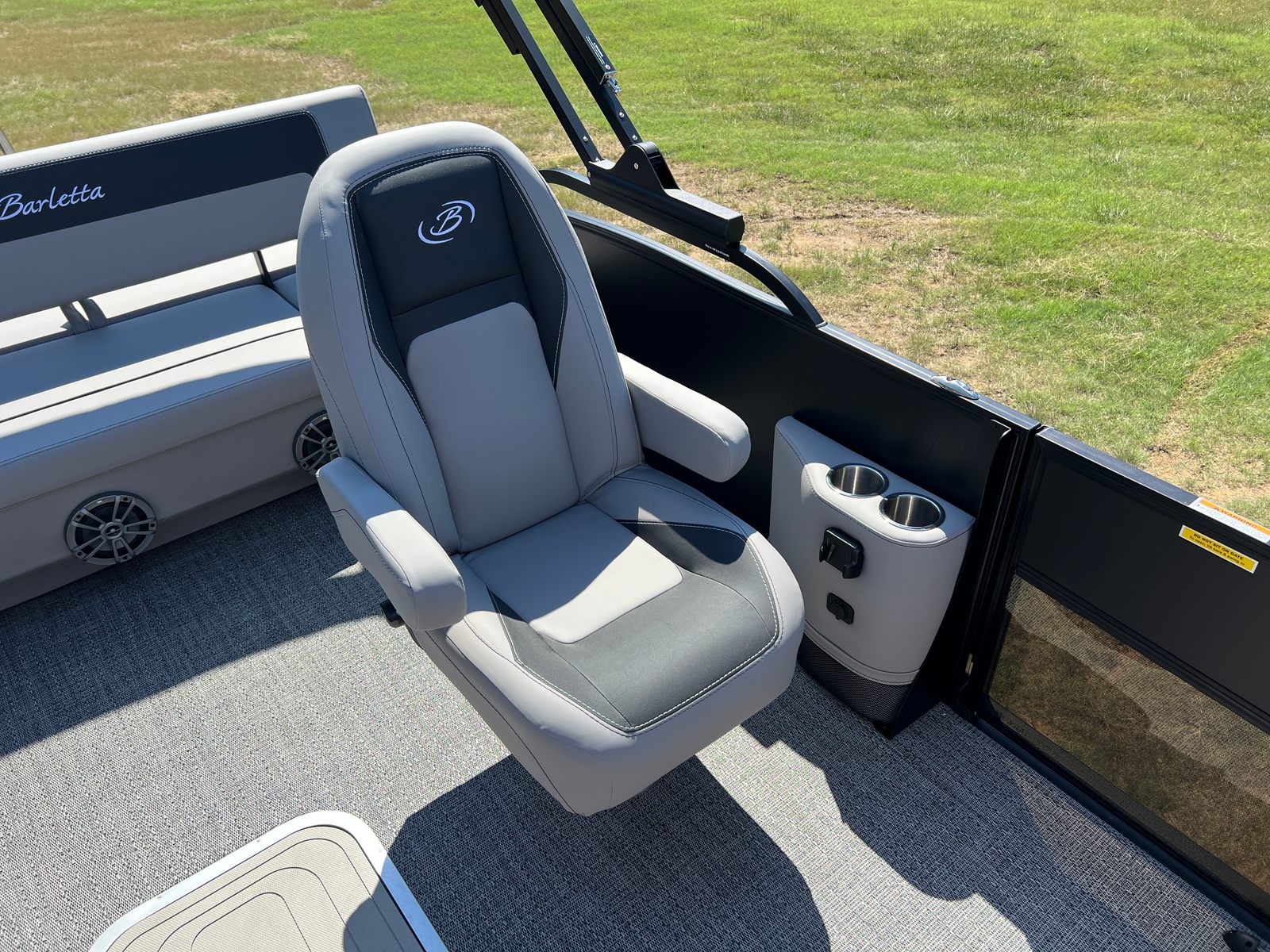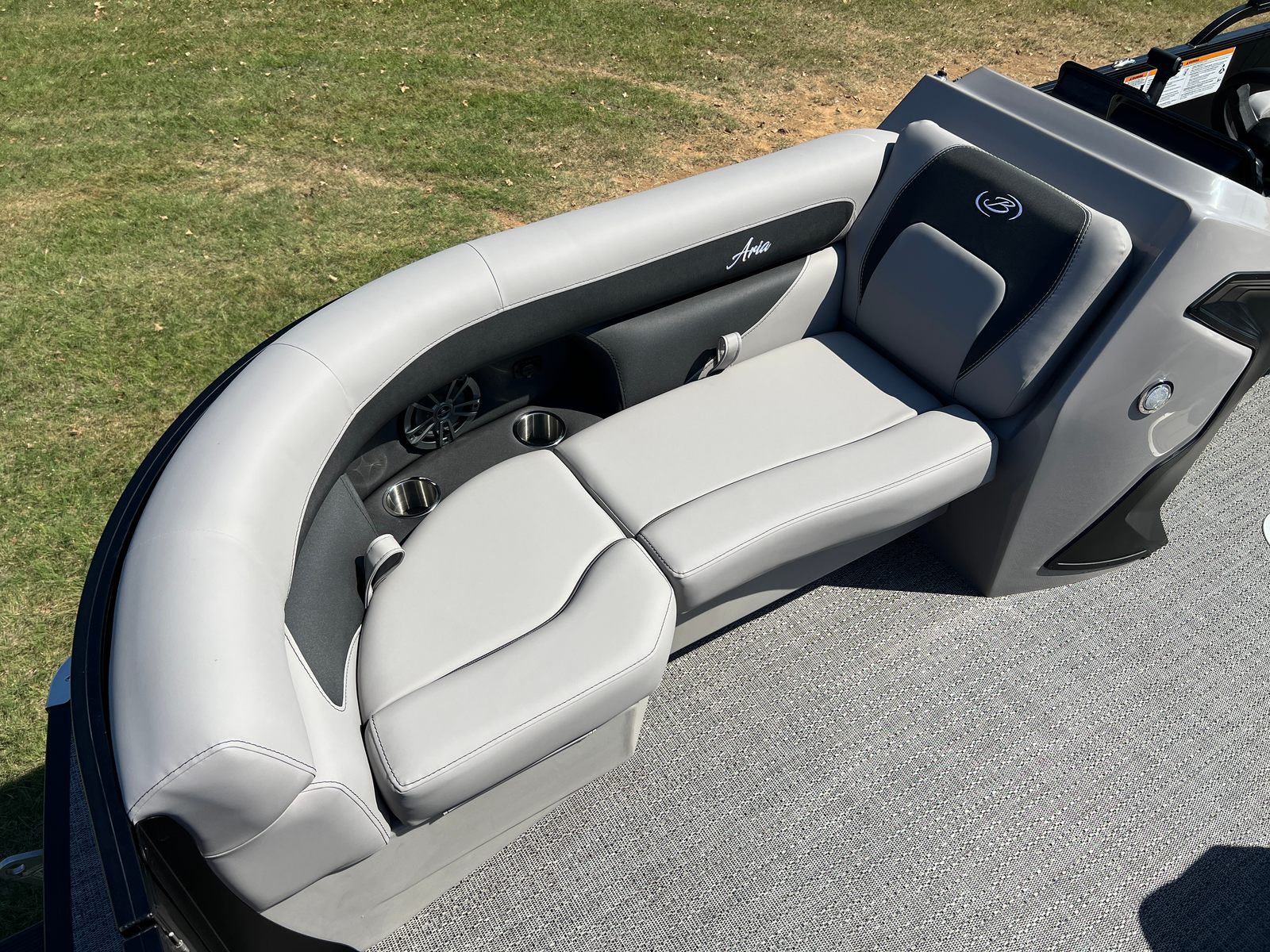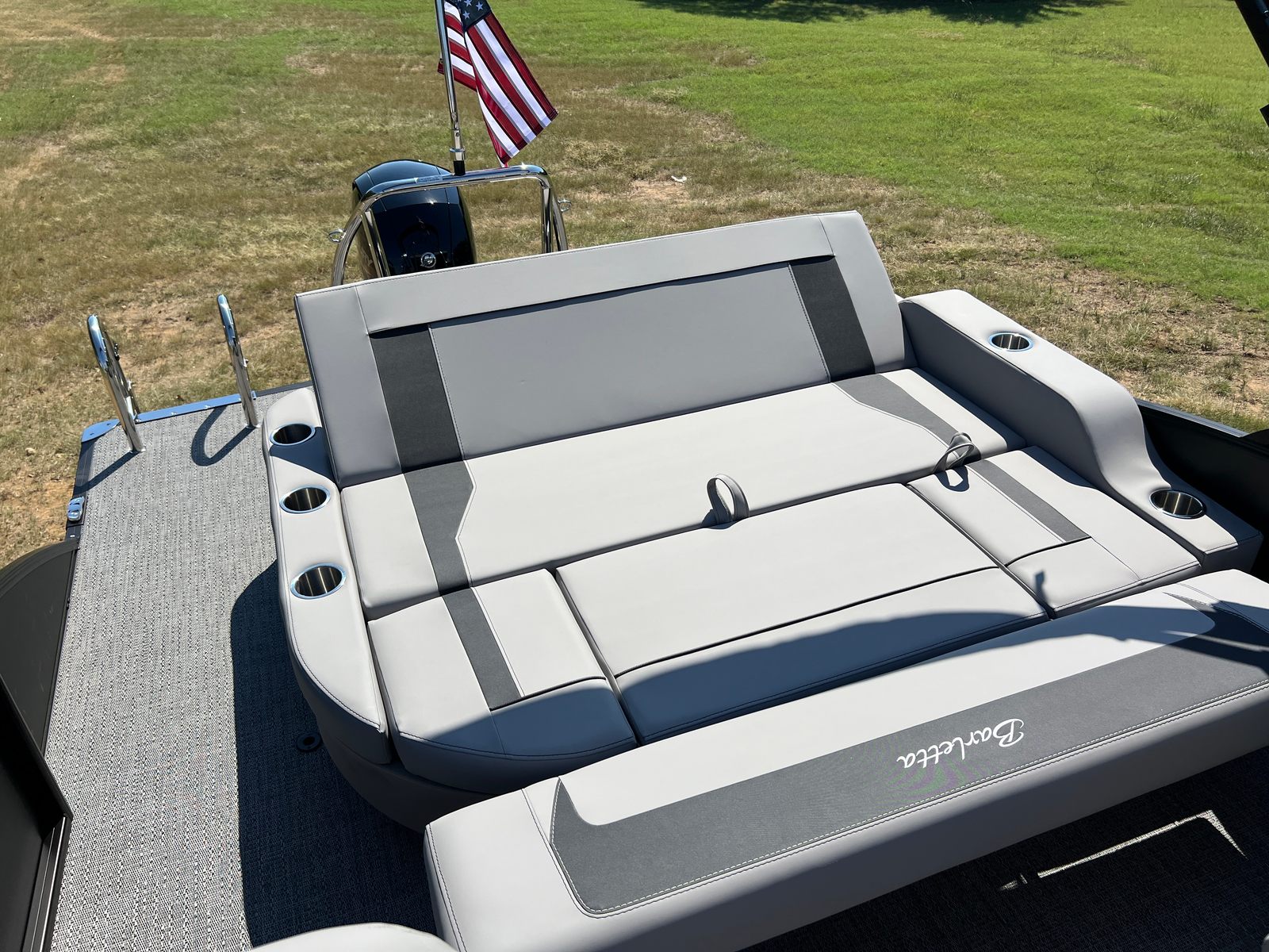 The 2026 Barletta Aria A22UC is loaded with features that set it apart from other pontoon boats for sale. The Railskin Color Aria in Matte Black, complemented by the Blackout Package Aria, gives this pontoon a striking and contemporary appearance that is sure to turn heads at the dock. The Tempest Gray furniture provides a sophisticated and inviting atmosphere, while the Amore Gray flooring is both stylish and easy to maintain. The in-floor midship storage offers a convenient solution for stowing away gear, water toys, and personal items, keeping the deck clutter-free and organized. A stainless steel flag pole with an American flag adds a patriotic touch, perfect for celebrating holidays or simply showing your pride on the water.