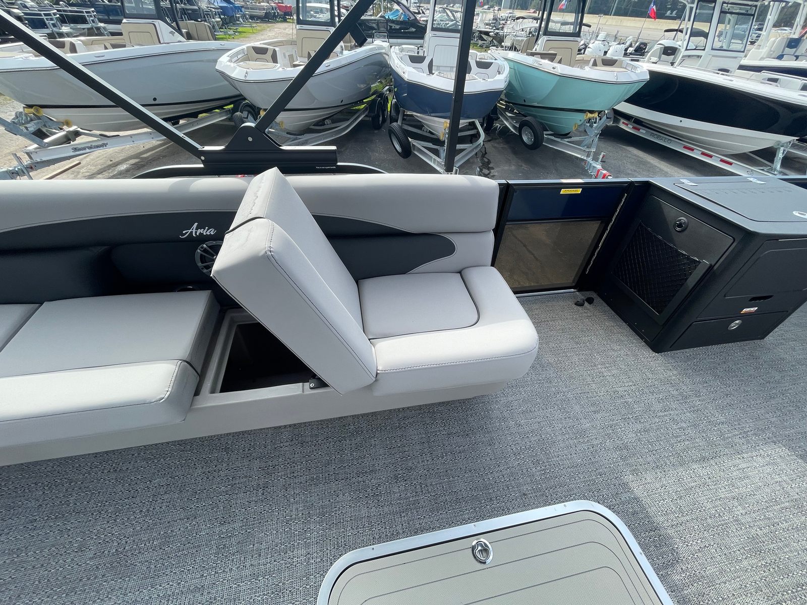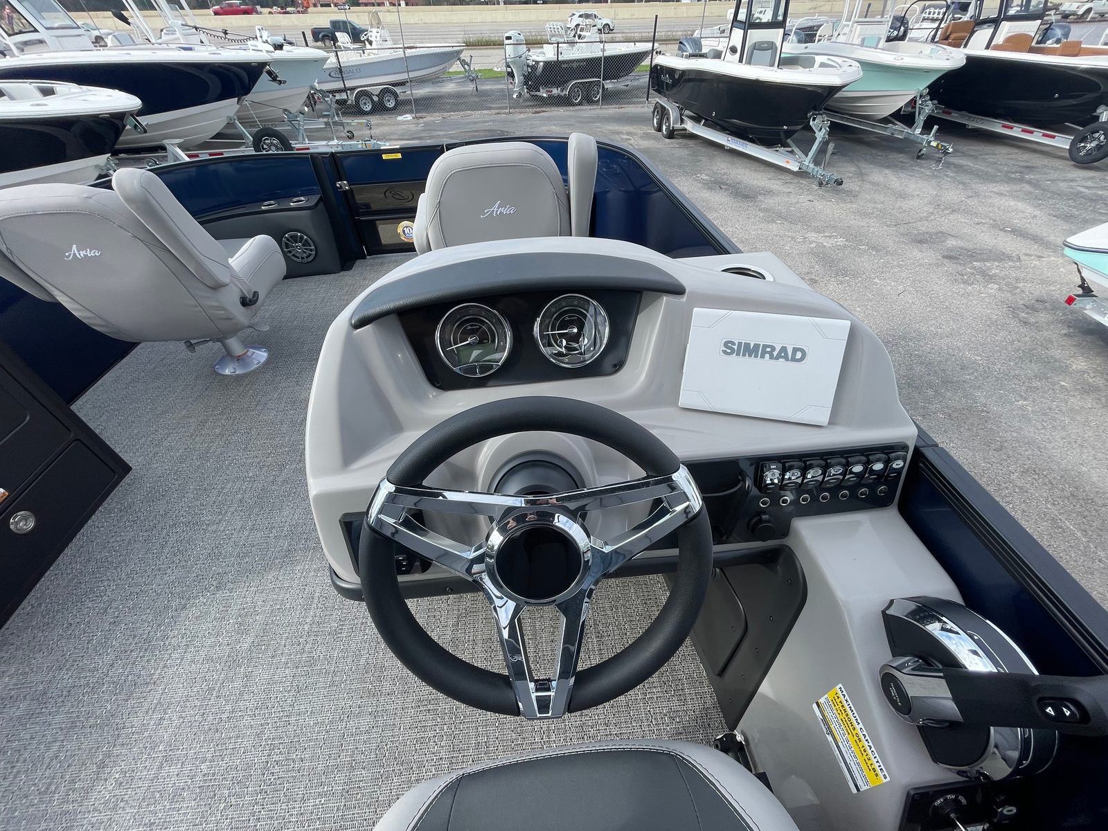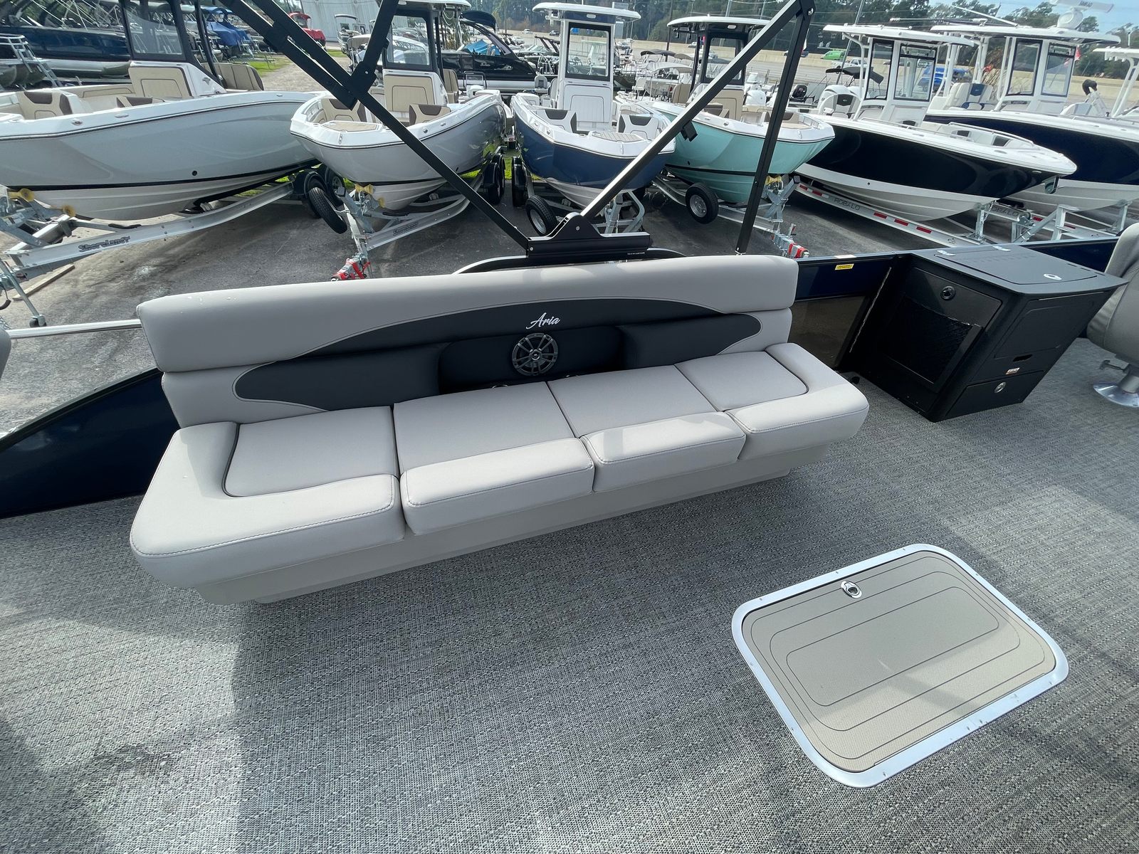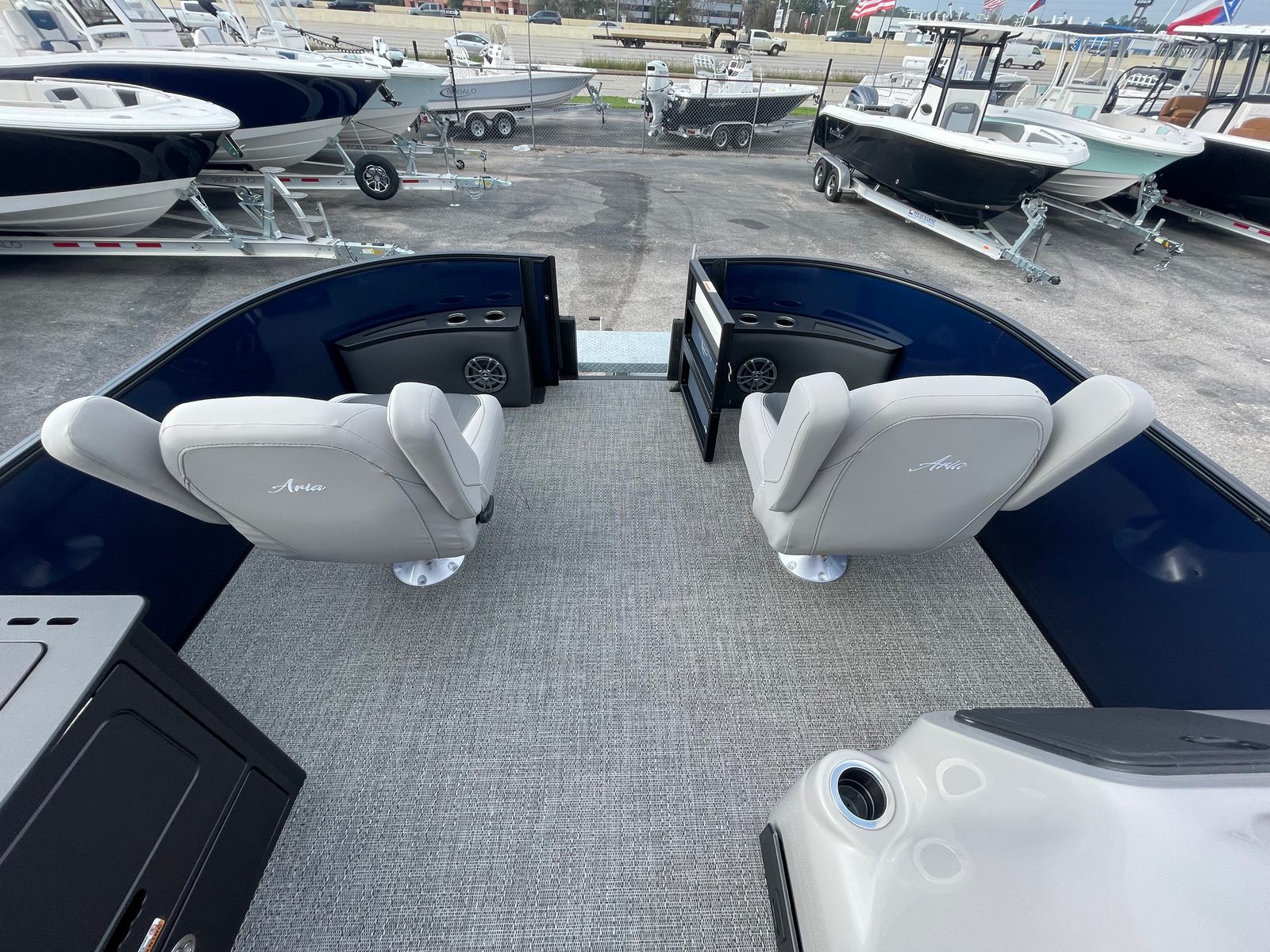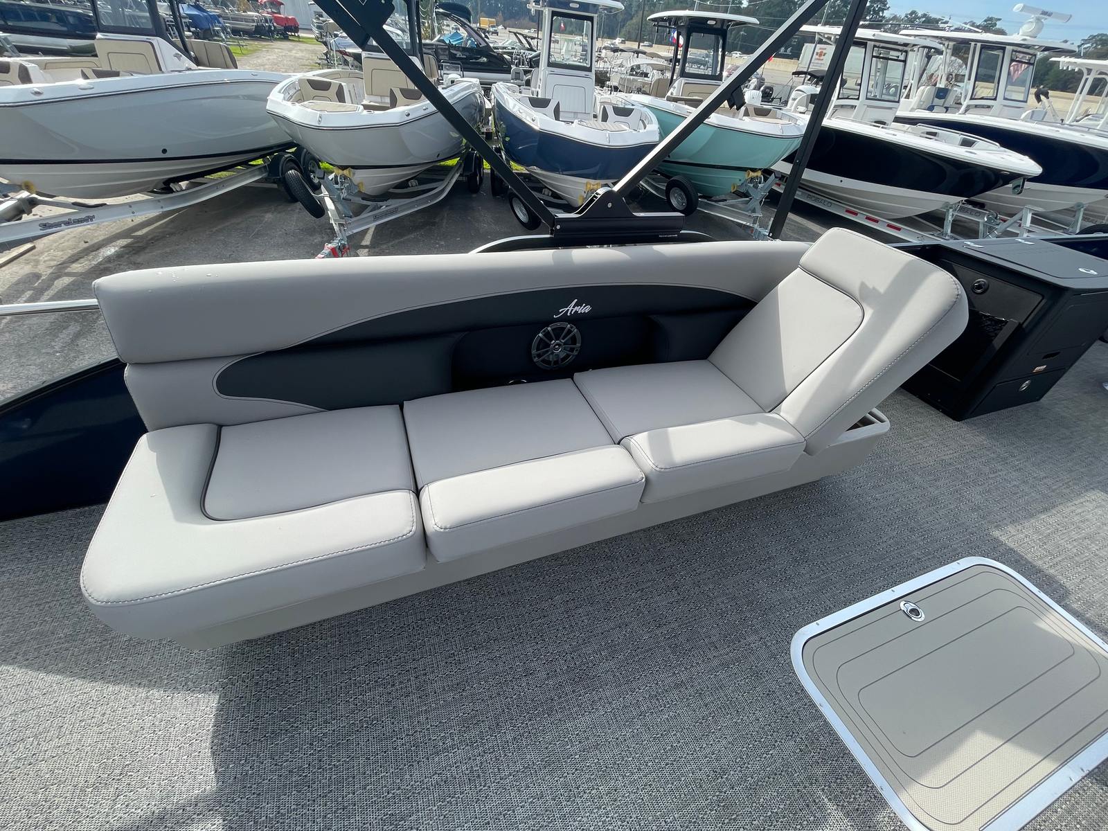 The Barletta Aria A24F is loaded with premium features designed to elevate your boating experience. The Simrad 7 G07 XSE helm puts advanced navigation and control at your fingertips, ensuring you stay on course and in command at all times. The in-floor midship storage offers ample space for stowing gear, water toys, and personal belongings, keeping the deck clutter-free and organized. The stainless steel flag pole with an American flag adds a touch of patriotic flair, making your boat stand out on the water.The interior is thoughtfully appointed with Tempest Gray furniture, providing plush seating and a modern aesthetic. The Amore Gray flooring is not only stylish but also durable and easy to maintain, ensuring your pontoon remains looking its best season after season. The Blue Sapphire Railskin with White Opal accent delivers a striking visual appeal, while the Blackout Package Aria adds a touch of sophistication and exclusivity.