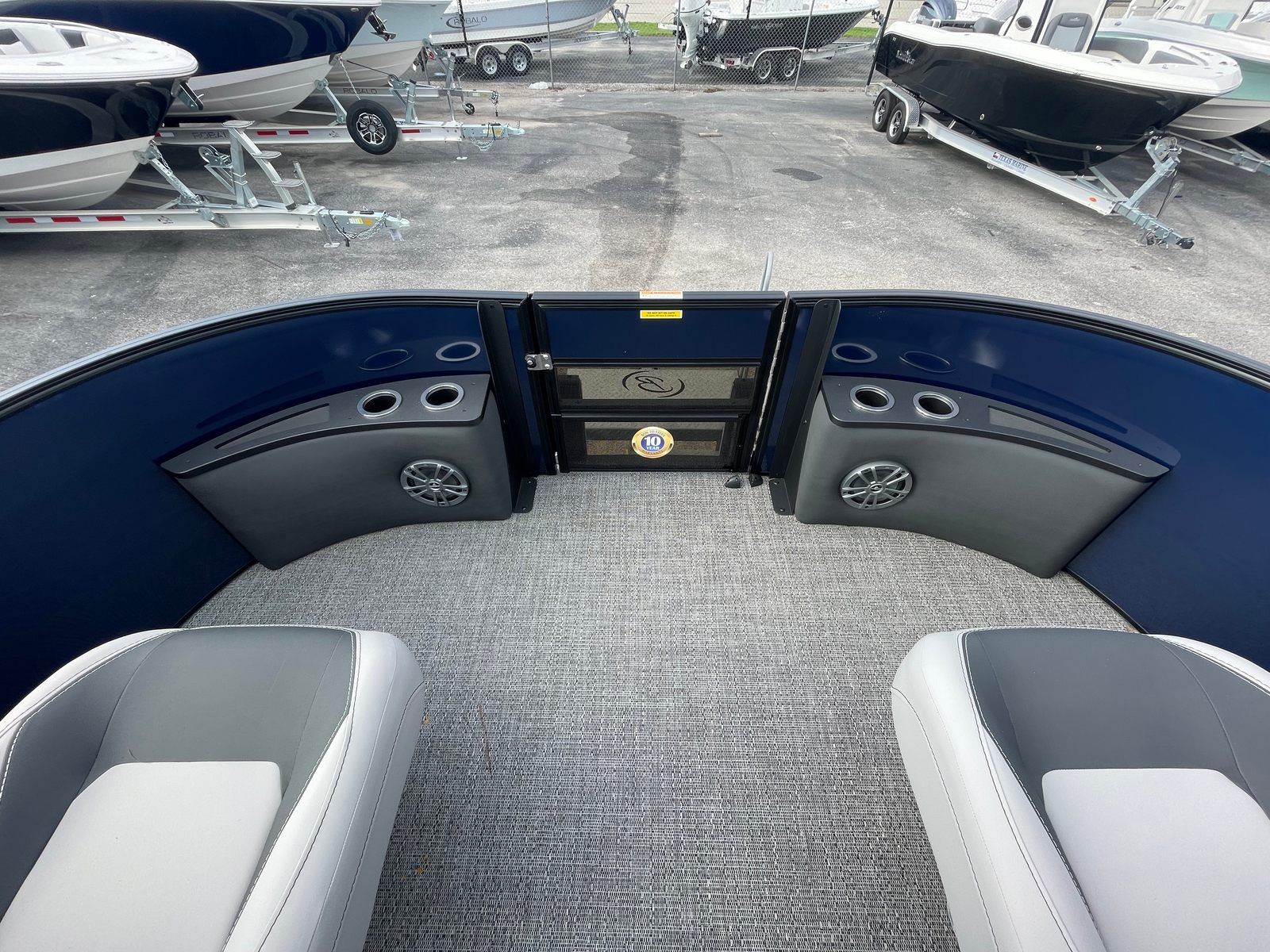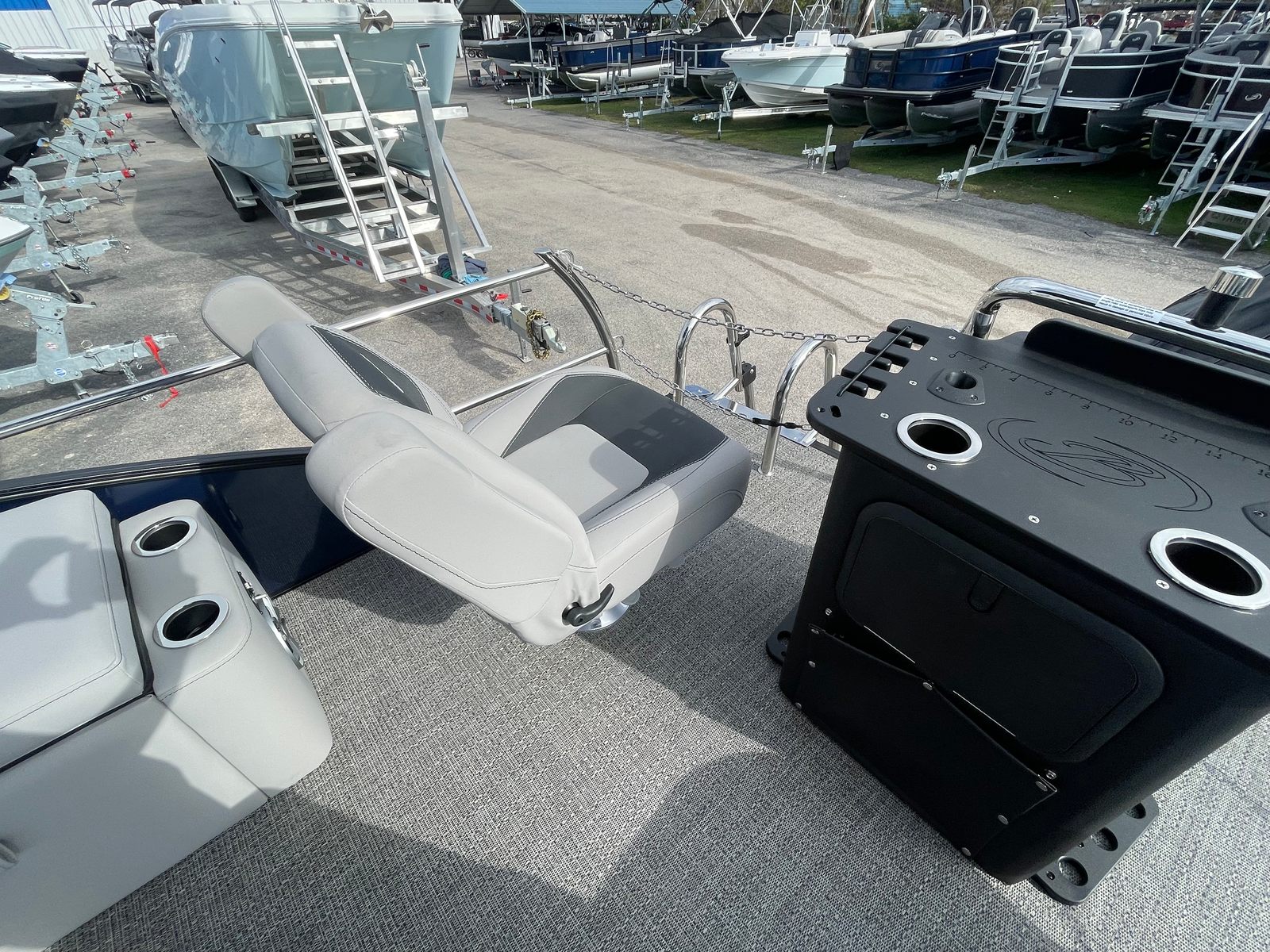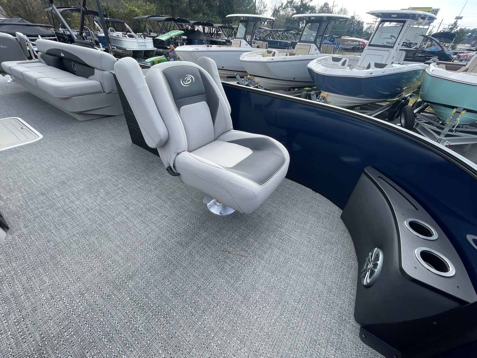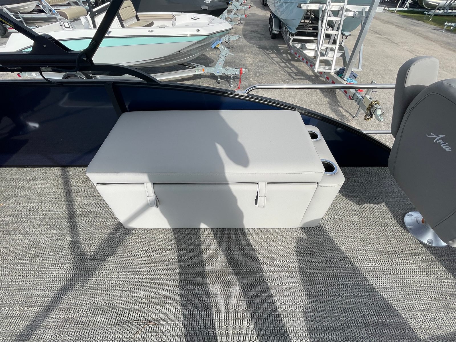 The Barletta Aria A24F is loaded with premium features designed to elevate your boating experience. The Simrad 7 G07 XSE helm puts advanced navigation and control at your fingertips, ensuring you stay on course and in command at all times. The in-floor midship storage offers ample space for stowing gear, water toys, and personal belongings, keeping the deck clutter-free and organized. The stainless steel flag pole with an American flag adds a touch of patriotic flair, making your boat stand out on the water.The interior is thoughtfully appointed with Tempest Gray furniture, providing plush seating and a modern aesthetic. The Amore Gray flooring is not only stylish but also durable and easy to maintain, ensuring your pontoon remains looking its best season after season. The Blue Sapphire Railskin with White Opal accent delivers a striking visual appeal, while the Blackout Package Aria adds a touch of sophistication and exclusivity.