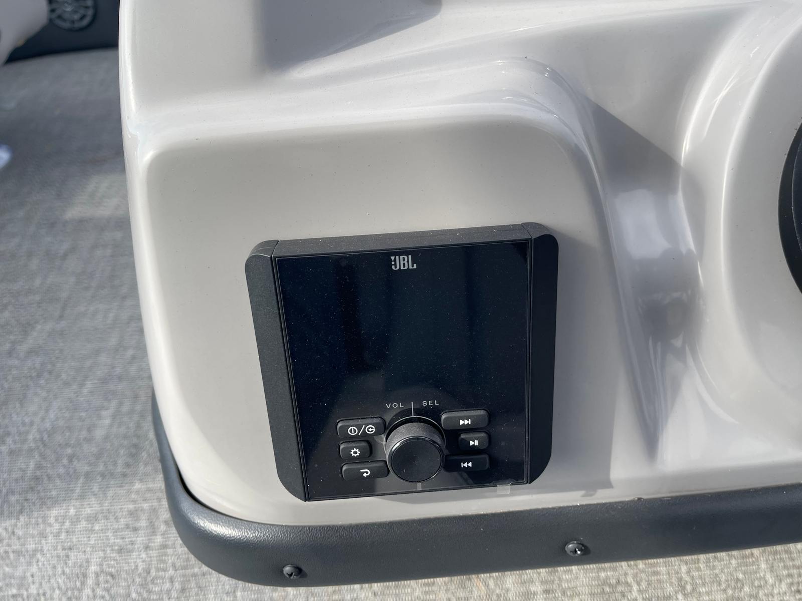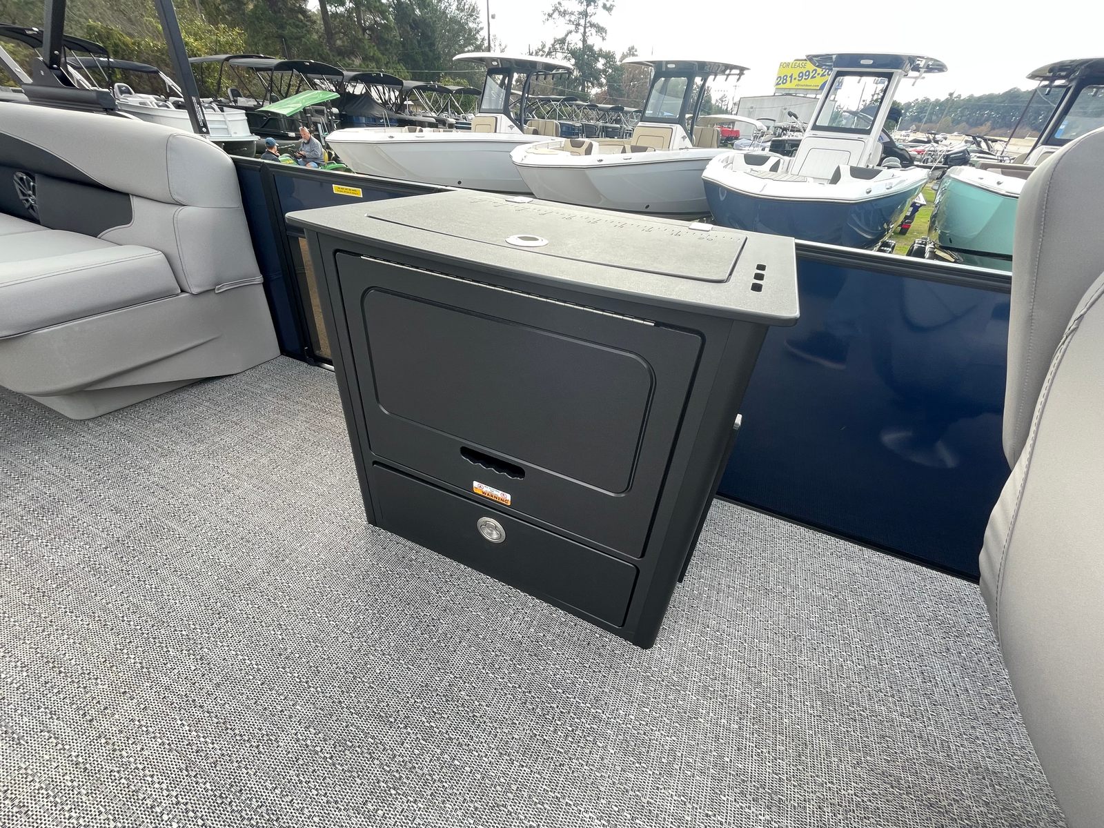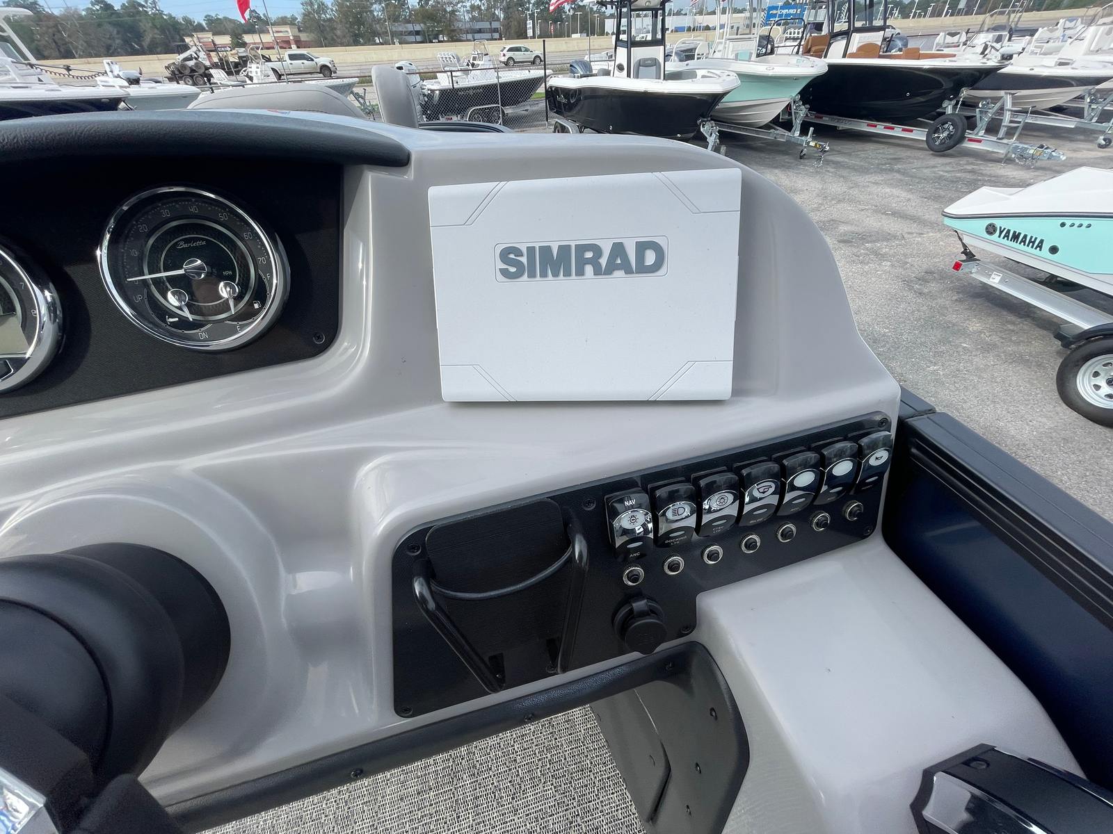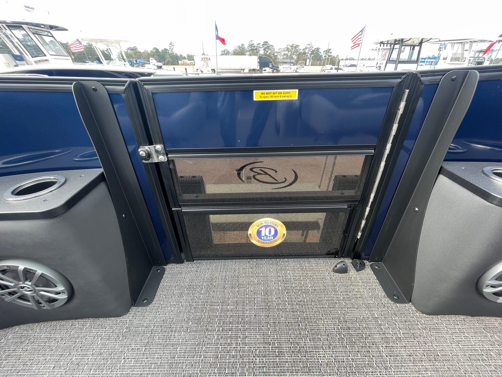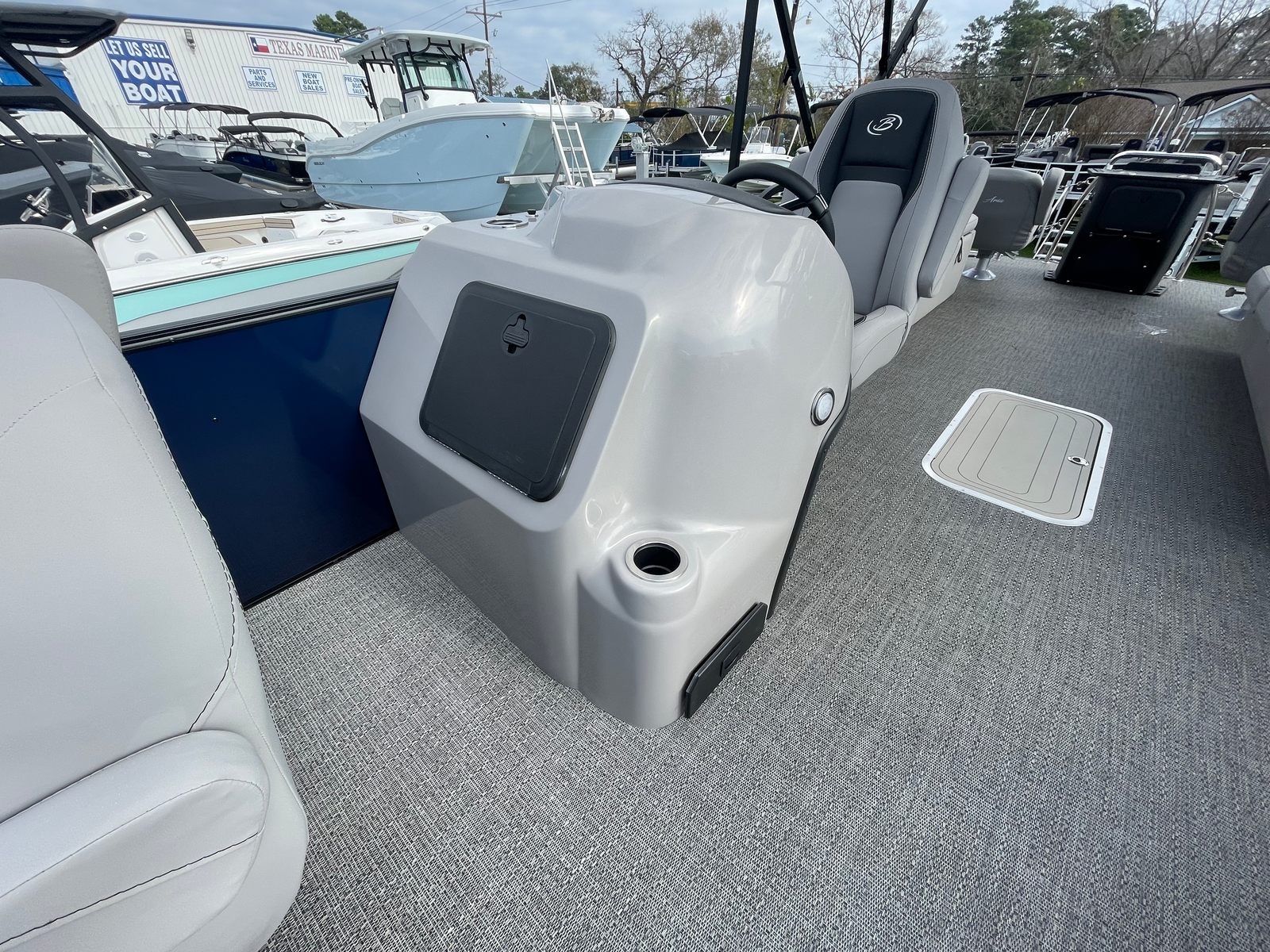 The Barletta Aria A24F is loaded with premium features designed to elevate your boating experience. The Simrad 7 G07 XSE helm puts advanced navigation and control at your fingertips, ensuring you stay on course and in command at all times. The in-floor midship storage offers ample space for stowing gear, water toys, and personal belongings, keeping the deck clutter-free and organized. The stainless steel flag pole with an American flag adds a touch of patriotic flair, making your boat stand out on the water.The interior is thoughtfully appointed with Tempest Gray furniture, providing plush seating and a modern aesthetic. The Amore Gray flooring is not only stylish but also durable and easy to maintain, ensuring your pontoon remains looking its best season after season. The Blue Sapphire Railskin with White Opal accent delivers a striking visual appeal, while the Blackout Package Aria adds a touch of sophistication and exclusivity.
