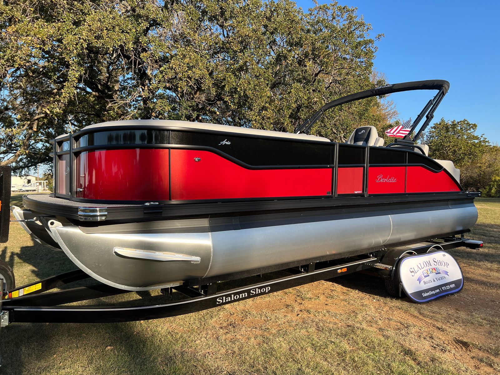 Step aboard the Aria A24UC and discover a world of premium features designed for comfort and convenience. The Tempest Gray furniture offers plush seating and a modern aesthetic, while the Amore Gray flooring provides a stylish and durable foundation for all your on-board activities. The in-floor midship storage is perfect for stowing away gear, water toys, or picnic essentials, keeping the deck clutter-free and organized. The stainless steel flag pole with an American flag adds a patriotic touch, making this pontoon boat a standout wherever you go.The Railskin Color Aria in Red Garnet, paired with the Black Diamond accent and Blackout Package Aria, creates a bold and sophisticated look that is sure to impress. Every detail, from the premium upholstery to the thoughtful storage solutions, is designed to enhance your boating experience and provide lasting value.