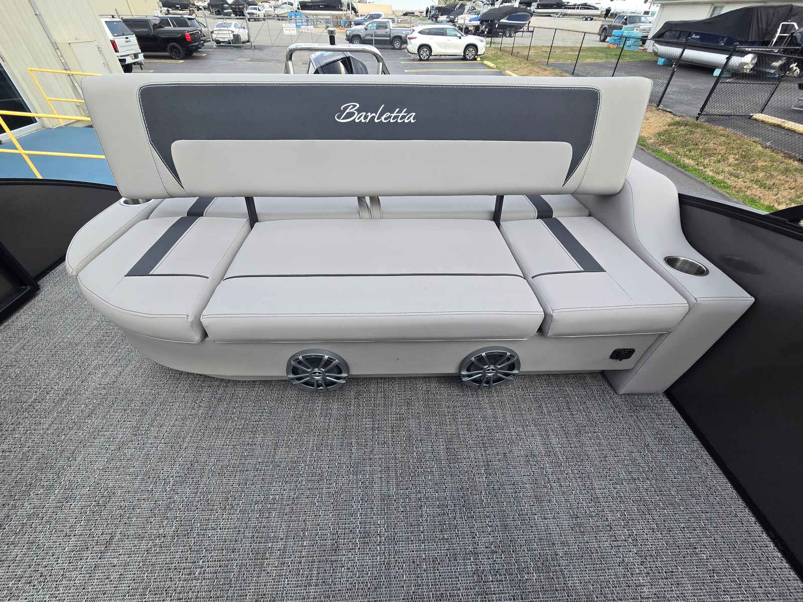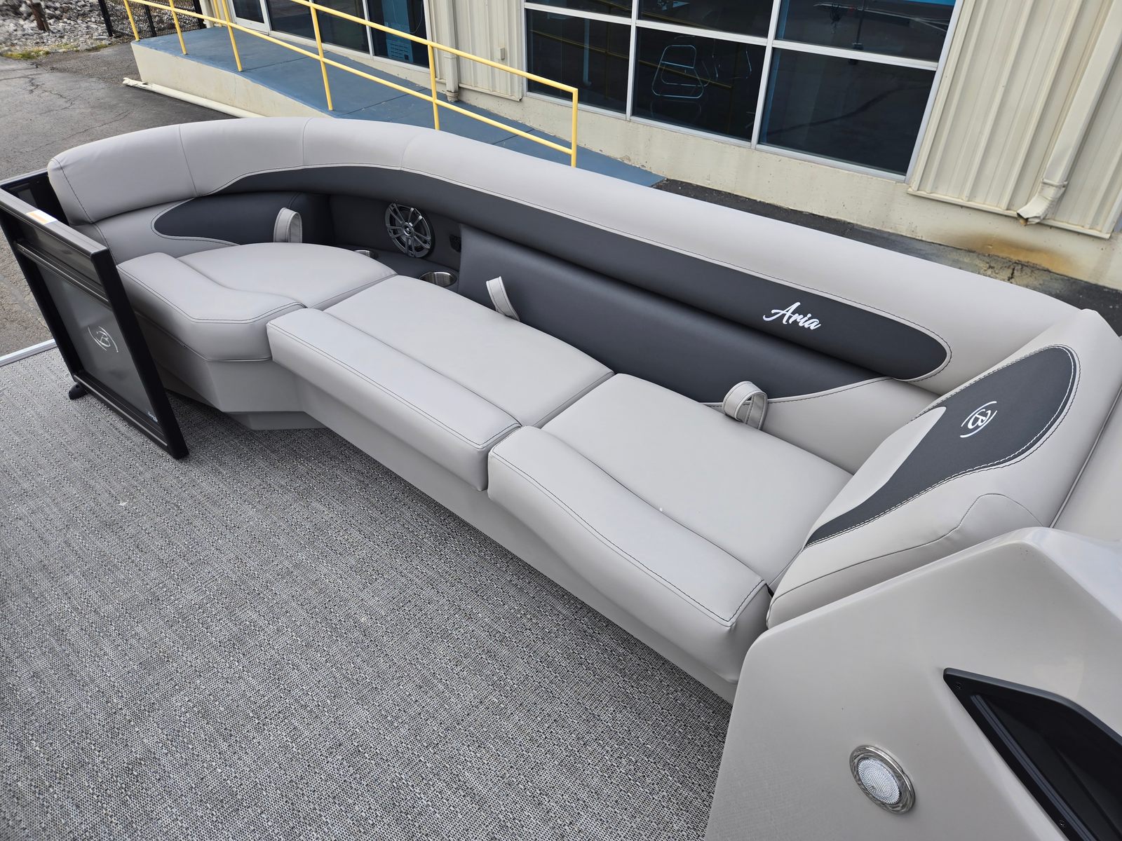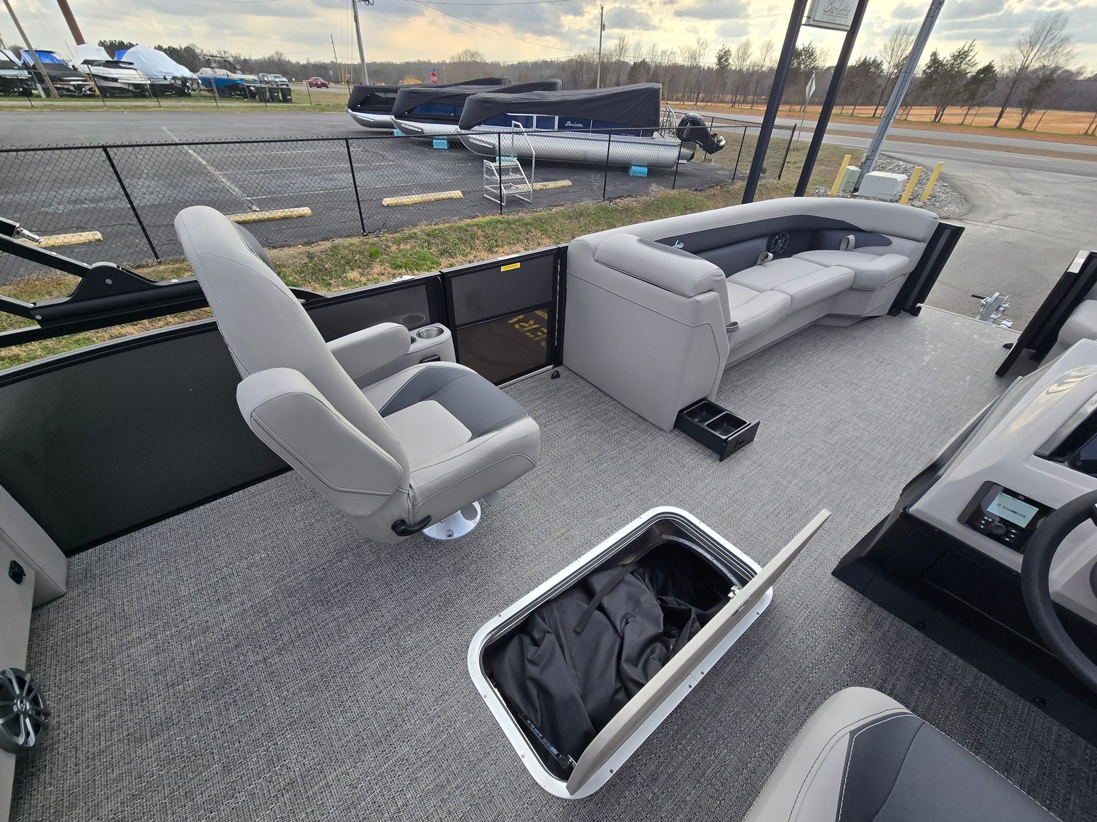 The 2026 Barletta Aria A24UC is loaded with premium features designed to elevate your boating experience. The Railskin Color Aria in Gray Moonstone and the Blackout Package Aria create a striking visual impression, while the Tempest Gray furniture and Amore Gray flooring provide a sophisticated and inviting atmosphere. The Triple Toon Package Aria enhances stability and ride quality, making this pontoon boat ideal for both leisurely cruises and more spirited adventures.One of the standout features is the in-floor midship storage, which is made possible by the Triple Toon configuration. This spacious compartment is perfect for stowing water toys, life jackets, and other essentials, keeping the deck clutter-free and organized. The stainless steel flag pole with an American flag adds a patriotic touch, making the Aria A24UC a true head-turner at any marina or dock.