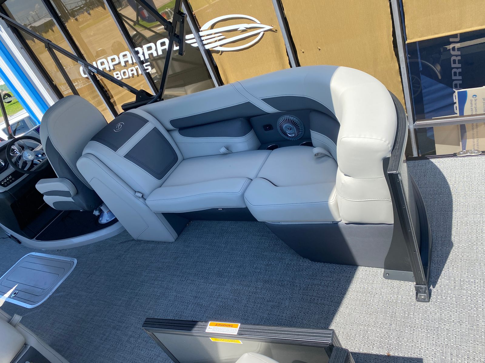 The Barletta Cabrio C22QC is packed with premium features that set it apart from other pontoon boats for sale. The triple toon package not only boosts performance but also provides convenient midship storage, making it easy to stow away gear and essentials for a clutter-free deck. The Blackout Package Cabrio railskin adds a touch of elegance and modern flair, while the Metal Jacket Protectant on the exterior ensures your investment stays looking pristine season after season.Enjoy shade and comfort with the double bimini setup, including an additional power bimini for effortless adjustment. Inside, you’ll find a thoughtfully designed table, pedestal, and base equipped with Yeti-ready cupholders, perfect for keeping refreshments close at hand during social gatherings. The helm features a Simrad 7 G07 XSR chartplotter/multifunction display, offering advanced navigation and control at your fingertips. Every detail, from the flooring to the railskin color, has been chosen to enhance your boating lifestyle.