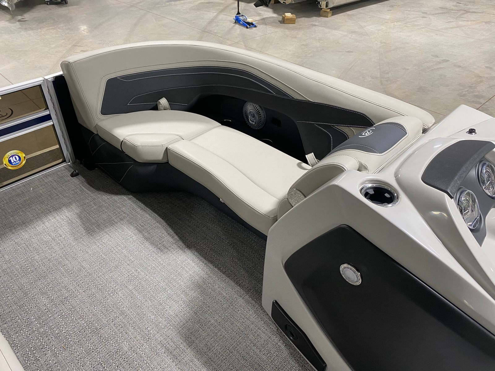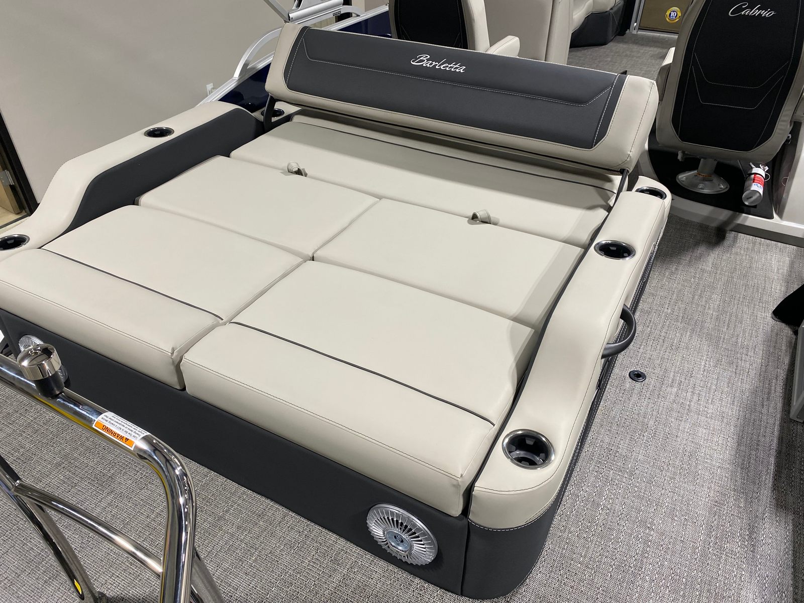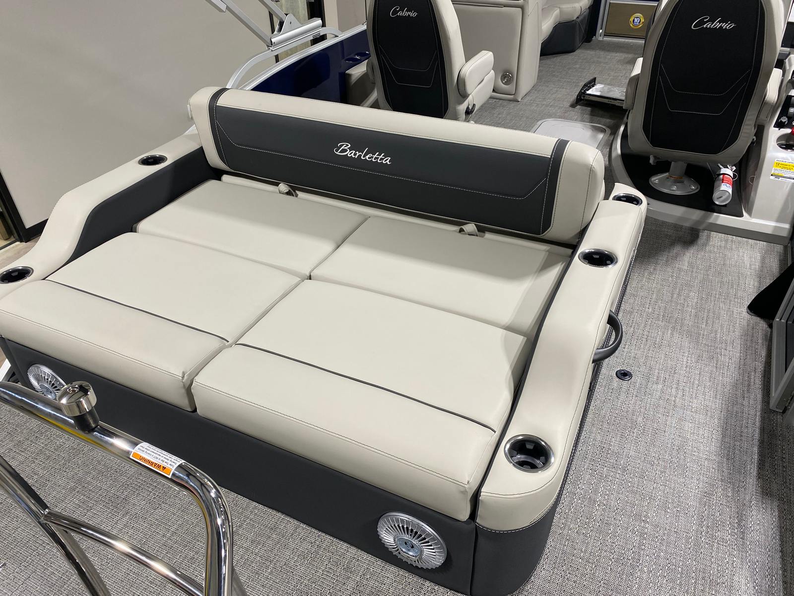 This pontoon boat is loaded with features that elevate your boating experience. The Blue Sapphire Railskin color gives the Cabrio C22UC a striking, contemporary look, while the Marquesan Gray with Onyx furniture offers plush, supportive seating for all-day comfort. The Amore Gray flooring is not only stylish but also durable and easy to maintain, making it ideal for active days on the water.The triple toon package with midship storage provides additional buoyancy and storage capacity, ensuring you have plenty of room for gear, water toys, and personal items. The stainless steel flag pole with an American flag adds a patriotic touch, perfect for holiday outings or simply showing your pride on the water. Exterior white underdeck and underwater lighting, along with the interior RGB lighting package, create a captivating ambiance for evening cruises and social gatherings, allowing you to set the mood with customizable colors and effects.