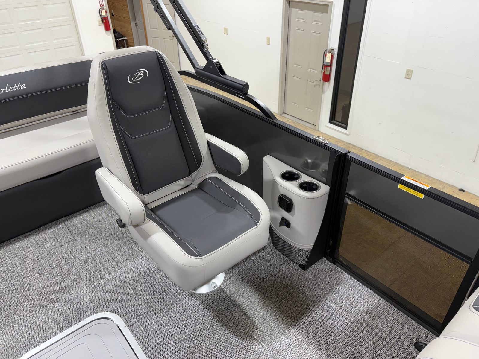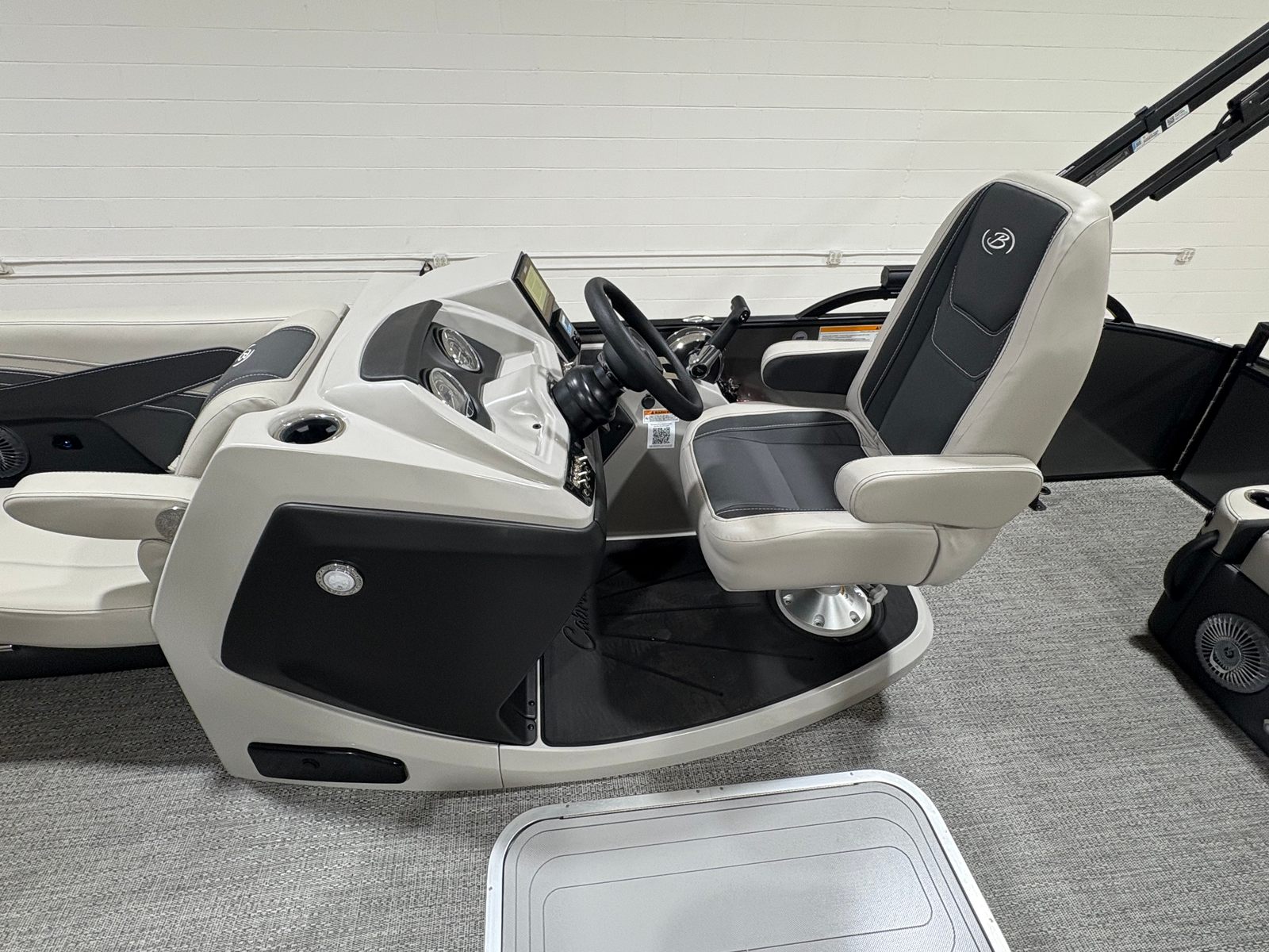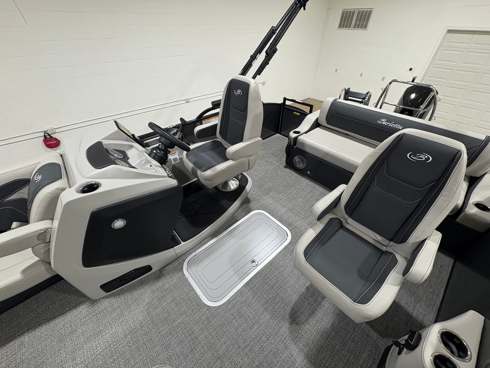 The Barletta Cabrio C22UC is packed with special features that set it apart from other pontoon boats for sale. The interior RGB lighting package creates a vibrant and customizable atmosphere, perfect for evening gatherings or celebrations. Exterior lighting, including white underdeck and underwater illumination, adds a touch of elegance and ensures visibility after sunset. The stainless steel flag pole with an American flag is a proud statement of style and patriotism.Inside, the Marquesan Gray with Onyx furniture offers both comfort and sophistication, complemented by Amore Gray flooring that is both stylish and easy to maintain. The blackout package on the railskin provides a modern, sleek look, while the matte black railskin color adds a bold finishing touch. At the helm, the Simrad 7" G07 XSR chartplotter/multifunction display offers advanced navigation and control, making every journey safe and enjoyable.