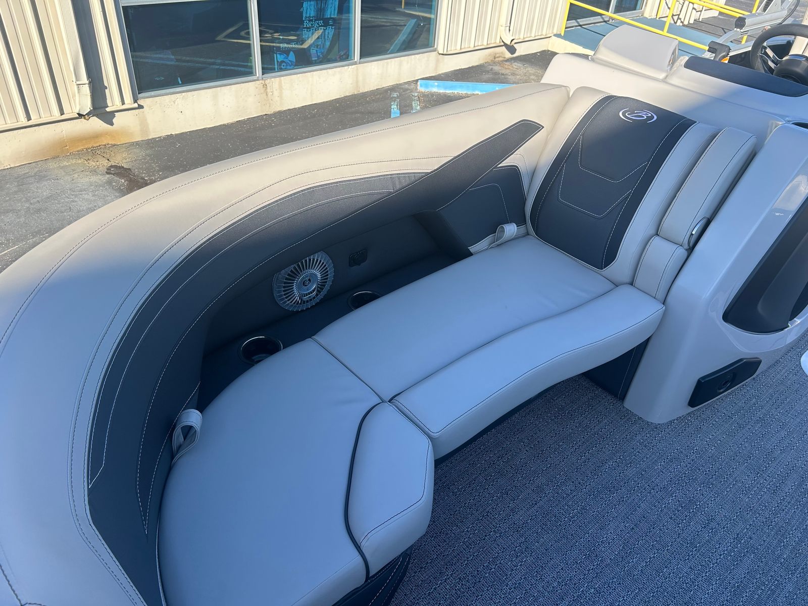 The Barletta Cabrio C22UC is loaded with features that elevate your boating experience. The Triple Toon Package with midship storage maximizes stability and buoyancy, allowing for a smoother ride even in choppier conditions. The midship storage compartment provides ample space for stowing gear, water toys, and essentials, keeping the deck clutter-free and organized.The interior of the Cabrio C22UC is a showcase of luxury and functionality. The Marquesan Gray with Onyx furniture offers plush seating and a contemporary look, while the Amore Gray flooring is both stylish and easy to maintain. The interior RGB lighting package creates a customizable ambiance, perfect for evening cruises or entertaining guests after sunset.At the helm, the Simrad 7" G07 XSR Chartplotter/Multifunction Display puts advanced navigation and system controls at your fingertips. This intuitive display allows you to monitor your route, track your speed, and access vital boat information with ease, ensuring a safe and enjoyable journey every time.The exterior is just as impressive, featuring a stainless steel flag pole with an American flag, adding a patriotic touch and a sense of pride to your boating adventures.