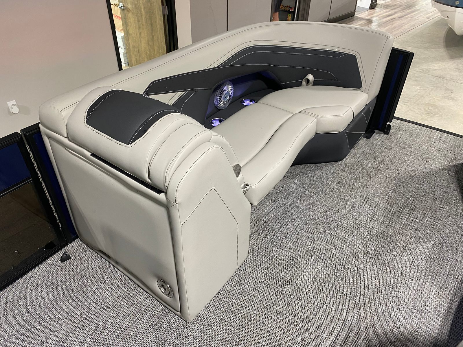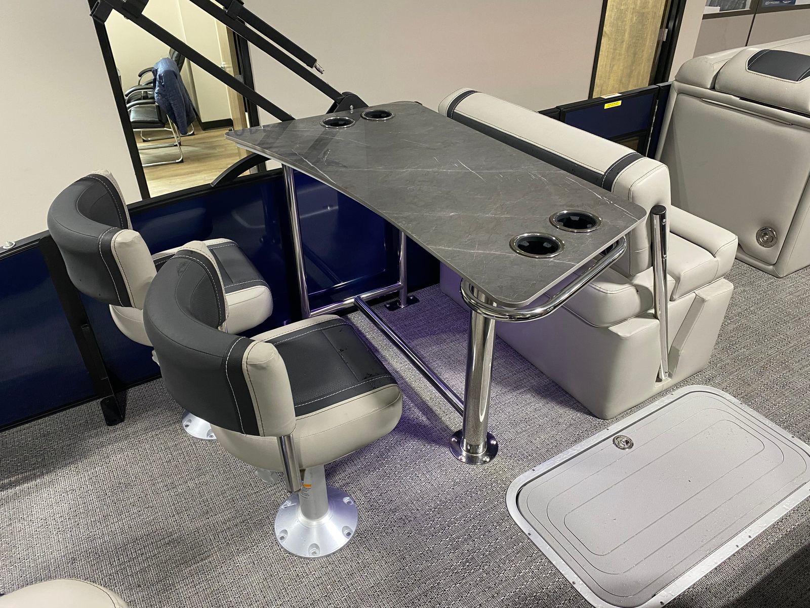 The 2026 Barletta Cabrio C24UE is a standout in the world of pontoons, offering a sleek profile and a generous length of just over 25 feet. This pontoon boat is designed to deliver both style and substance, making it a top contender for those seeking a new pontoon boat for sale. The Cabrio C24UE’s striking Gray Moonstone railskin color, accented by Blue Sapphire, ensures you’ll turn heads at every marina and on every lake. The Blackout Package Cabrio adds a bold, modern touch, while the Marquesan Gray with Onyx furniture and Amore Gray flooring create an inviting and upscale atmosphere onboard.