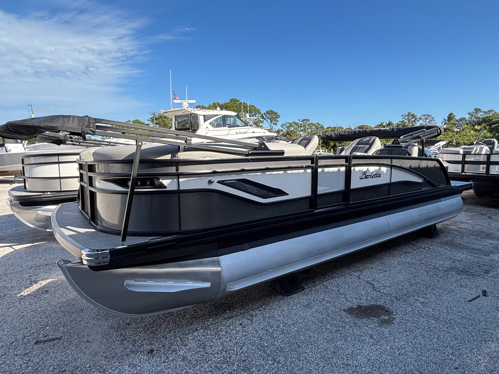 The 2025 Barletta Corsa 23UC is more than just a pontoon boat for sale; it is an invitation to elevate your boating lifestyle. With its powerful 250-horsepower engine, luxurious Soft Touch Marquesan Gray furniture, striking Gray Moonstone and White Opal exterior, Amore Gray flooring, adjustable captain’s chair, premium sound system, exterior lighting, double bimini, anchor storage, and Blackout Package Corsa, this Barletta boat for sale is designed to impress and delight.If you are ready to experience the perfect blend of performance, comfort, and style, the Barletta Corsa 23UC is waiting to make your boating dreams a reality. Contact your local dealer today to learn more about this exceptional pontoon and take the first step toward unforgettable adventures on the water.