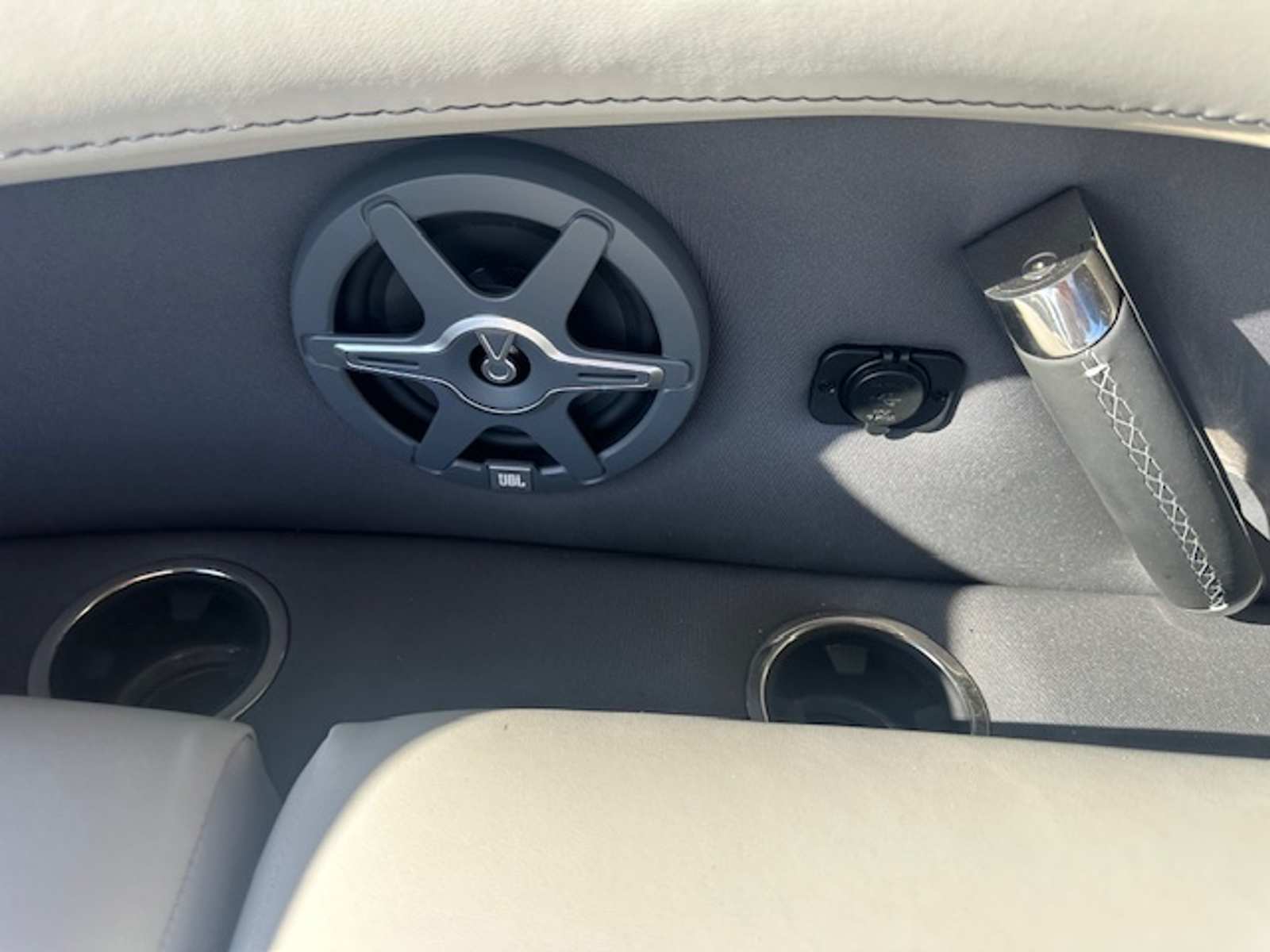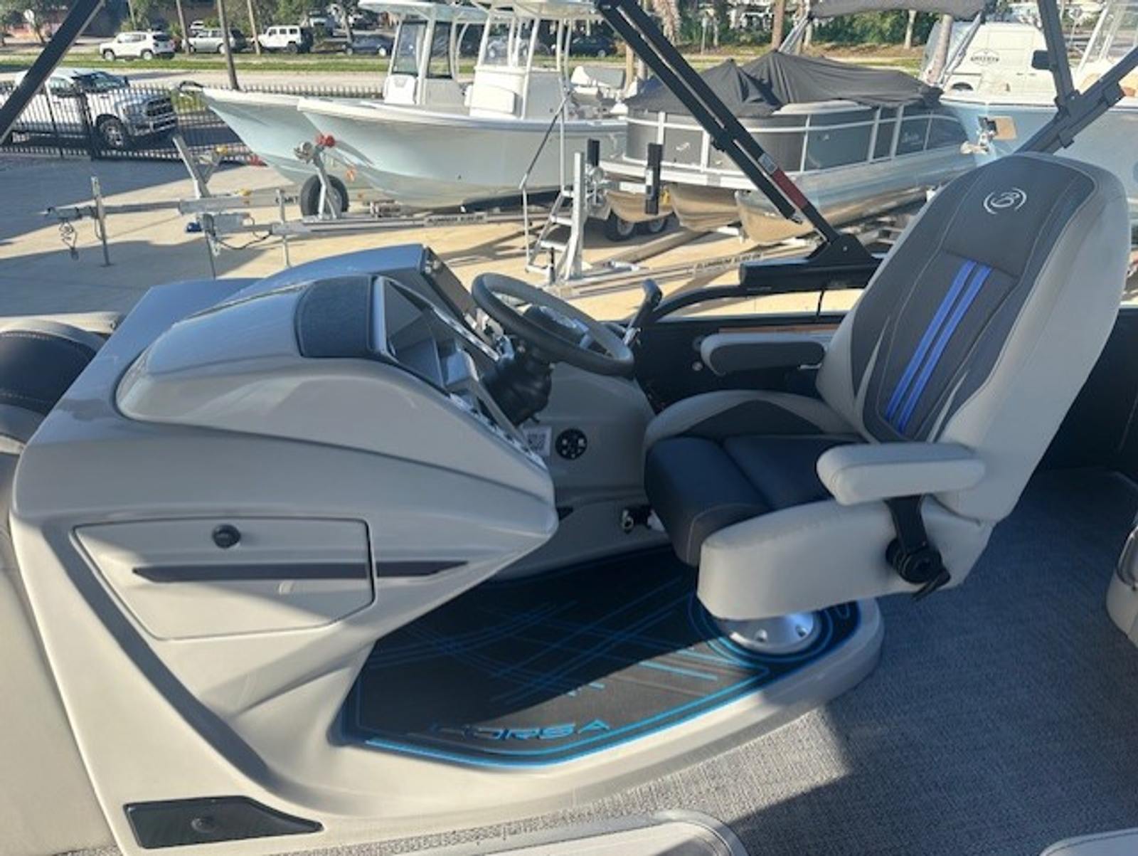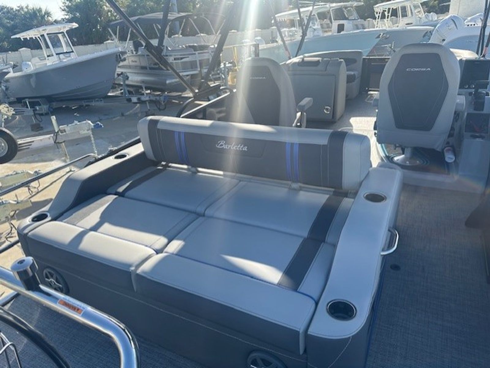The Barletta Corsa 23UC is loaded with premium features that elevate your boating experience. The double bimini setup, including an additional power bimini, provides versatile shade options, so you can enjoy sunny days without worrying about overheating. The 25-inch transom enhances stability and ride comfort, while the anchor storage at the bow gate offers a convenient spot to stow your anchor, keeping the deck clutter-free.Safety is a top priority, with stainless steel safety stanchions and chains ensuring secure movement around the boat. The Blue Sapphire Railskin color gives the exterior a striking, modern look, complemented by white underdeck and underwater lighting that creates a captivating ambiance during evening cruises. The Amore Gray flooring adds a touch of sophistication and is designed for durability and easy maintenance, making it ideal for active boaters.