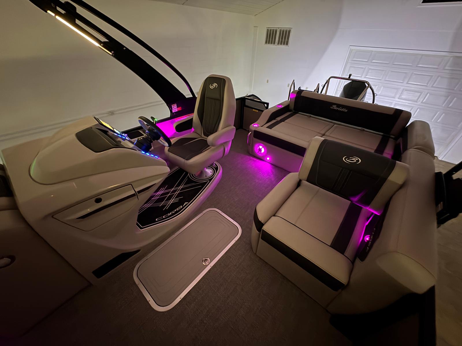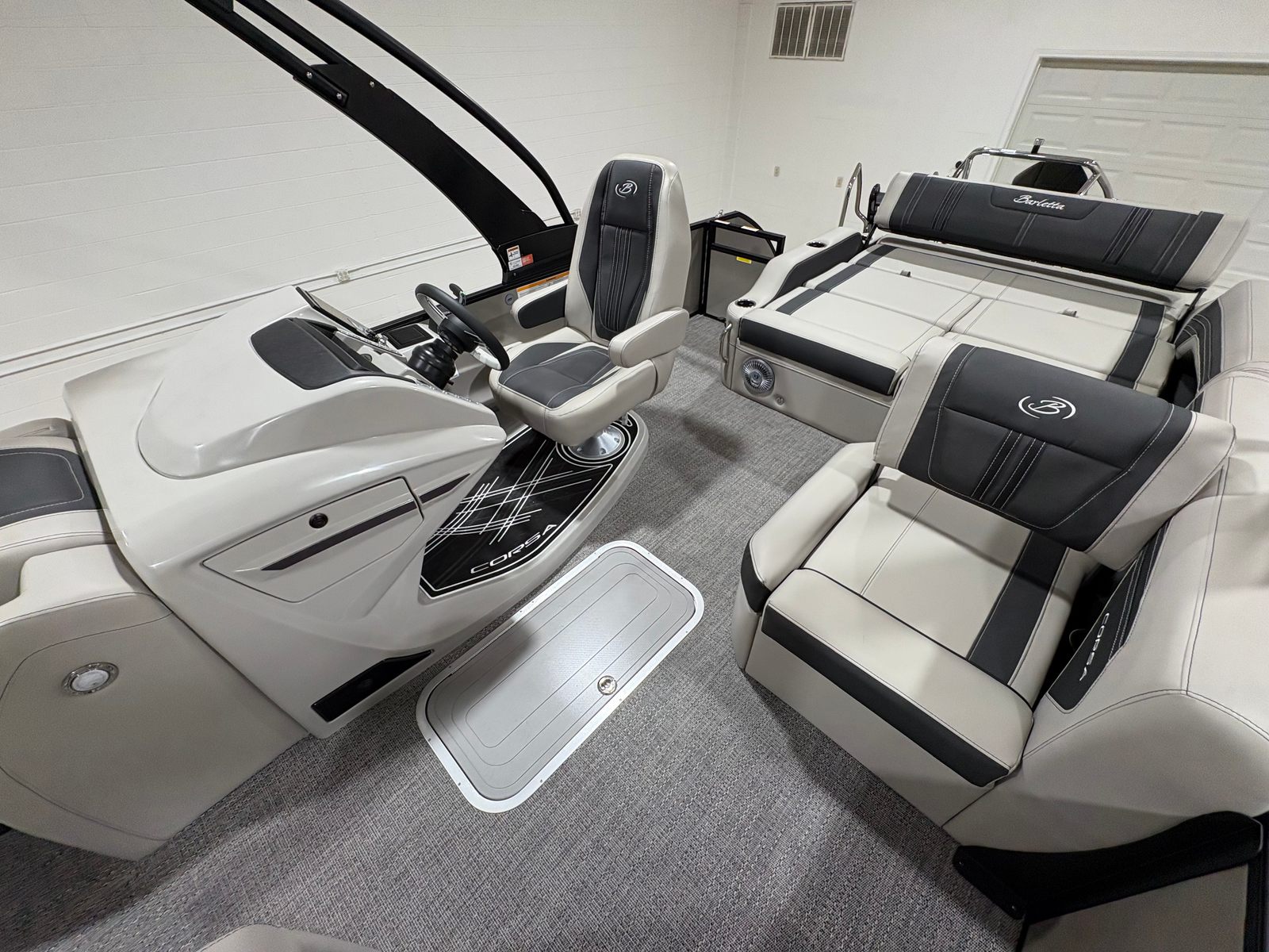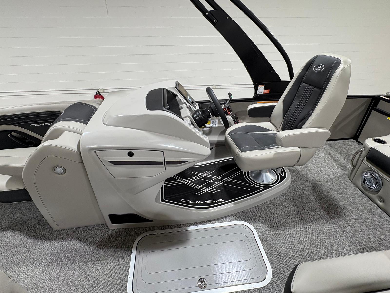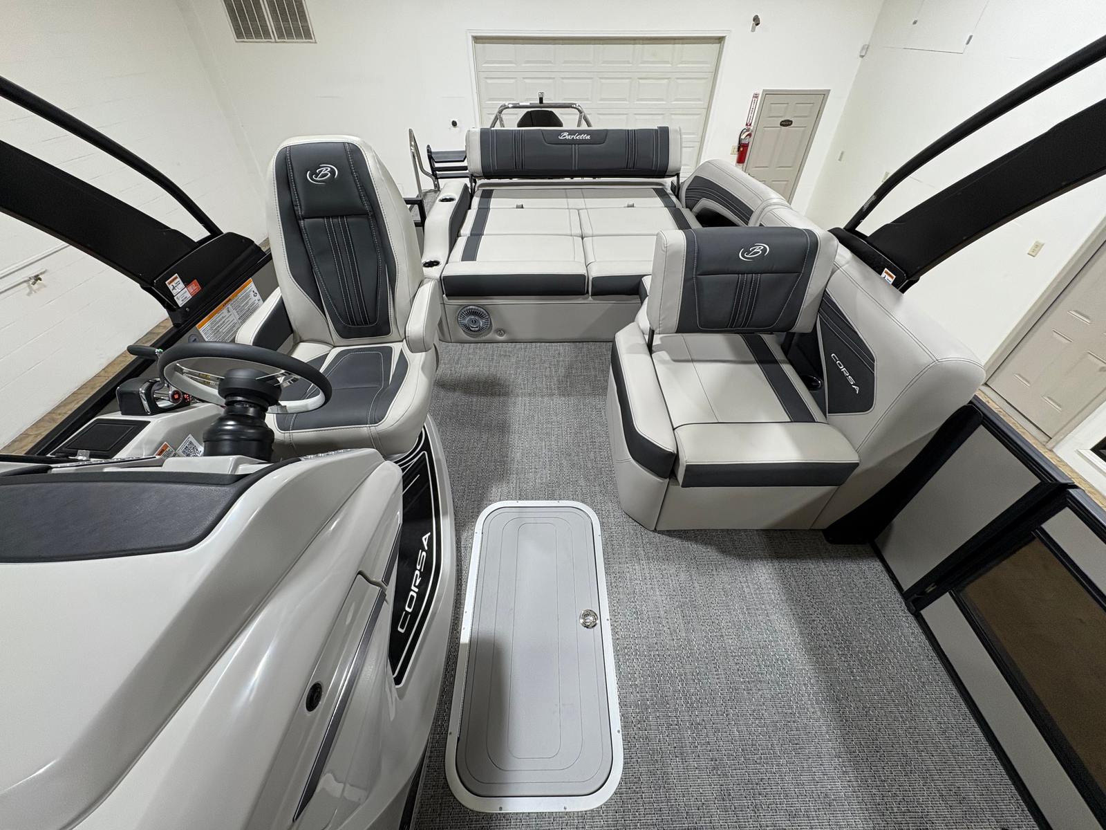 The 2026 Barletta Corsa 25U is loaded with premium features that set it apart from other pontoon boats for sale. The exterior boasts a sophisticated Railskin color in Champagne, complemented by a Gray Moonstone accent and the striking Blackout Package Corsa, giving the boat a modern and upscale appearance. The stainless steel flag pole with an American flag adds a touch of patriotic flair and elegance to your on-water adventures.Step aboard and you will be greeted by Soft Touch Marquesan Gray furniture with Carbon accents, offering plush comfort and a contemporary aesthetic. The Amore Gray flooring is both stylish and practical, providing a durable and easy-to-clean surface that stands up to the demands of active boating. The digital gauges keep you informed of all essential metrics, while the sport bimini (installed in place of the standard bimini) offers enhanced sun protection and a sporty look.
