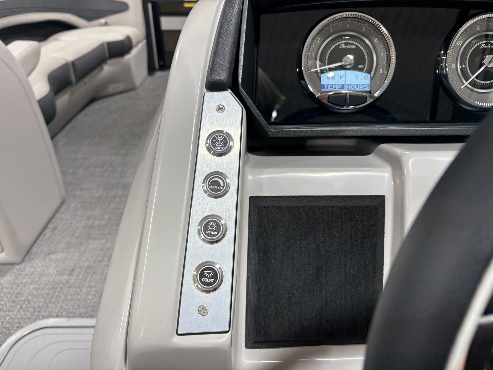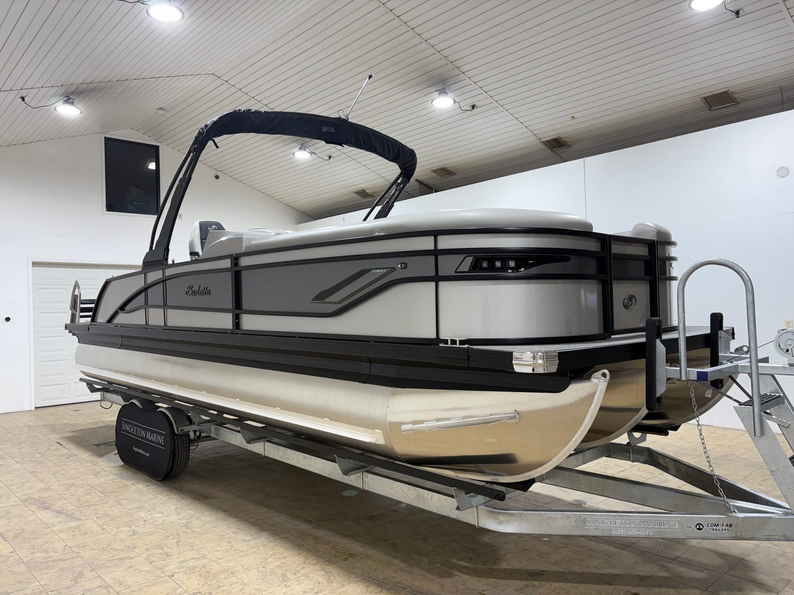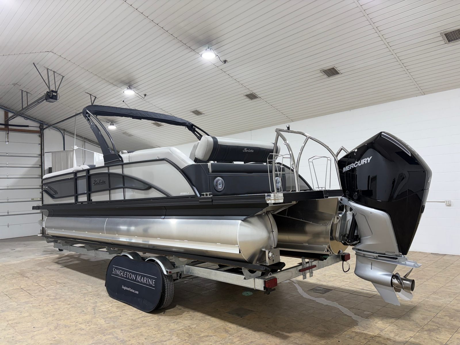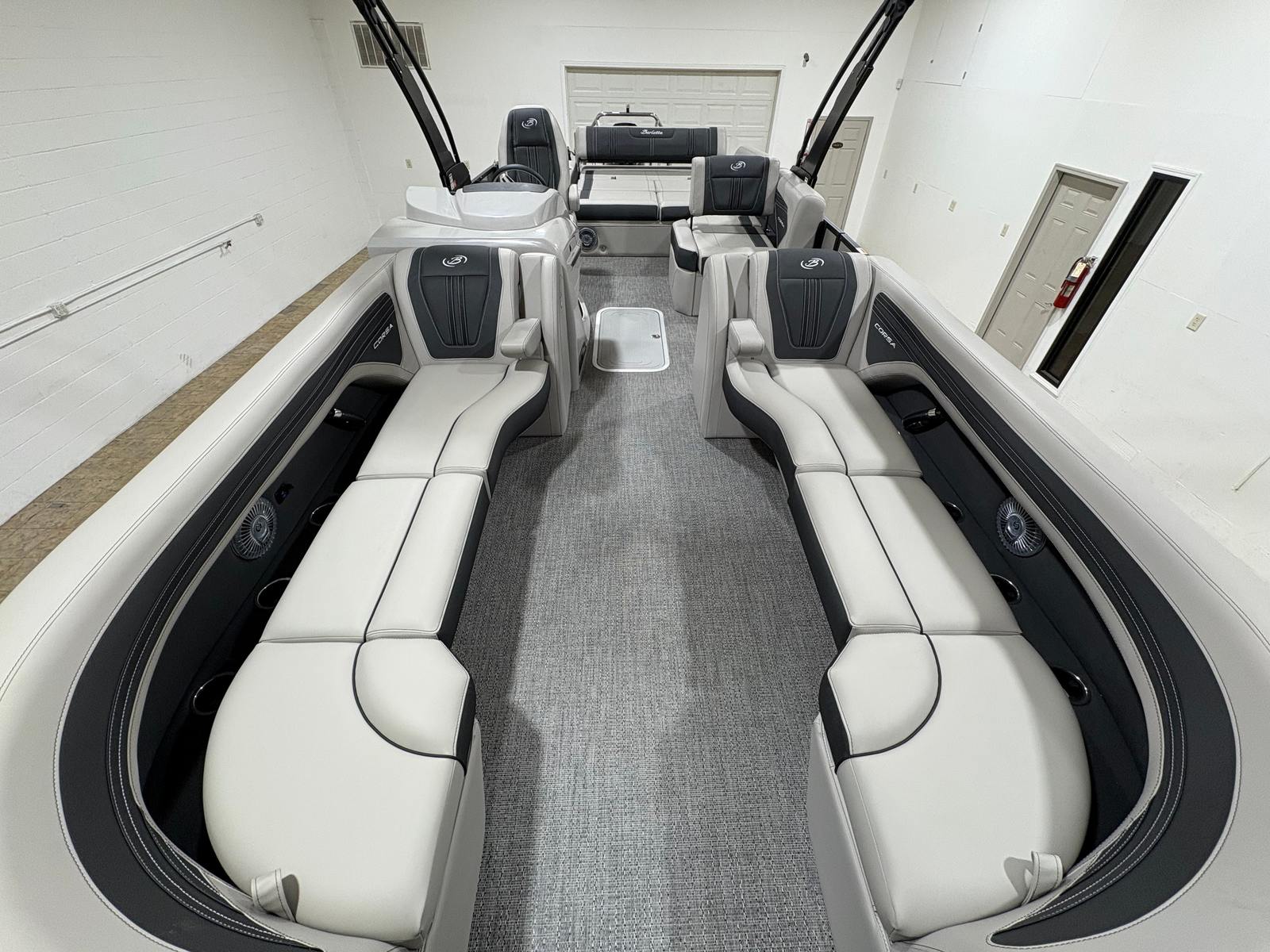 The 2026 Barletta Corsa 25U is loaded with premium features that set it apart from other pontoon boats for sale. The exterior boasts a sophisticated Railskin color in Champagne, complemented by a Gray Moonstone accent and the striking Blackout Package Corsa, giving the boat a modern and upscale appearance. The stainless steel flag pole with an American flag adds a touch of patriotic flair and elegance to your on-water adventures.Step aboard and you will be greeted by Soft Touch Marquesan Gray furniture with Carbon accents, offering plush comfort and a contemporary aesthetic. The Amore Gray flooring is both stylish and practical, providing a durable and easy-to-clean surface that stands up to the demands of active boating. The digital gauges keep you informed of all essential metrics, while the sport bimini (installed in place of the standard bimini) offers enhanced sun protection and a sporty look.