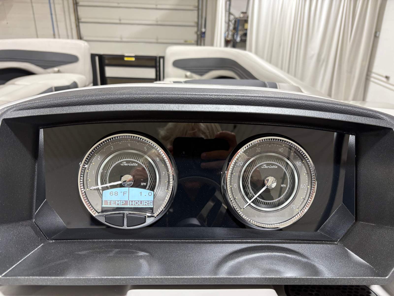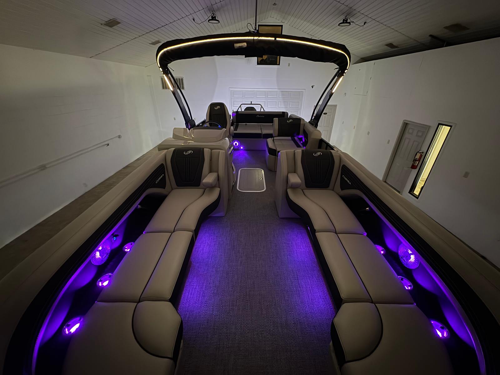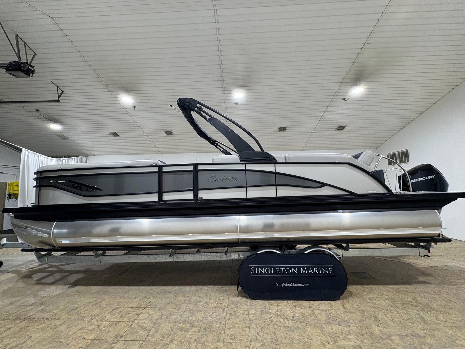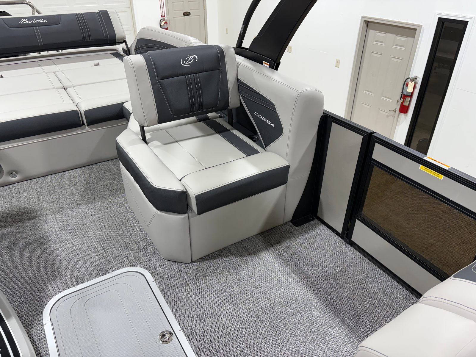 The 2026 Barletta Corsa 25U is loaded with premium features that set it apart from other pontoon boats for sale. The exterior boasts a sophisticated Railskin color in Champagne, complemented by a Gray Moonstone accent and the striking Blackout Package Corsa, giving the boat a modern and upscale appearance. The stainless steel flag pole with an American flag adds a touch of patriotic flair and elegance to your on-water adventures.Step aboard and you will be greeted by Soft Touch Marquesan Gray furniture with Carbon accents, offering plush comfort and a contemporary aesthetic. The Amore Gray flooring is both stylish and practical, providing a durable and easy-to-clean surface that stands up to the demands of active boating. The digital gauges keep you informed of all essential metrics, while the sport bimini (installed in place of the standard bimini) offers enhanced sun protection and a sporty look.