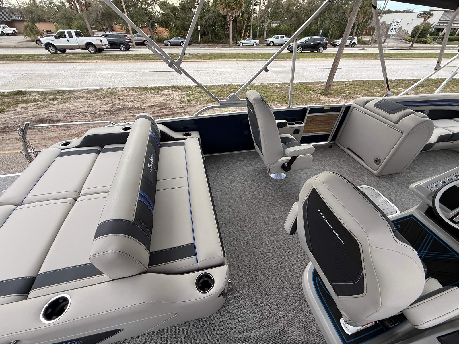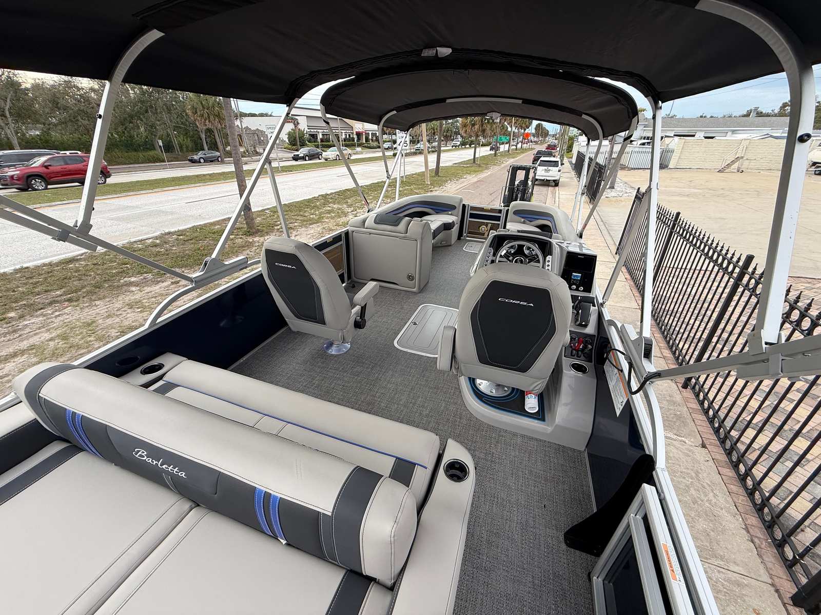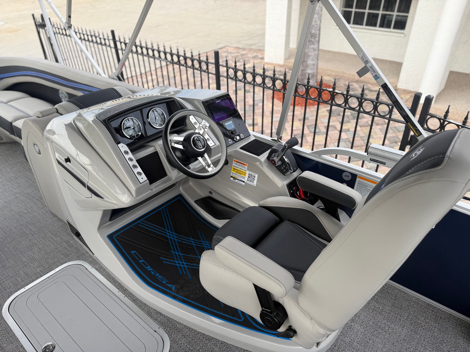 The Barletta Corsa 25UC is packed with premium features designed to elevate your boating experience. The double bimini setup, including an additional power bimini, provides ample shade and protection from the sun, allowing you to relax in comfort no matter the weather. The onboard battery charger with two batteries ensures reliable power for all your electronics and accessories, so you can stay connected and entertained on the water.The Coastal Edition Corsa package enhances the boat’s versatility and durability, making it ideal for a wide range of environments. The combination of Blue Sapphire and Winter White Railskin colors, along with the Marquesan Gray furniture and Amore Gray flooring, creates a cohesive and inviting atmosphere that’s perfect for socializing, lounging, or celebrating special occasions.