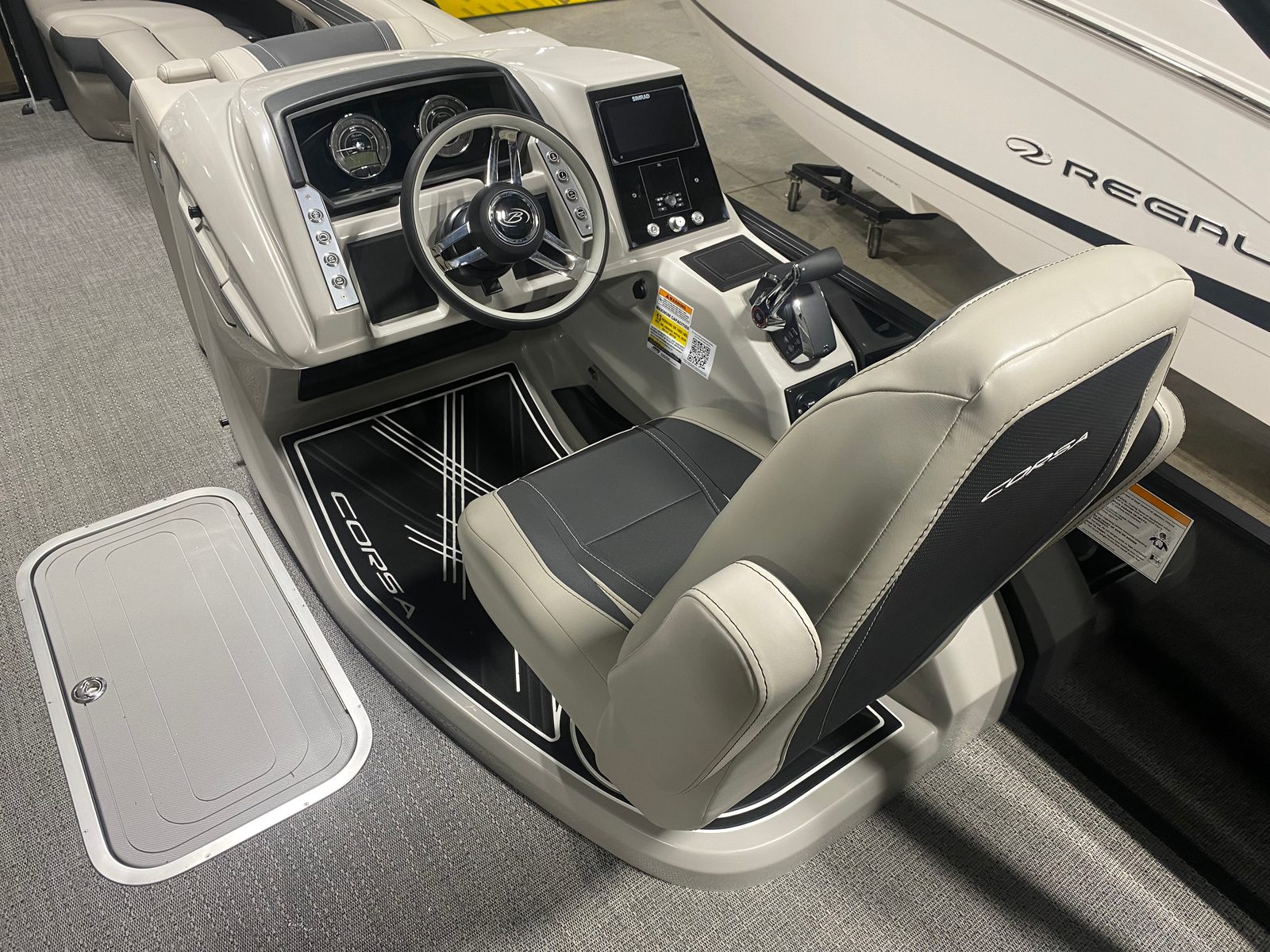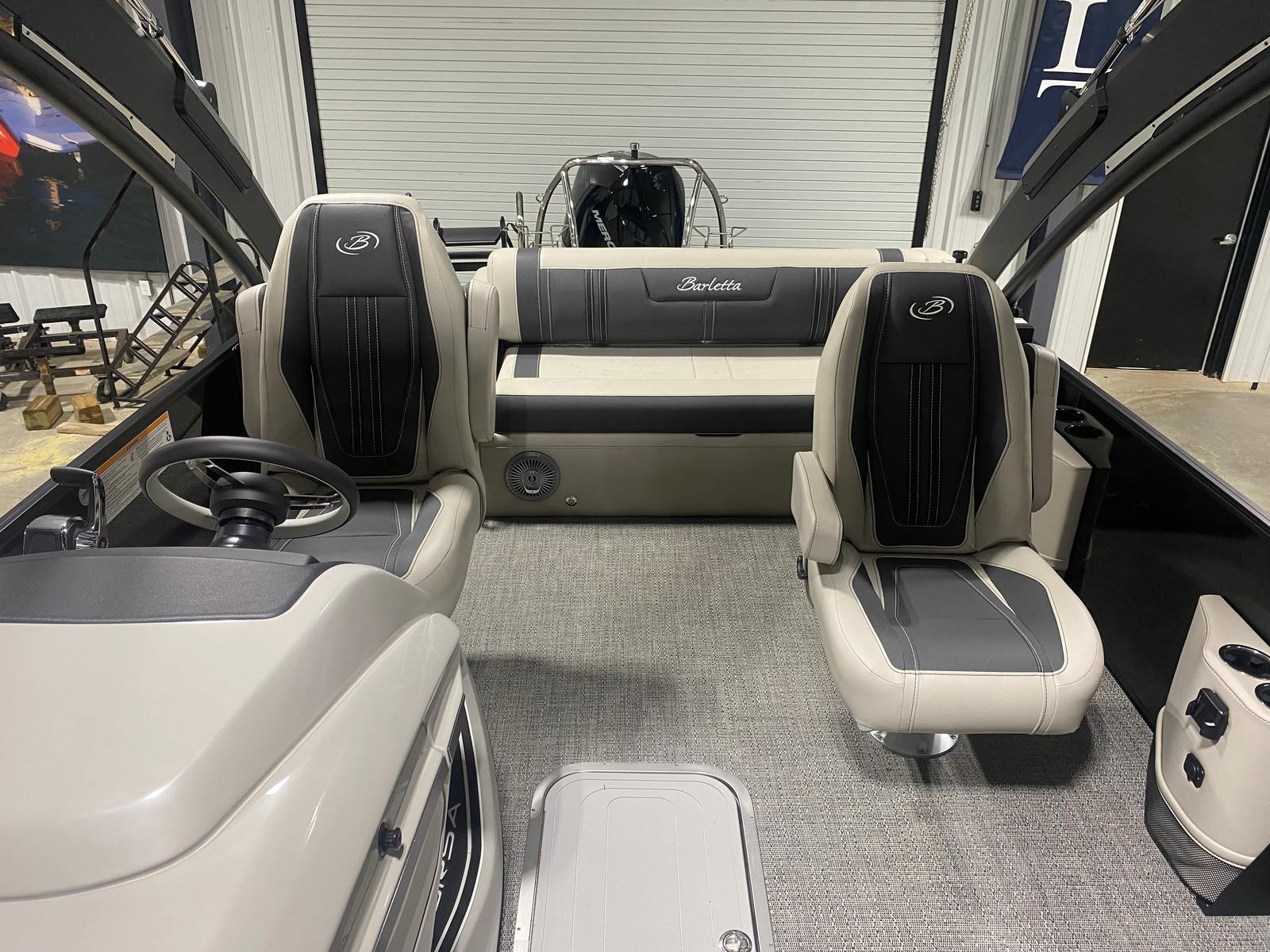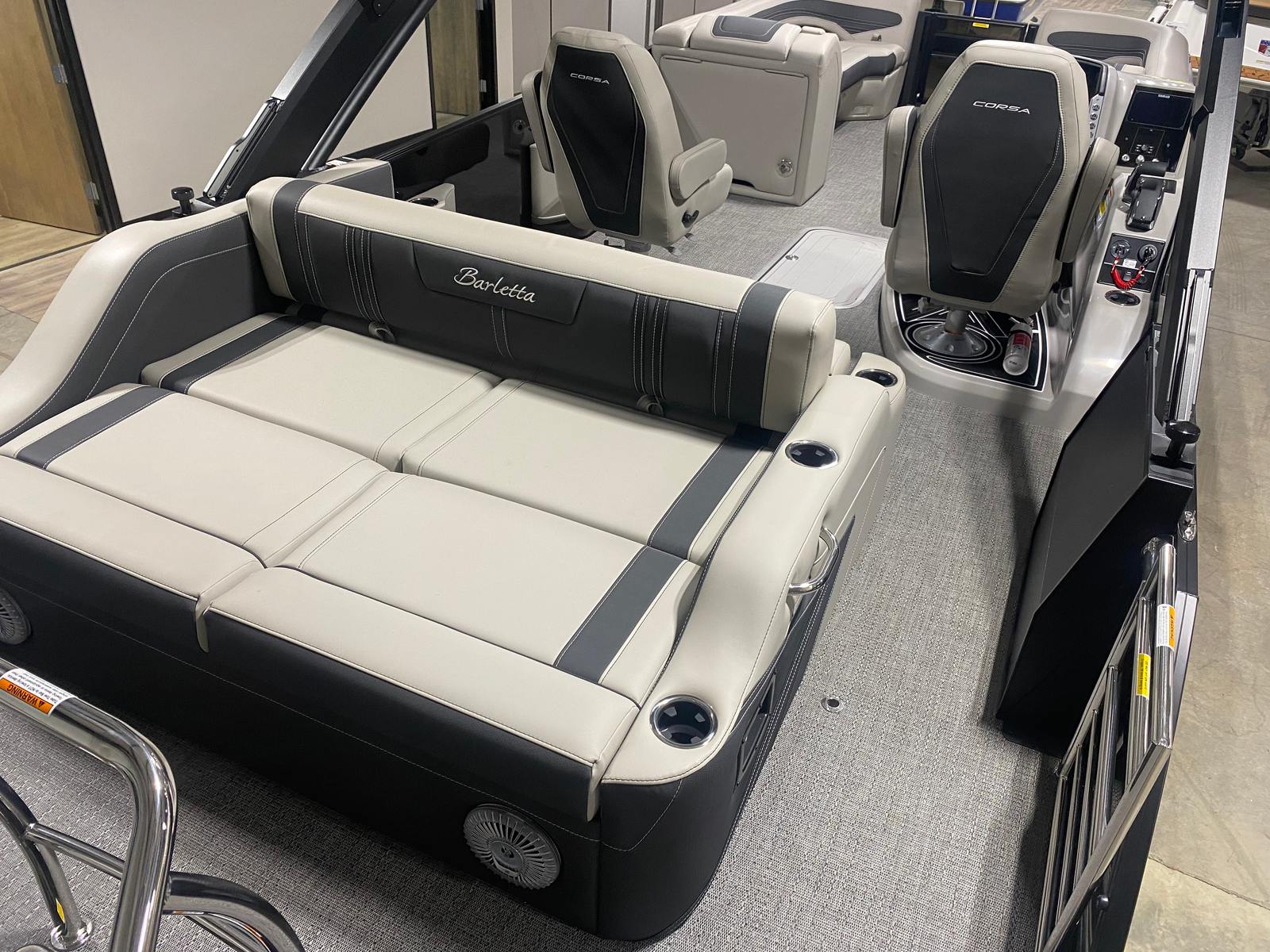 The Barletta Corsa 25UCA is loaded with premium features that elevate your boating experience. The Black Diamond Railskin and Blackout Package Corsa create a striking visual impression, while the stainless steel flag pole with American flag adds a touch of patriotic flair. The exterior lighting, including white underdeck and underwater lights, enhances nighttime ambiance and safety. Inside, the Soft Touch Marquesan Gray furniture with Carbon Accent offers plush comfort, complemented by the stylish Amore Gray flooring. The Mercury Digital DTS Pre-Rig and Vessel Link ensure precise engine control, and the drop ship engine rigging (no prop) allows for customization to suit your preferences. Hydraulic and power assist steering, digital gauges, and the Corsa Simrad engine integration at the helm provide a modern, intuitive boating experience.