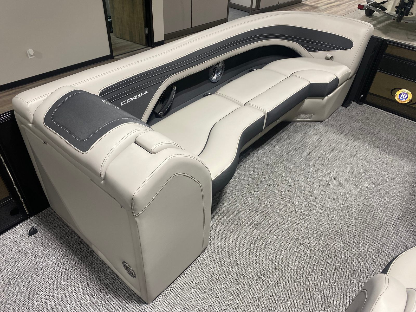 Owning the Barletta Corsa 25UCA pontoon means enjoying the perfect balance of relaxation and excitement. The spacious layout is ideal for socializing, sunbathing, or enjoying a meal with loved ones. The soft-touch furniture and elegant flooring create a comfortable environment, while the advanced helm and engine integration make every journey smooth and enjoyable. The exterior lighting not only adds to the boat’s visual appeal but also ensures safe navigation after sunset. With its powerful engine and responsive steering, this pontoon boat for sale is equally suited for leisurely cruises or thrilling rides, making it a versatile choice for any boating enthusiast.