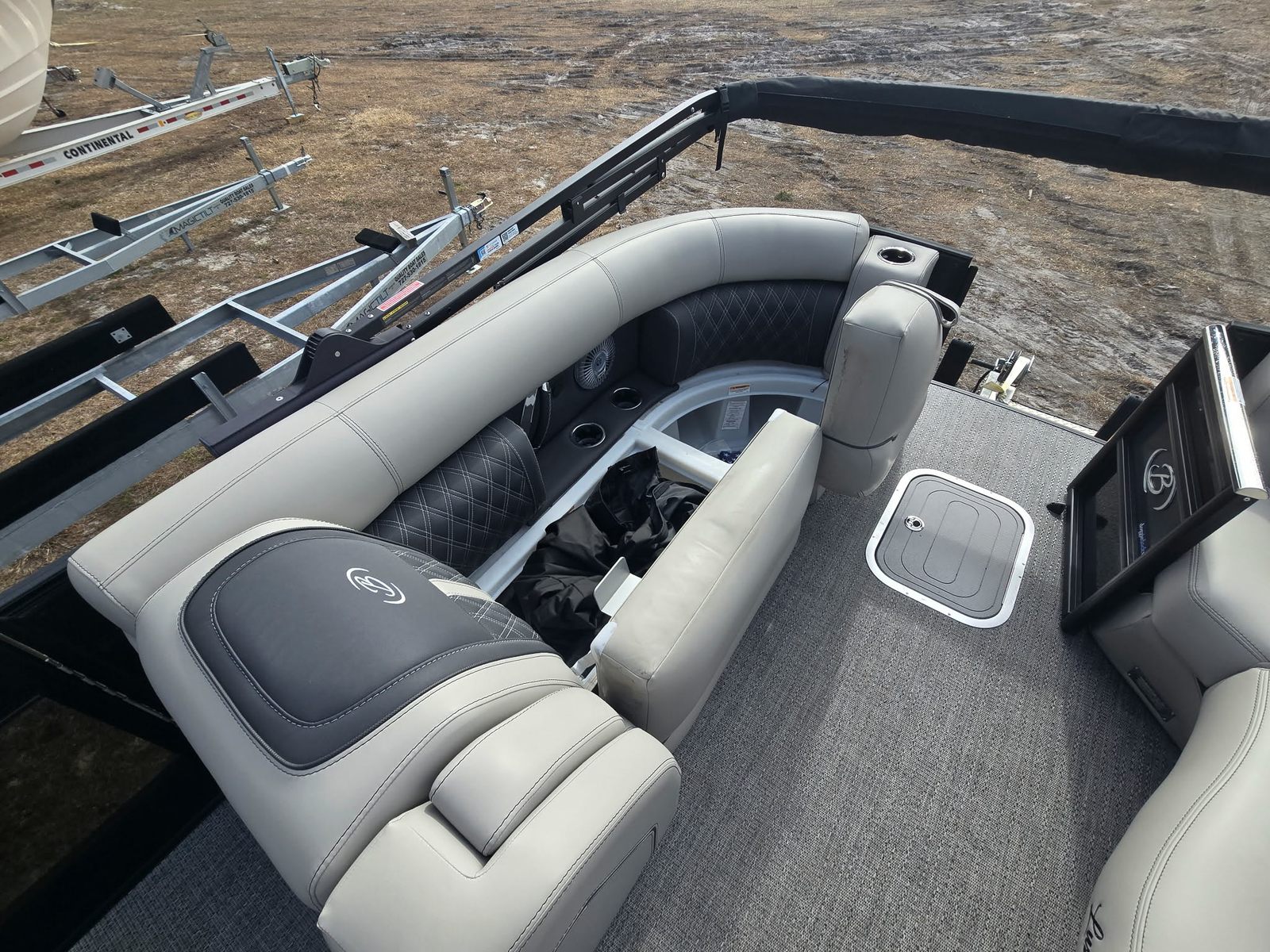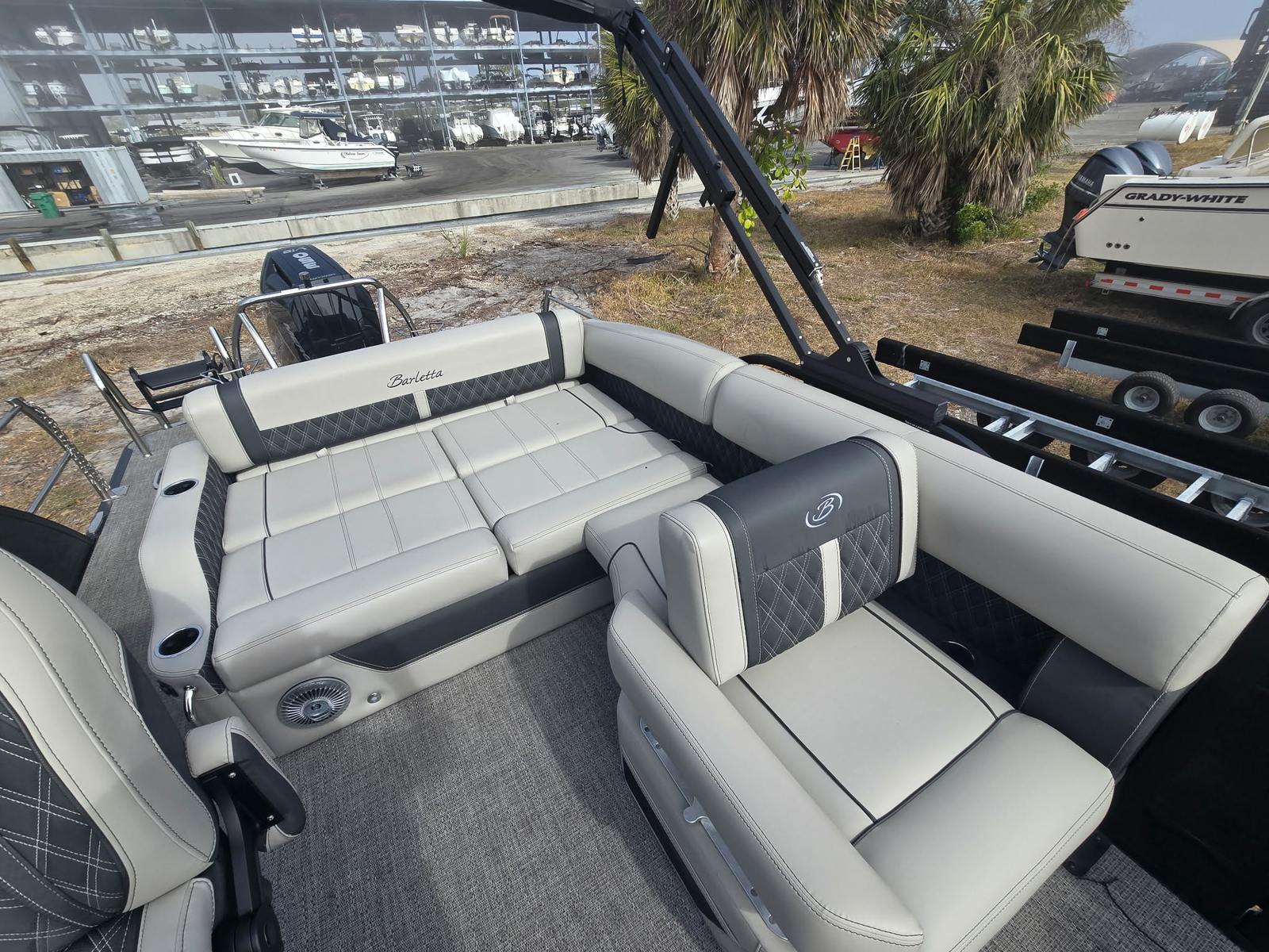 This Barletta boat for sale is packed with premium features designed to enhance comfort, convenience, and style. The Blackout Package Lusso adds a bold, modern touch to the railskin, while the Coastal Edition Lusso ensures durability and resilience in a variety of environments. The double bimini, including an additional power bimini, offers versatile shade options, allowing you to customize your comfort level throughout the day. The Marquesan Gray with Onyx furniture provides plush seating and a refined look, while the Amore Gray flooring is both stylish and easy to maintain. Every detail of the Lusso L23U is crafted to deliver a first-class boating experience.