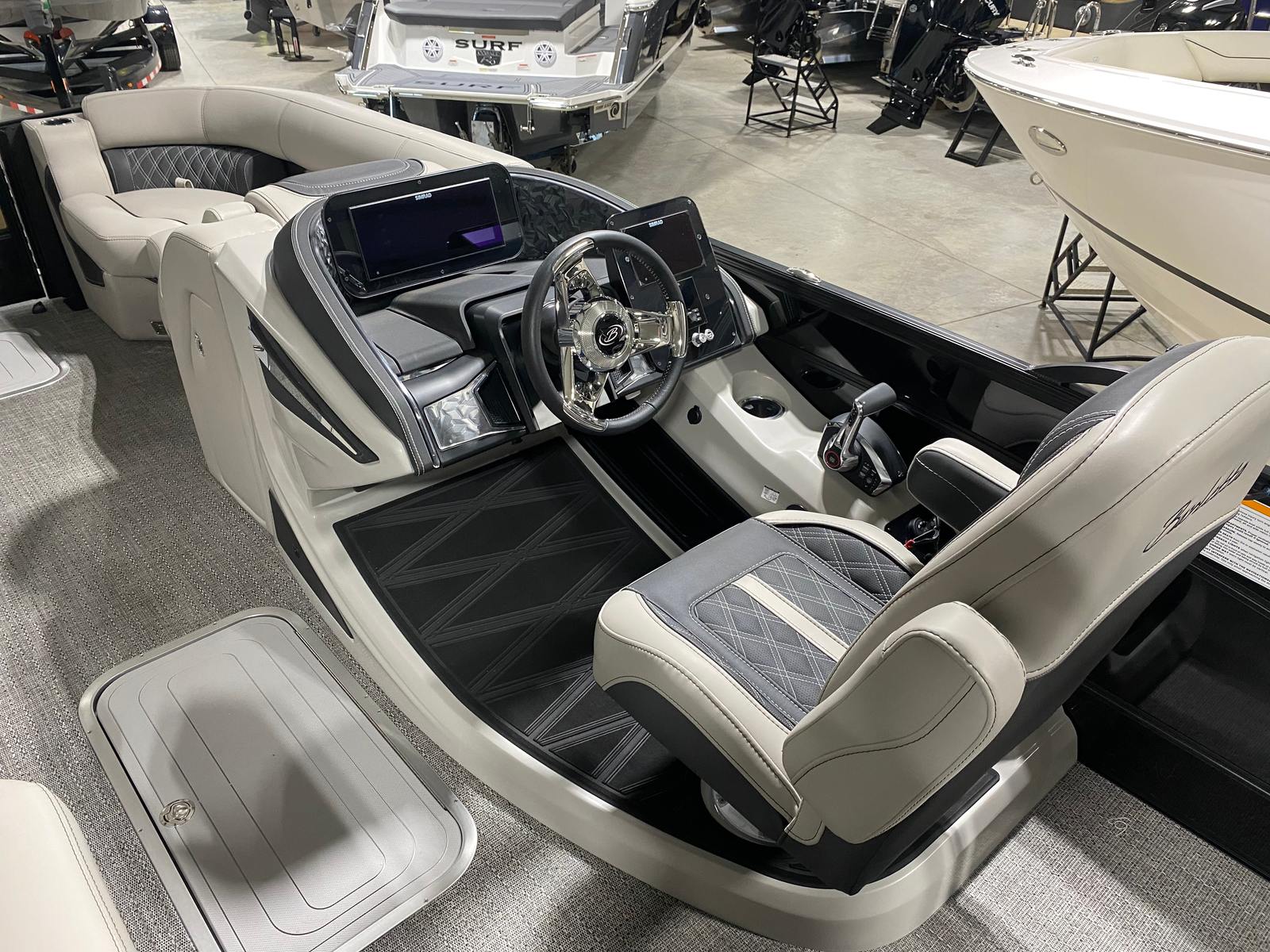 At the heart of the Barletta Lusso L23UC is the powerful Mercury 250L Verado V8 engine, delivering an impressive 250 horsepower. This engine is engineered for smooth, reliable performance, whether you’re cruising across the lake or heading out for a day of adventure. The Mercury Digital DTS Pre-Rig for VERADO engines with Vessel Link ensures seamless integration and precise control, while hydraulic and power assist steering make handling effortless. Digital gauges provide real-time information, keeping you in command of your journey at all times. With this level of performance, the Lusso L23UC stands out as a top choice among pontoon boats for sale.