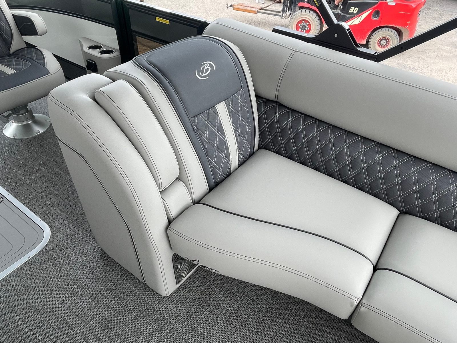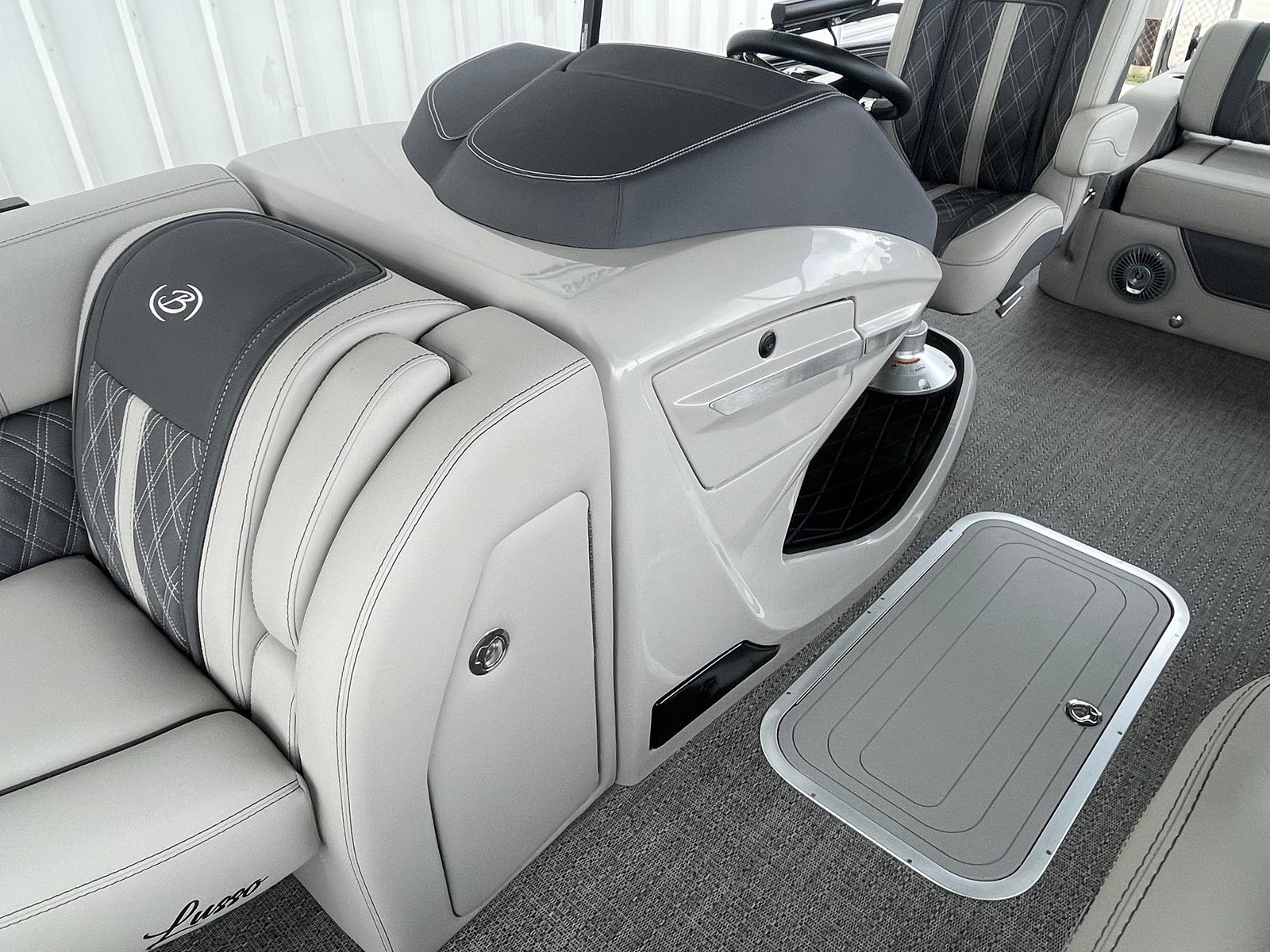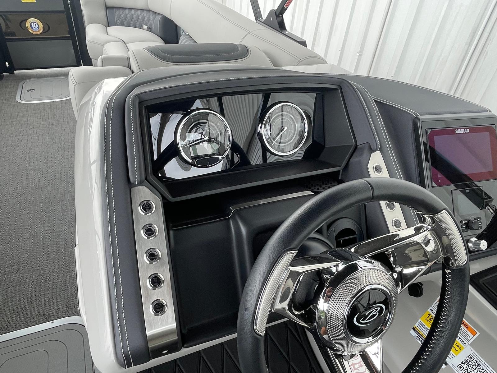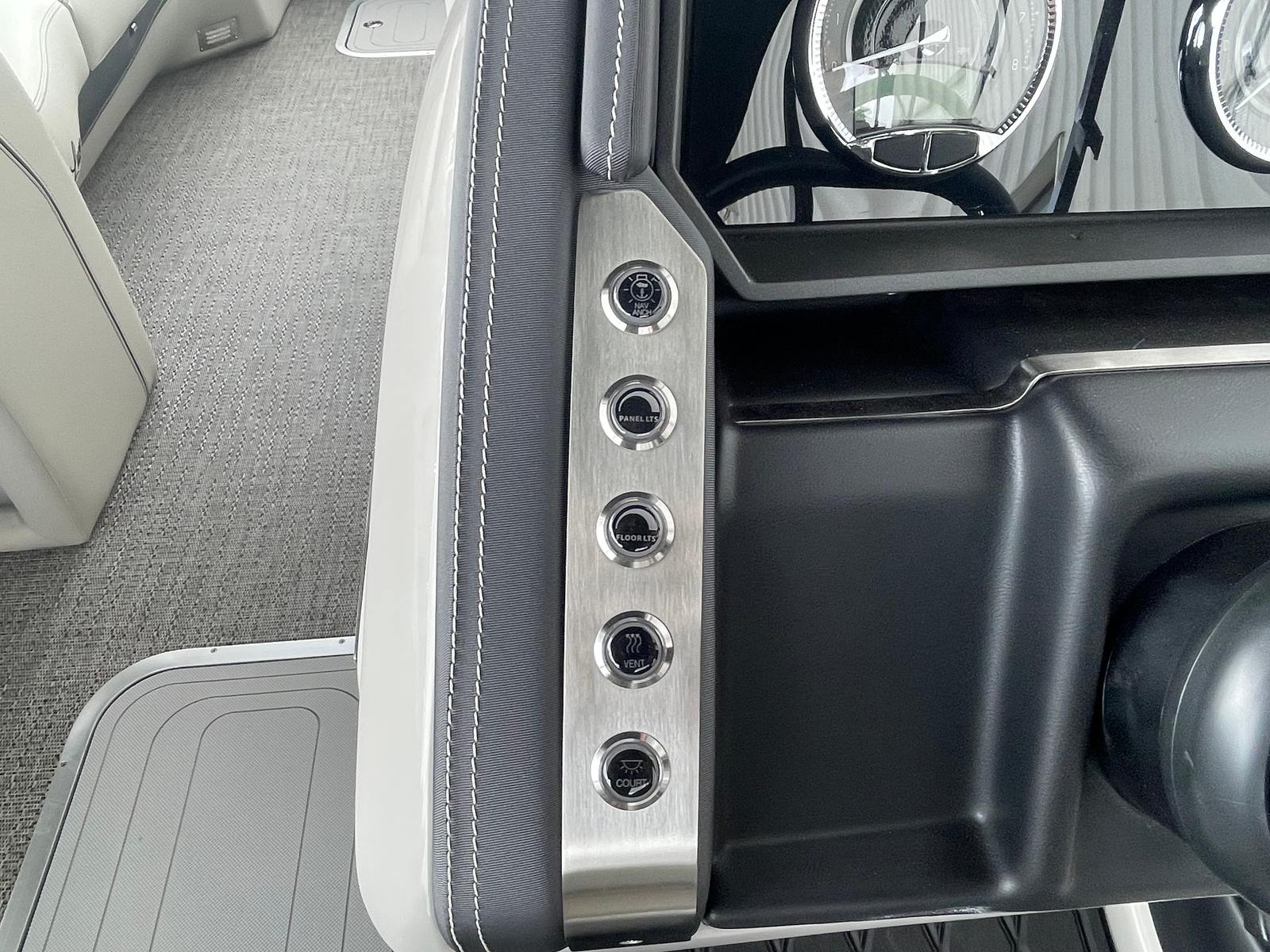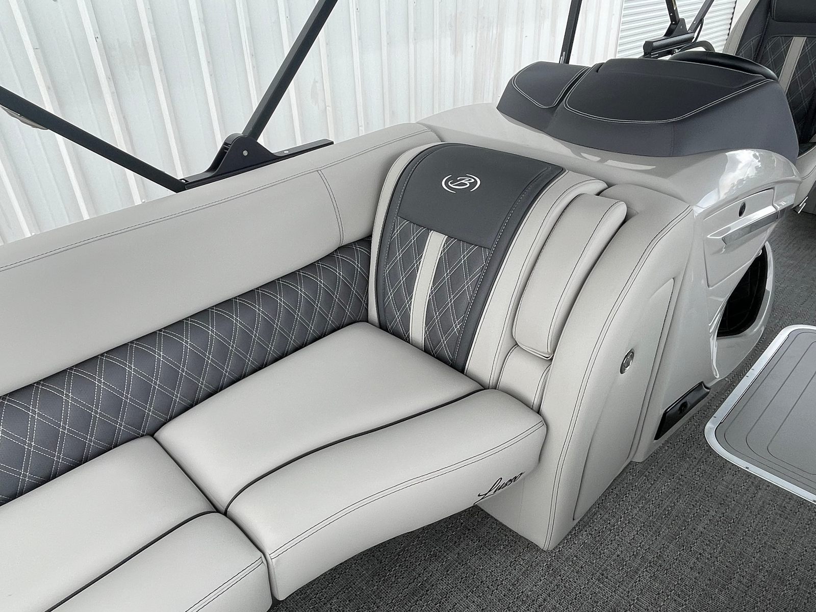 The 2025 Barletta Lusso L25UC is designed to impress from every angle, boasting a suite of special features that set it apart from other pontoon boats for sale. The exterior showcases a sophisticated Sweep Color in Gray Moonstone, complemented by a striking White Opal accent color. The Blackout Package Lusso railskin adds a bold, modern touch, while the Metal Jacket Protectant ensures the exterior remains pristine and protected against the elements.Step aboard and you are greeted by luxurious Marquesan Gray furniture with Charcoal accents, creating a refined and inviting atmosphere. The Amore Gray flooring not only enhances the aesthetic appeal but also provides comfort and durability underfoot. For those who love to entertain or simply relax in the shade, the double bimini setup, including an additional power bimini, offers versatile sun protection and comfort throughout the day.