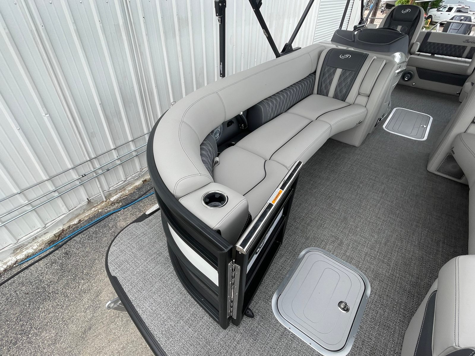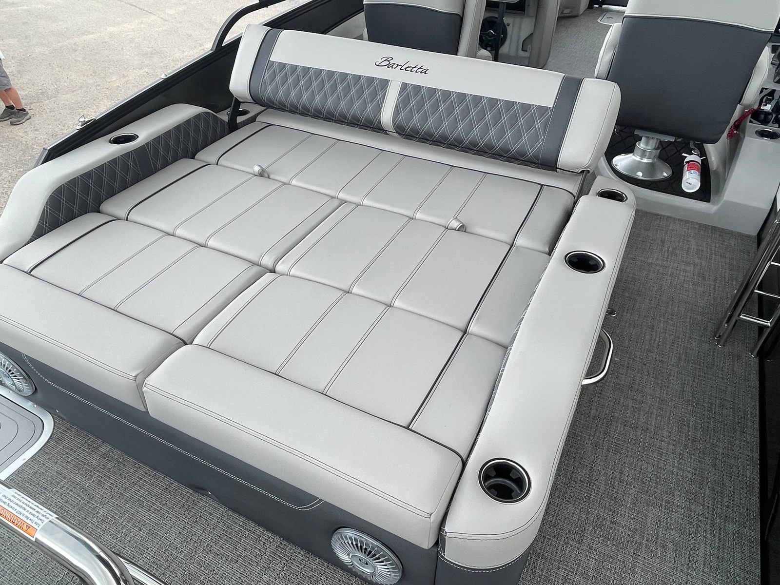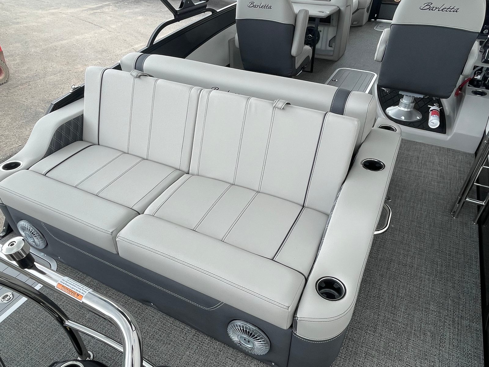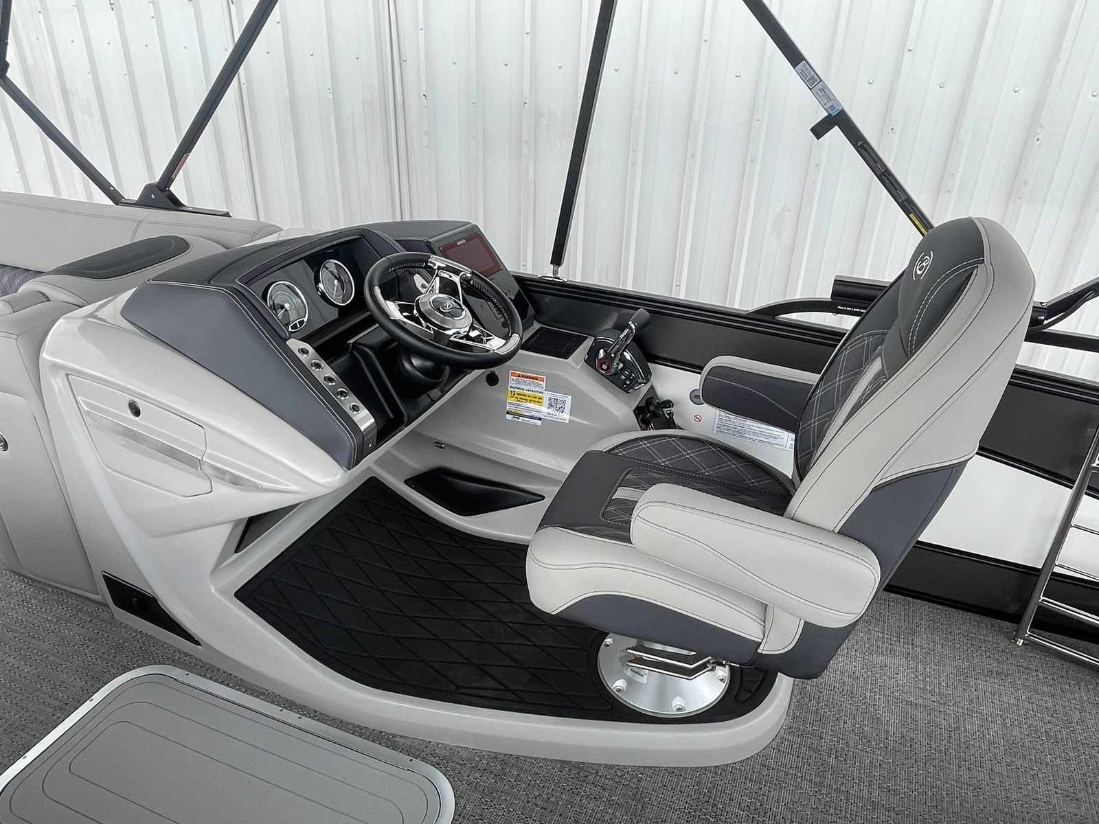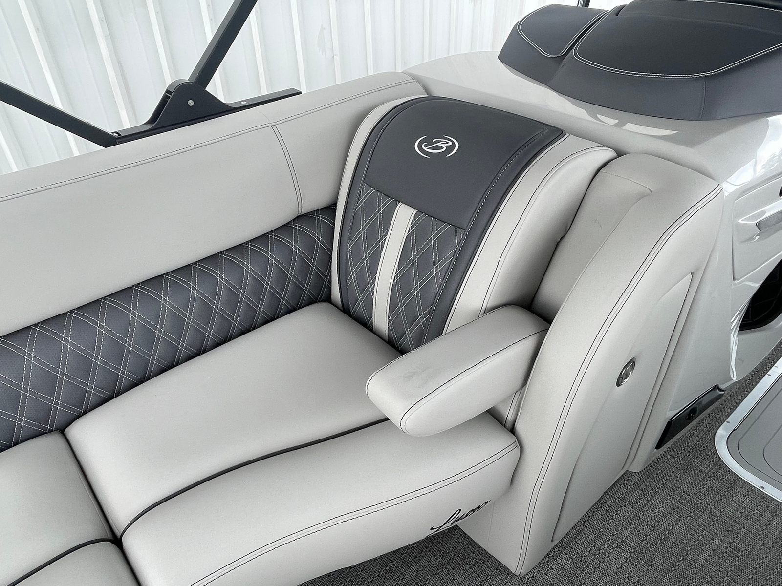 The 2025 Barletta Lusso L25UC is designed to impress from every angle, boasting a suite of special features that set it apart from other pontoon boats for sale. The exterior showcases a sophisticated Sweep Color in Gray Moonstone, complemented by a striking White Opal accent color. The Blackout Package Lusso railskin adds a bold, modern touch, while the Metal Jacket Protectant ensures the exterior remains pristine and protected against the elements.Step aboard and you are greeted by luxurious Marquesan Gray furniture with Charcoal accents, creating a refined and inviting atmosphere. The Amore Gray flooring not only enhances the aesthetic appeal but also provides comfort and durability underfoot. For those who love to entertain or simply relax in the shade, the double bimini setup, including an additional power bimini, offers versatile sun protection and comfort throughout the day.