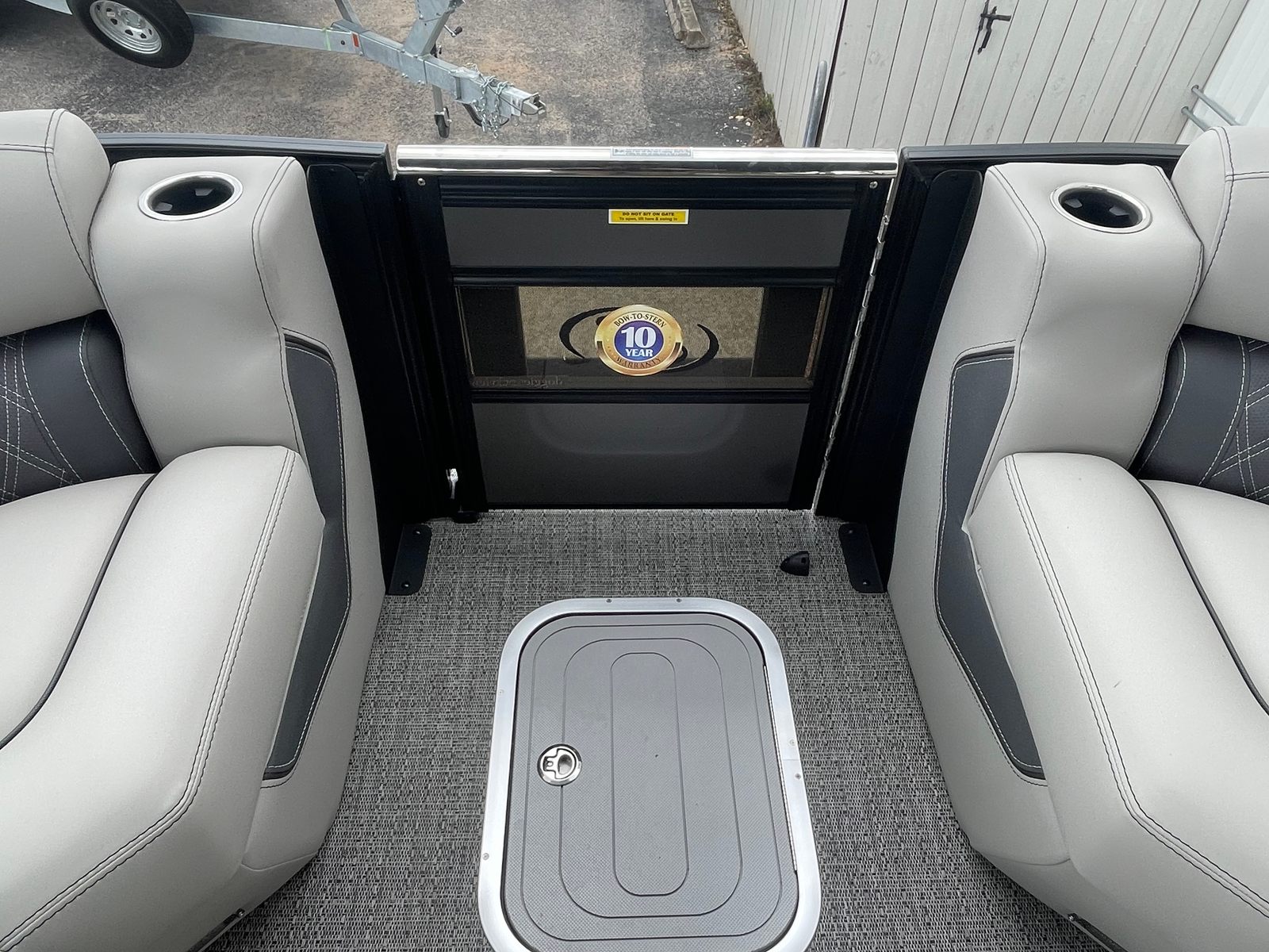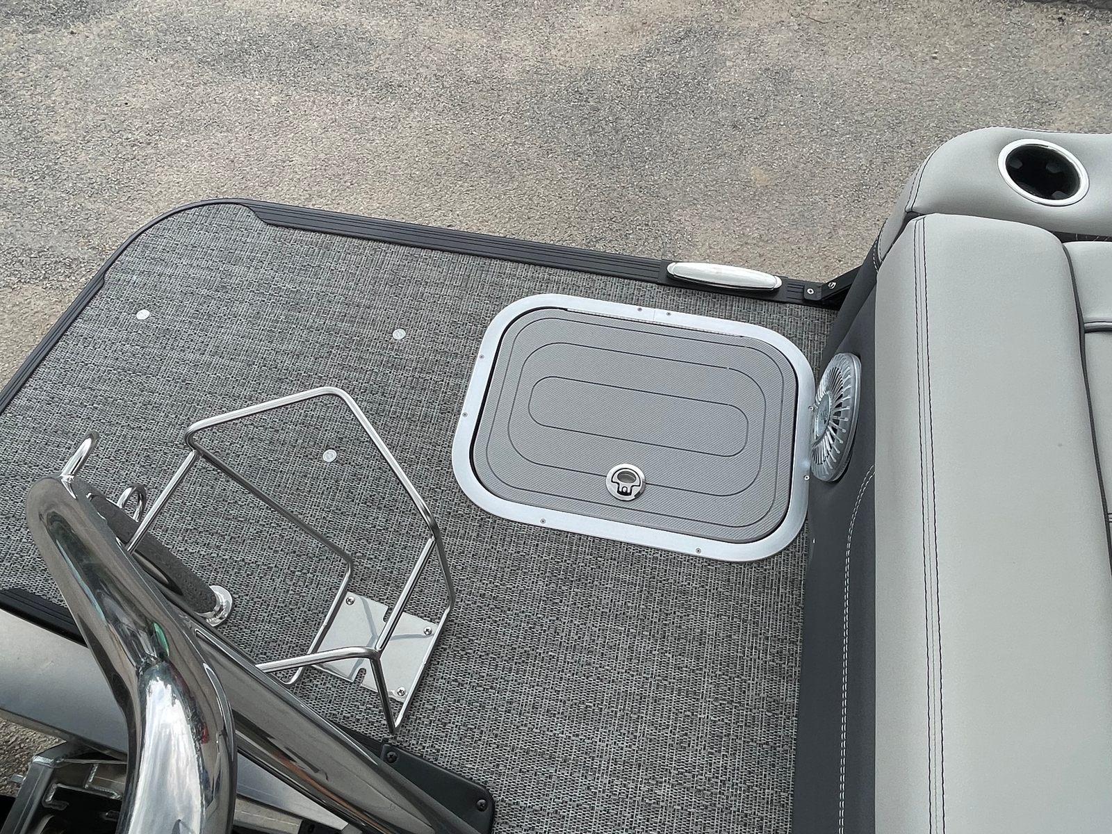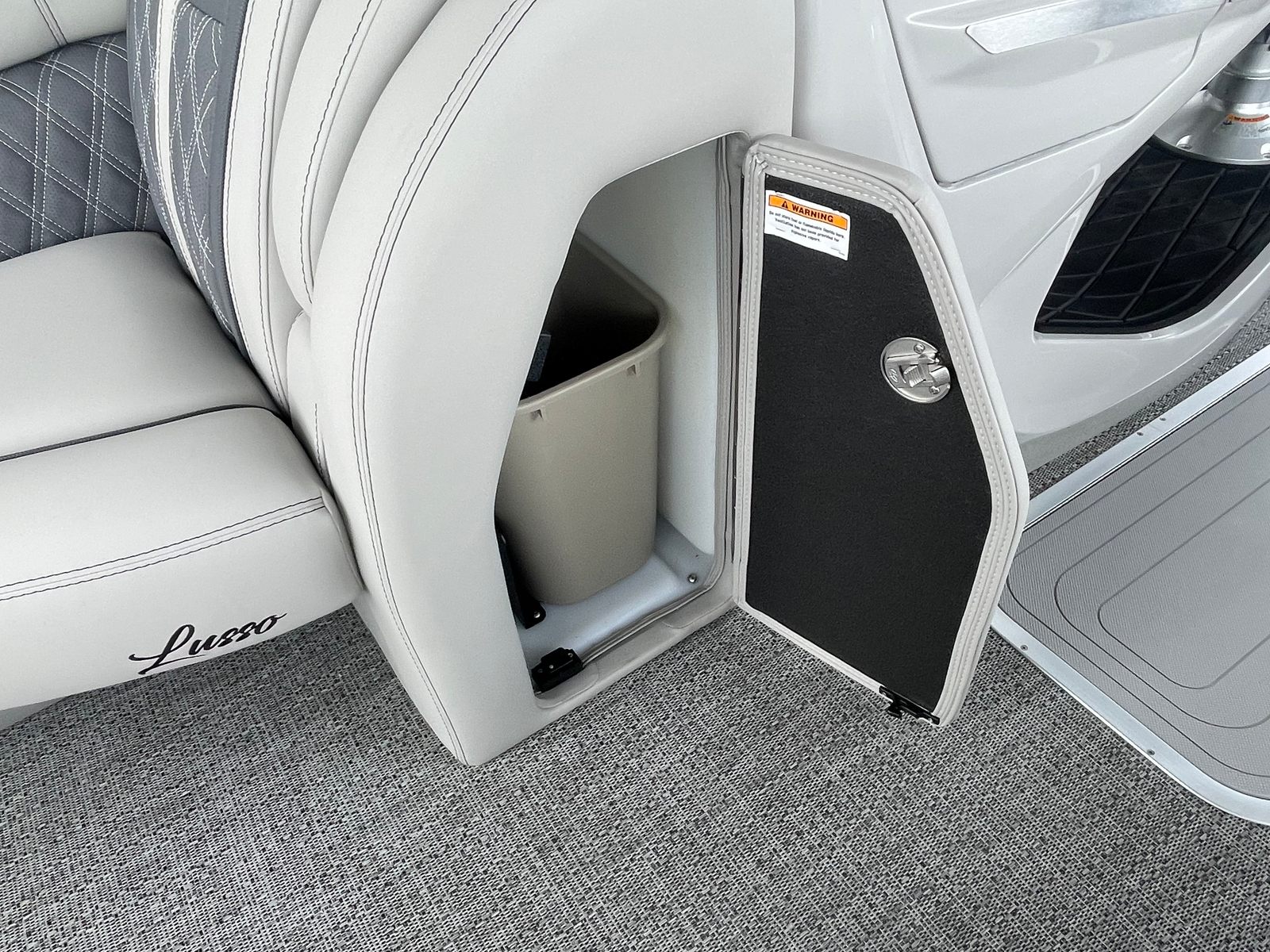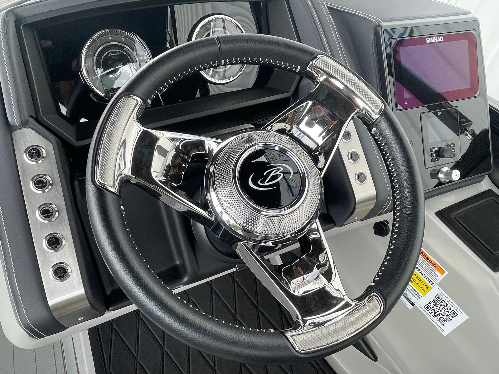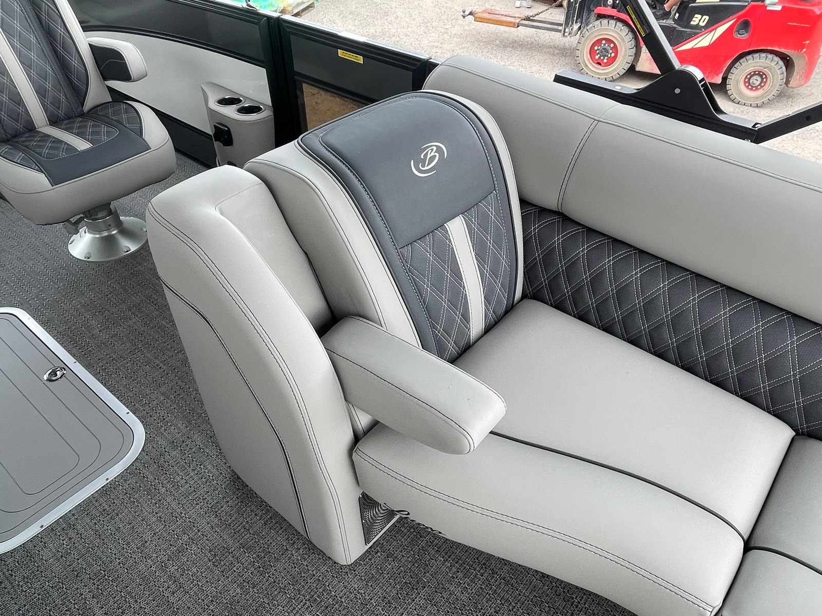 The 2025 Barletta Lusso L25UC is designed to impress from every angle, boasting a suite of special features that set it apart from other pontoon boats for sale. The exterior showcases a sophisticated Sweep Color in Gray Moonstone, complemented by a striking White Opal accent color. The Blackout Package Lusso railskin adds a bold, modern touch, while the Metal Jacket Protectant ensures the exterior remains pristine and protected against the elements.Step aboard and you are greeted by luxurious Marquesan Gray furniture with Charcoal accents, creating a refined and inviting atmosphere. The Amore Gray flooring not only enhances the aesthetic appeal but also provides comfort and durability underfoot. For those who love to entertain or simply relax in the shade, the double bimini setup, including an additional power bimini, offers versatile sun protection and comfort throughout the day.