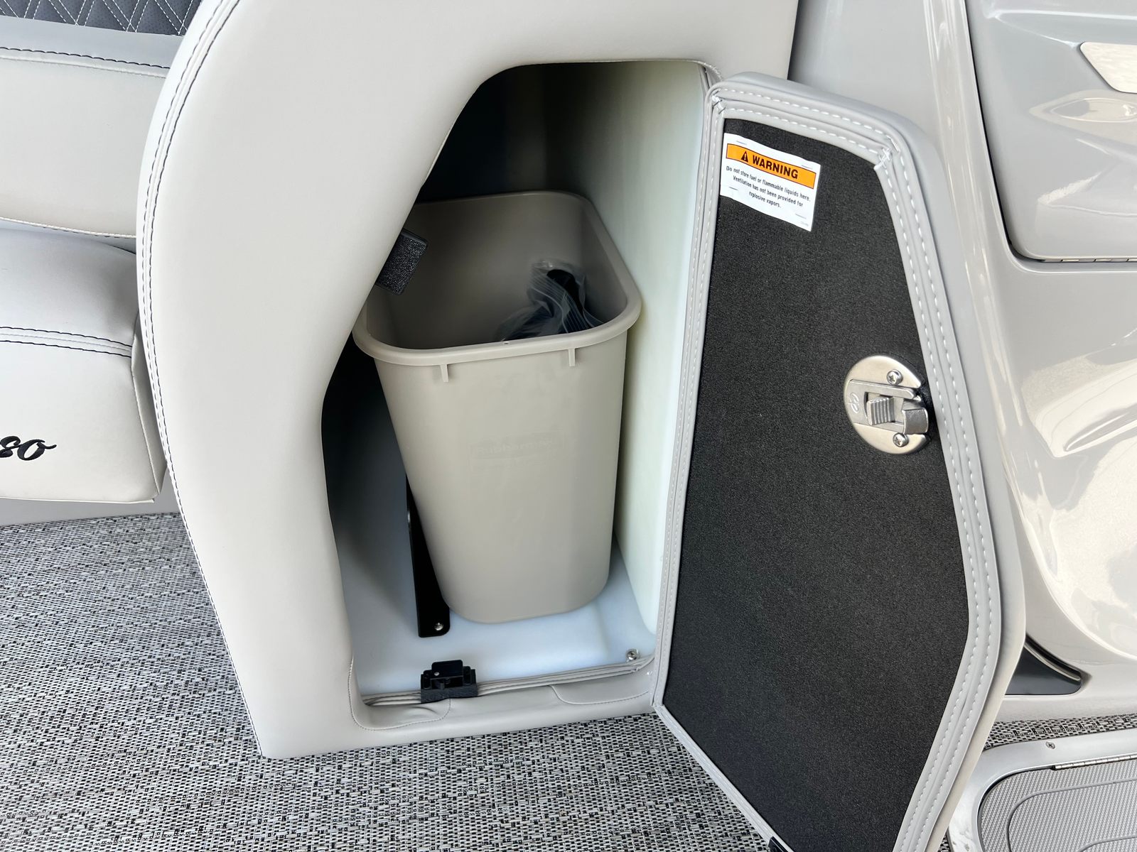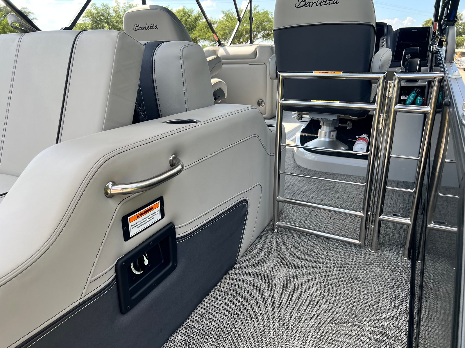 The 2025 Barletta Lusso L25UC is loaded with special features that enhance both comfort and convenience. Step inside and you will find a beautifully appointed interior, featuring a table with a pedestal and base, complete with Yeti-ready cupholders—perfect for keeping your favorite beverages secure while you relax or entertain. The furniture is finished in a sophisticated Marquesan Gray with Charcoal Accent, complemented by Amore Gray flooring that is both stylish and easy to maintain.For those who appreciate versatility and shade, the Lusso L25UC comes equipped with a double bimini, including an additional power bimini for effortless adjustment. The Blackout Package Lusso adds a bold, modern touch to the railskin, while the Metal Jacket Protectant on the exterior ensures your pontoon boat stays looking pristine season after season. The captain’s chair features an adjustable pedestal, providing customized comfort for long days on the water.