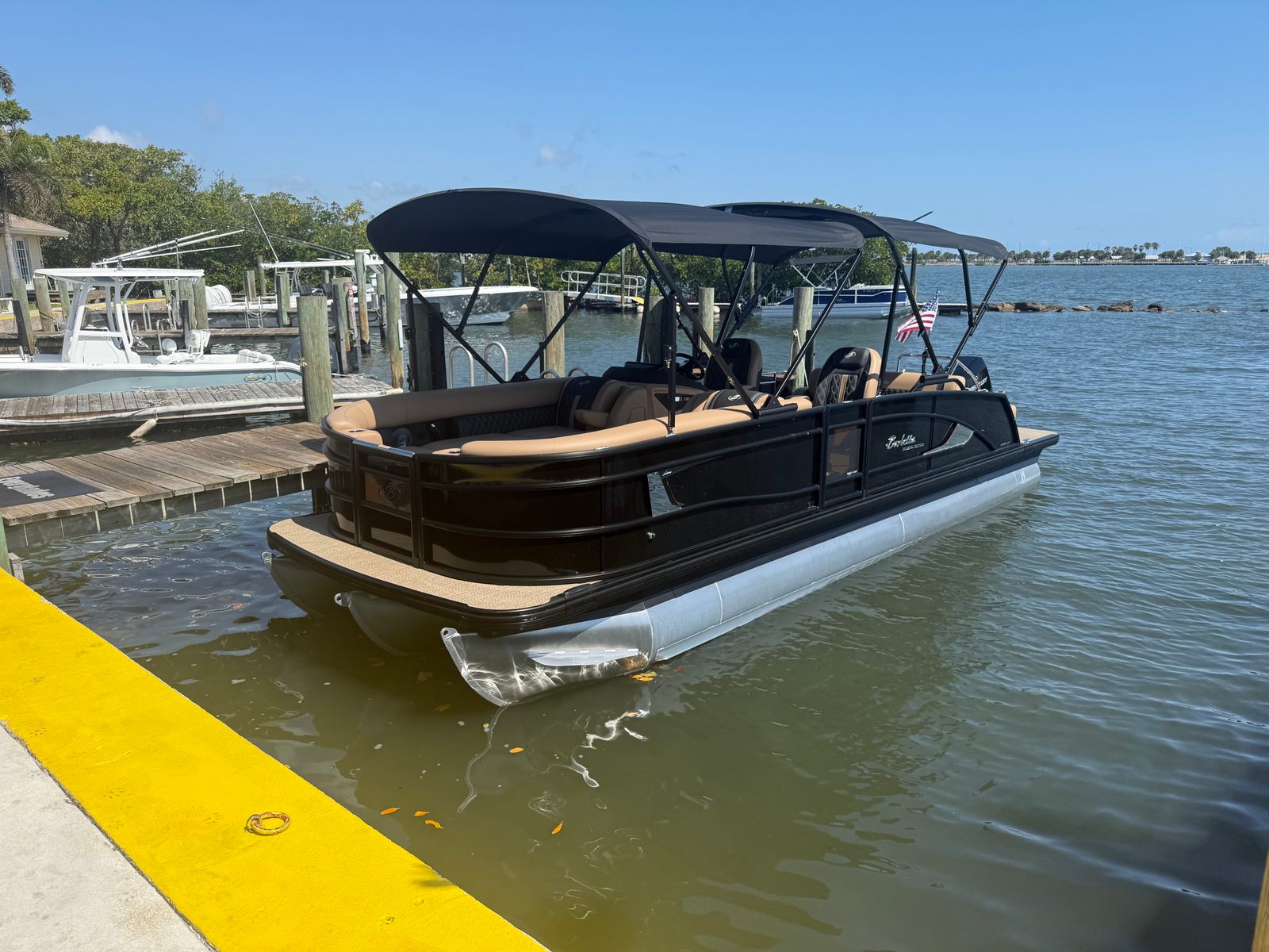 The 2026 Barletta Lusso L25UC is loaded with special features designed to elevate your boating experience. The Black Diamond sweep and accent colors, paired with the Lusso Blackout Package, give this pontoon a striking and contemporary look that turns heads wherever you go. The Carmella Tan with Onyx furniture provides plush, supportive seating for you and your guests, while the Amore Tan flooring adds a touch of warmth and elegance underfoot. The Lusso Coastal Edition ensures that this pontoon is ready for a variety of water conditions, making it a versatile choice for any adventure. The double bimini canvas offers ample shade and protection from the sun, allowing you to enjoy long days on the water in comfort.