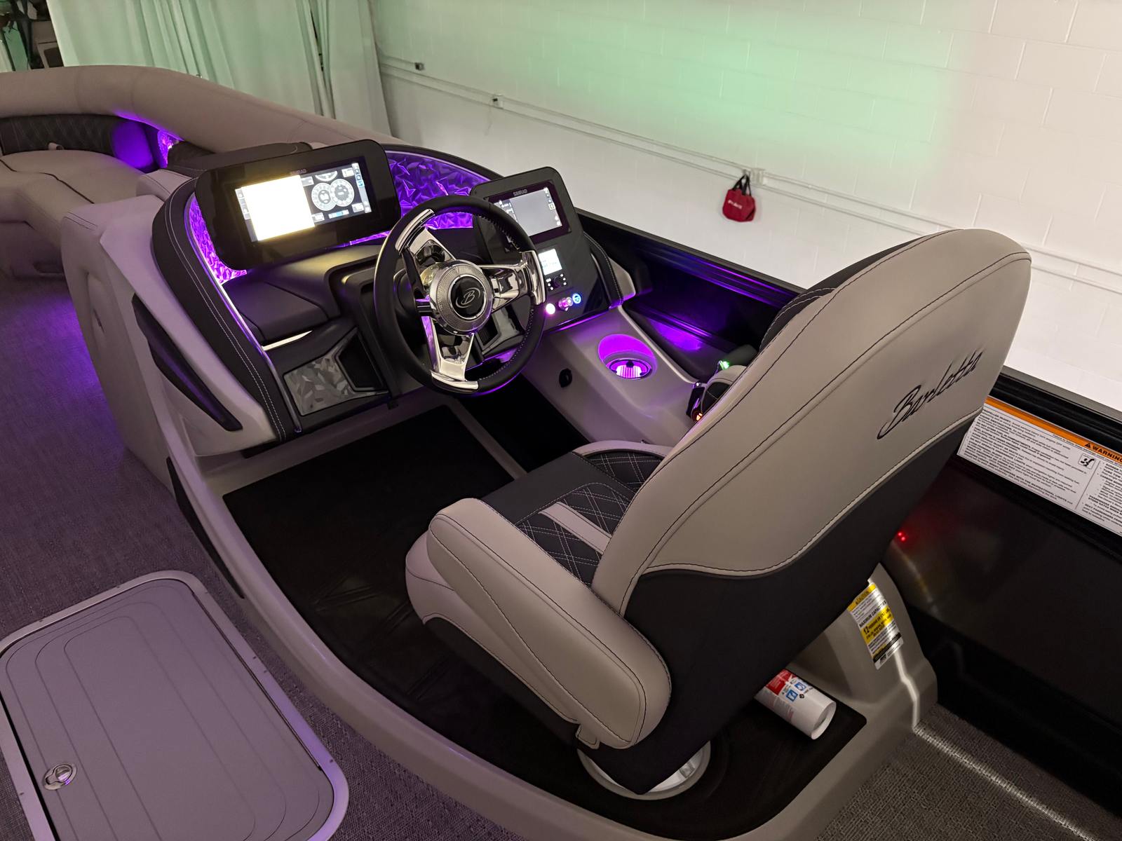 The Barletta Lusso L25UC is packed with premium features that set it apart from other pontoon boats for sale. The Blackout Package Lusso railskin adds a bold, sophisticated touch to the exterior, perfectly complemented by the Black Diamond sweep and accent colors. Inside, the Carmella Tan with Onyx furniture offers plush, ergonomic seating for ultimate comfort, while the Amore Tan flooring provides a stylish and durable foundation for all your onboard activities.Advanced digital gauges keep you informed at a glance, ensuring you have all the information you need for a safe and enjoyable outing. The exterior is protected by a Metal Jacket Protectant, helping to maintain the boat’s pristine appearance season after season. For those who love to entertain after sunset, the exterior lighting package includes white underdeck and underwater lights, creating a captivating ambiance that enhances every evening on the water.