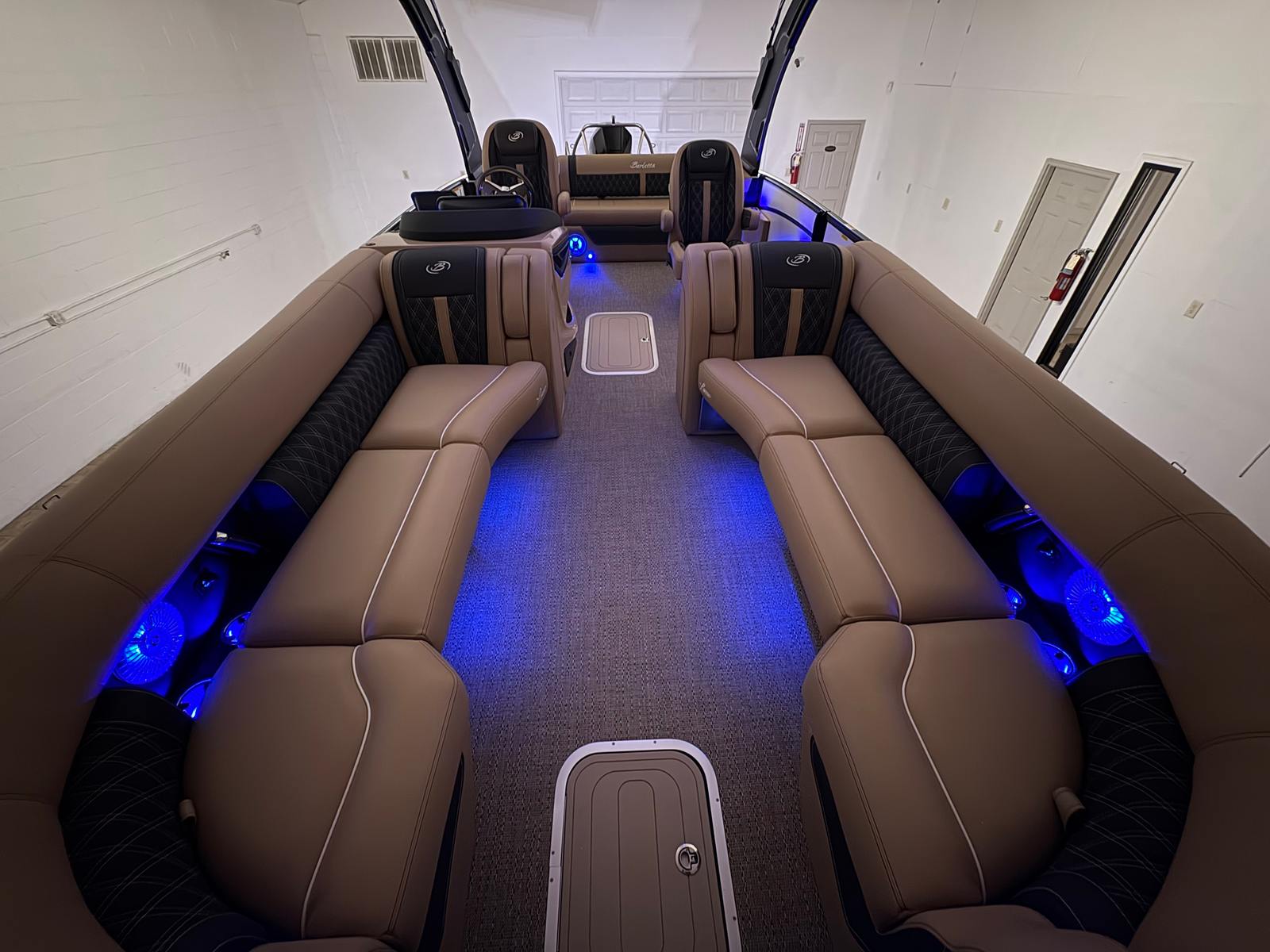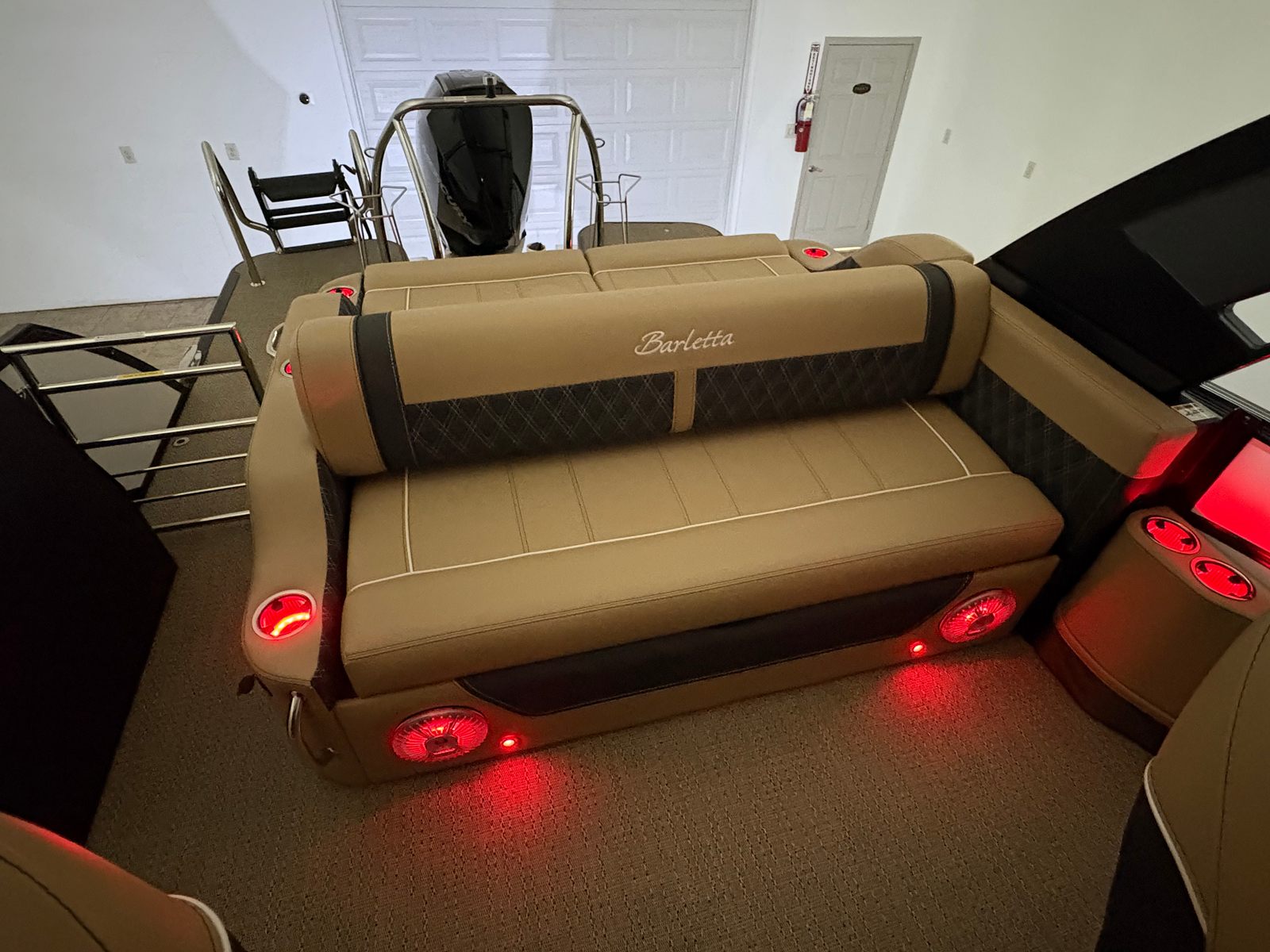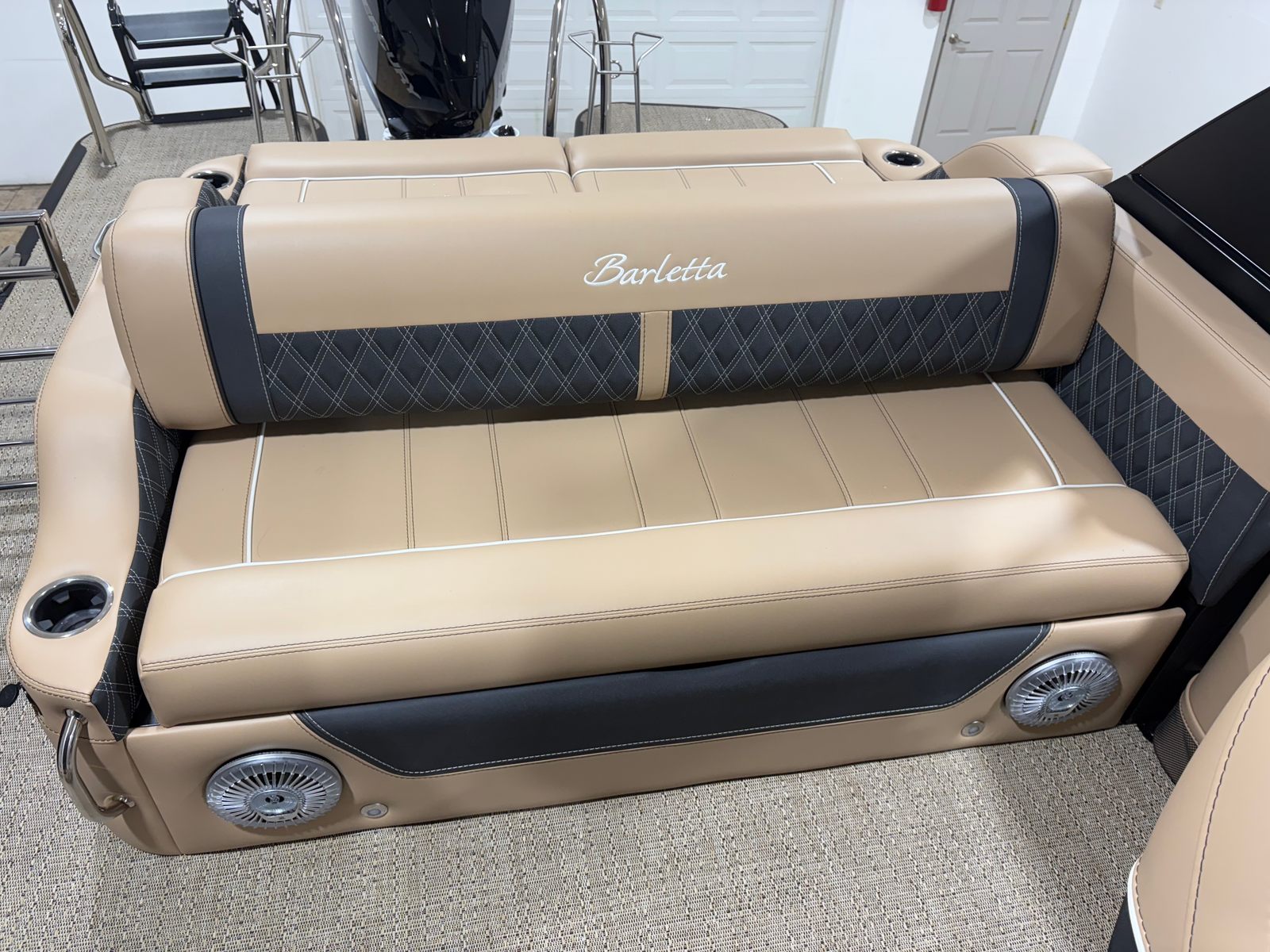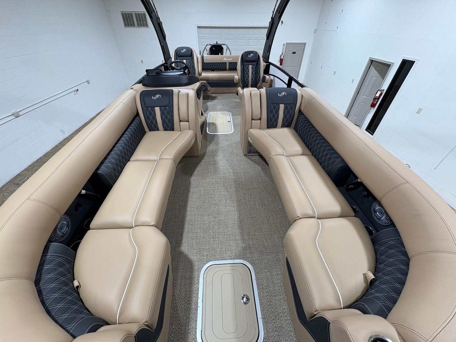The Barletta Lusso L25UCA is packed with premium features that elevate your boating experience. The exterior lighting, including white underdeck and underwater lights, creates a captivating ambiance for evening cruises and dockside gatherings. Digital gauges provide clear, real-time information at a glance, ensuring you stay informed and in control at all times. The carefully selected Carmella Tan with Onyx furniture offers plush seating and ample space for relaxation, while the Amore Tan flooring adds a touch of elegance and comfort underfoot. The Blackout Package Lusso railskin not only enhances the boat’s appearance but also adds an extra layer of sophistication and exclusivity.