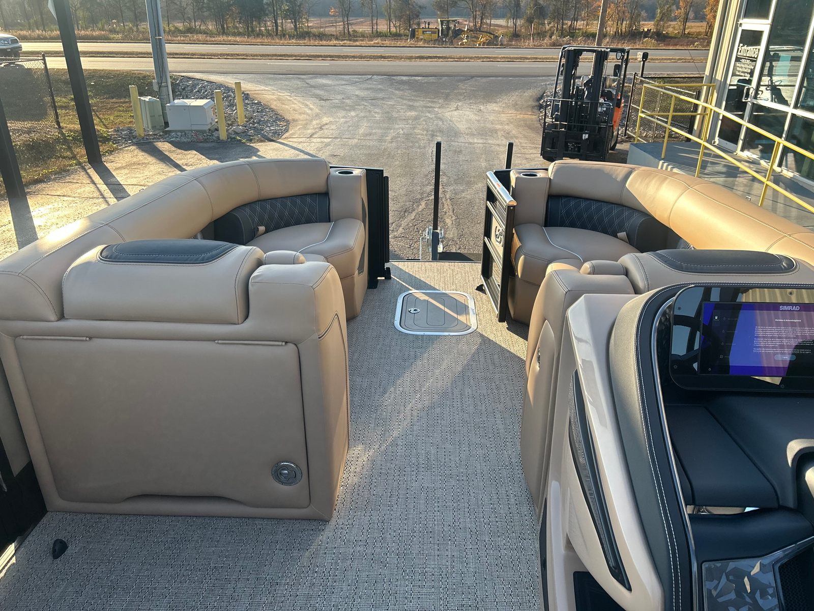 The 2026 Barletta Lusso L25UE is loaded with features that enhance both comfort and convenience. The Blackout Package Lusso railskin adds a bold, modern touch to the exterior, while the Carmella Tan with Onyx furniture offers plush seating for all your guests. The Amore Tan flooring is not only stylish but also easy to maintain, making it ideal for active days on the water. The Sport Bimini, installed in place of the standard bimini, provides ample shade and protection from the sun, ensuring comfort during long afternoons afloat. An onboard battery charger with two batteries ensures you have reliable power for all your electronic needs, keeping your adventures uninterrupted.