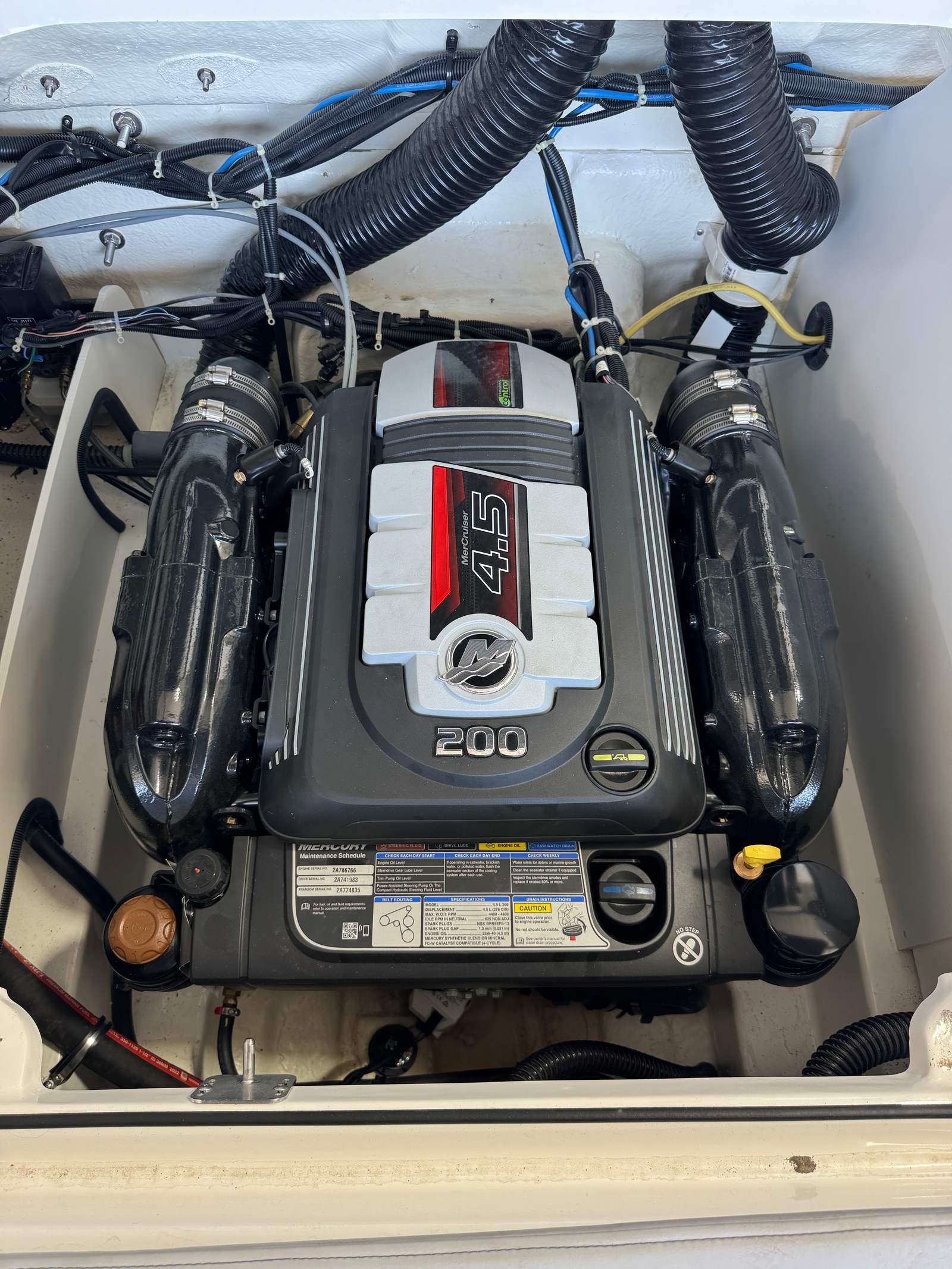 Under the hood, the Bayliner VR5 is powered by a single engine delivering an impressive 200 horsepower. This robust engine ensures smooth acceleration, responsive handling, and plenty of power for water sports, cruising, or simply enjoying a leisurely ride. Whether you’re towing a wakeboarder, zipping across the lake, or navigating through calm waters, the VR5’s performance capabilities make every outing thrilling and enjoyable. The efficient engine design also means you can spend more time on the water and less time at the fuel dock, making this Bowrider boat for sale a smart choice for both fun and practicality.