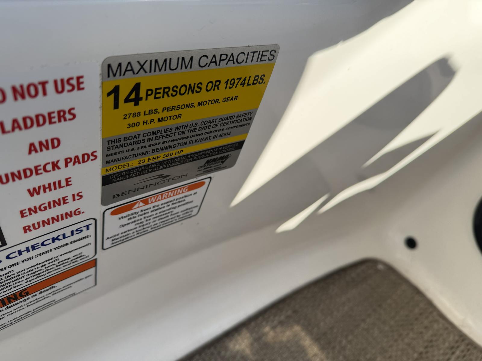 Under the deck, the Bennington 23 Rcwl is powered by a robust single engine delivering an impressive 350 horsepower. This powerful setup ensures smooth acceleration, responsive handling, and the ability to cruise effortlessly across lakes, rivers, or coastal waters. Whether you are towing water toys, heading to your favorite fishing spot, or simply enjoying a leisurely cruise, the performance of this pontoon boat is sure to impress. The 350 horsepower engine provides the perfect balance of speed and efficiency, making every outing both thrilling and economical.
