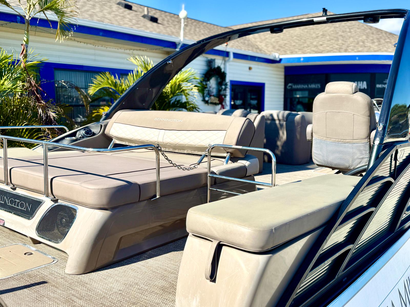 The versatility of the Bennington 28 RSB makes it the perfect choice for a variety of on-water activities. For families, it’s an ideal platform for swimming, picnicking, and exploring new destinations together. The spacious deck and comfortable seating make it easy to host gatherings, celebrate special occasions, or simply enjoy quality time with loved ones.Fishing enthusiasts will appreciate the stability and space offered by this pontoon boat, providing a comfortable and functional base for casting lines and reeling in the day’s catch. For those seeking a touch of luxury, the Bennington 28 RSB transforms any outing into a high-end experience, complete with stylish surroundings and powerful performance. Whether you’re seeking adventure, relaxation, or a bit of both, this pontoon boat for sale is ready to deliver.