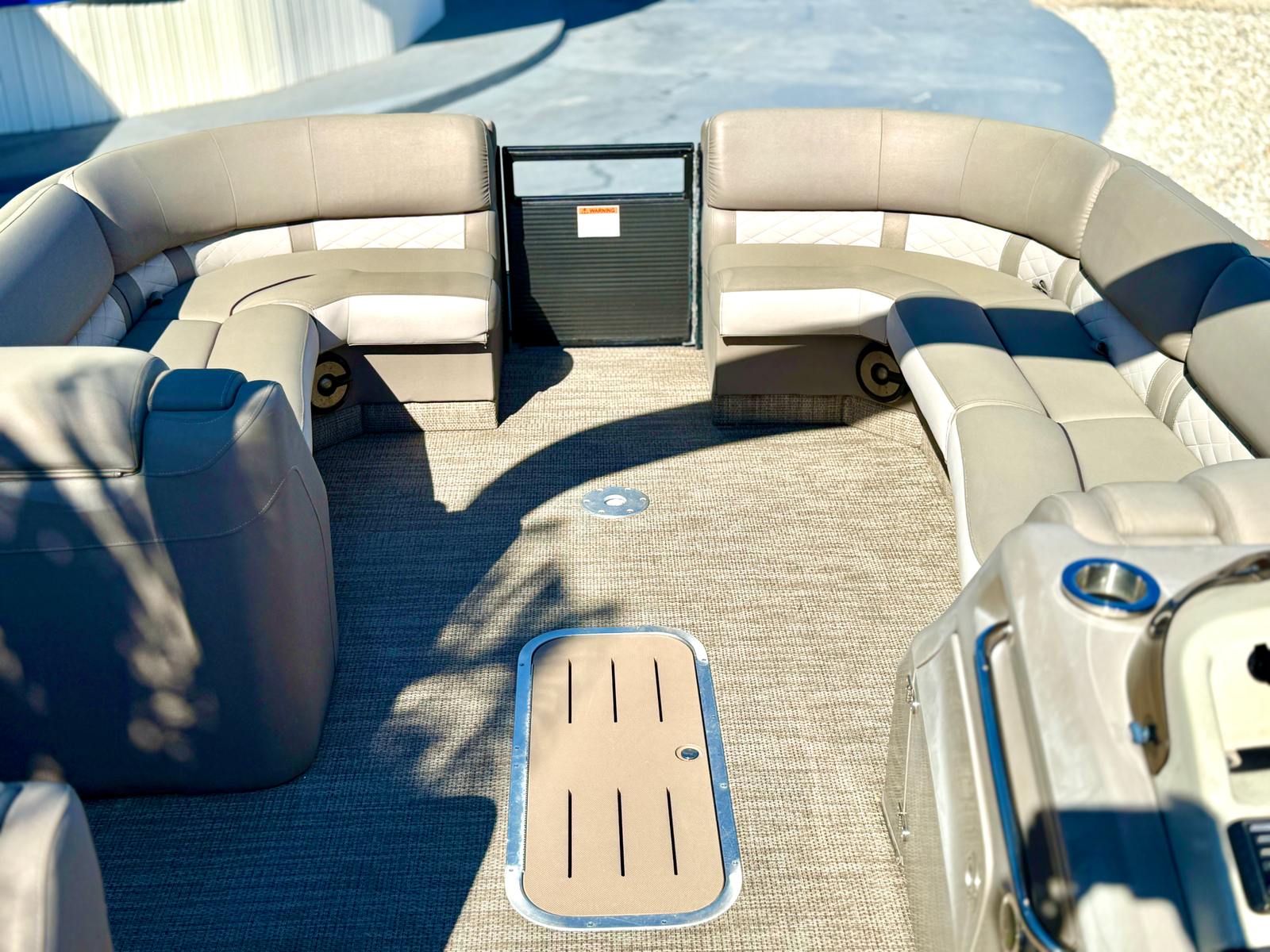Power and performance are at the heart of the Bennington 28 RSB. Equipped with twin engines delivering a combined 400 horsepower, this pontoon boat is built to thrill. The dual-engine setup provides impressive acceleration, smooth handling, and the confidence to navigate a variety of water conditions. Whether you’re cruising at a leisurely pace or opening up the throttle for an exhilarating ride, the Bennington 28 RSB offers a responsive and enjoyable experience. The robust horsepower ensures you have the power needed for watersports, towing, or simply making a statement on the water.