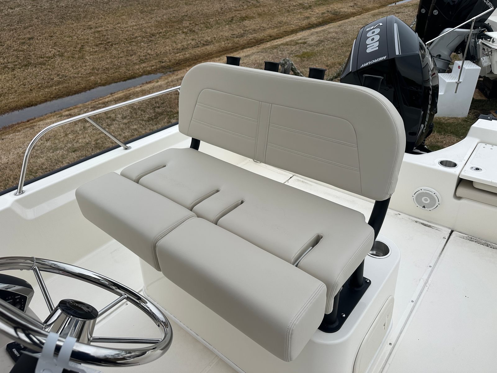 This Boston Whaler Center Console boat is packed with features designed to maximize comfort, convenience, and style. The hard top underside and hull are finished in crisp white, offering a clean and modern look. Black graphics, canvas, and frame add a striking contrast, giving the boat a distinctive and elegant profile. The split bow rail not only enhances safety but also adds to the boat’s classic aesthetic.The seating package and deluxe cockpit seating package ensure that every passenger enjoys a comfortable ride, whether you’re navigating choppy waters or relaxing at anchor. The thoughtfully designed seating arrangements provide ample space for socializing, sunbathing, or simply taking in the views. With the Center Console layout, you’ll benefit from unobstructed movement around the deck, making it easy to access every part of the boat.