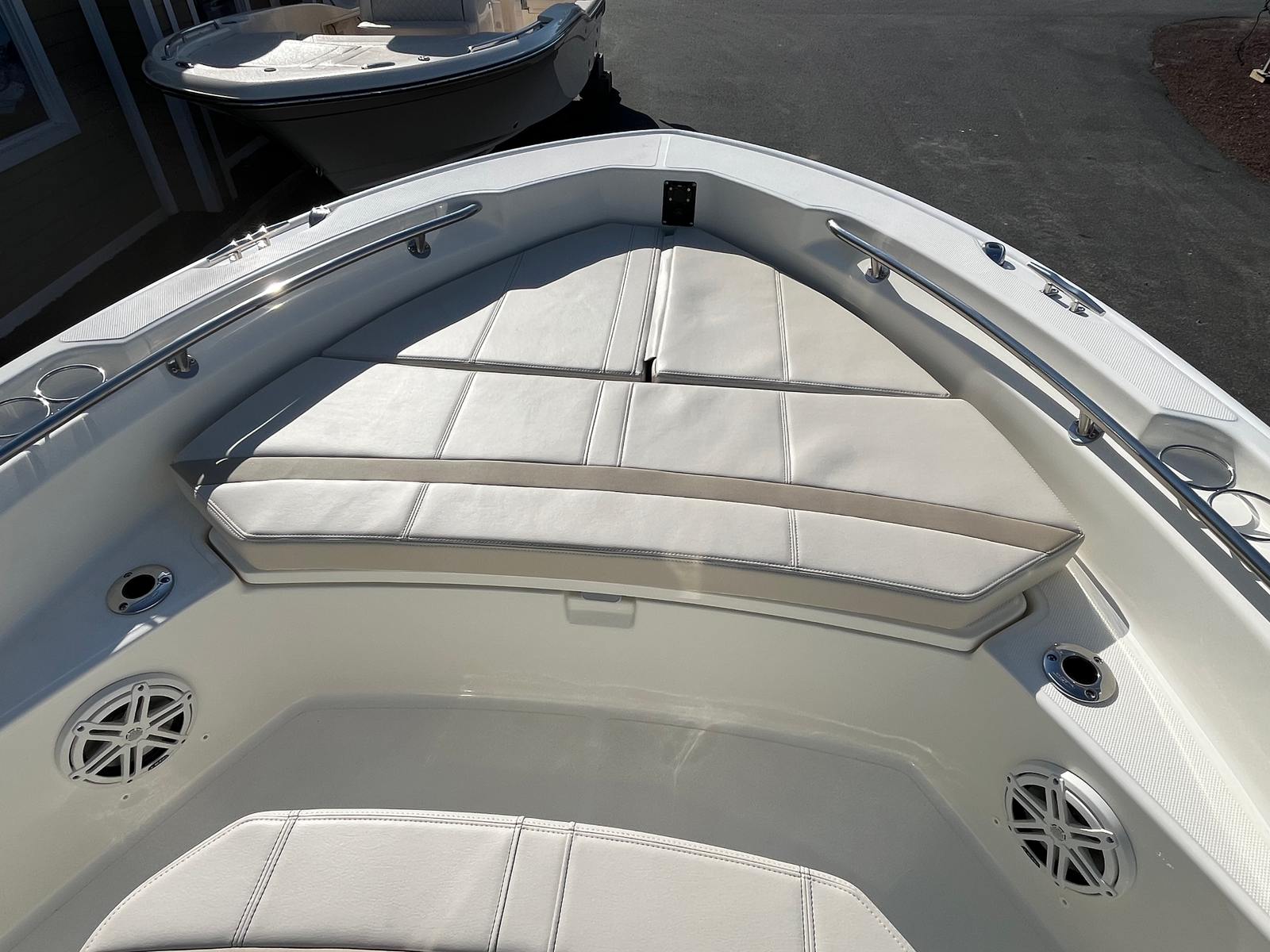 The bow cushion provides a cozy and inviting spot for families and friends to gather, creating memorable moments on the water. The white rub rail with S/S insert not only contributes to the boats aesthetic appeal but also offers enhanced durability, ensuring that the vessel stands up to the rigors of daily use and varying marine environments.