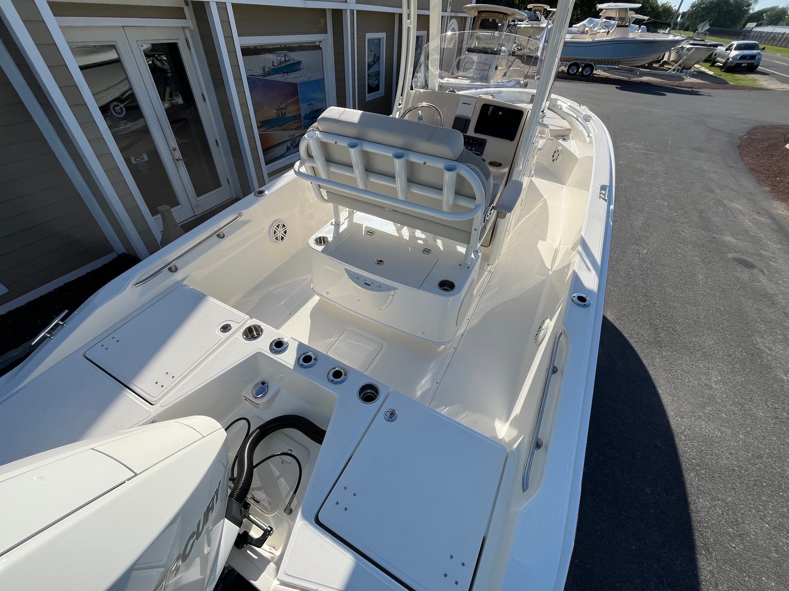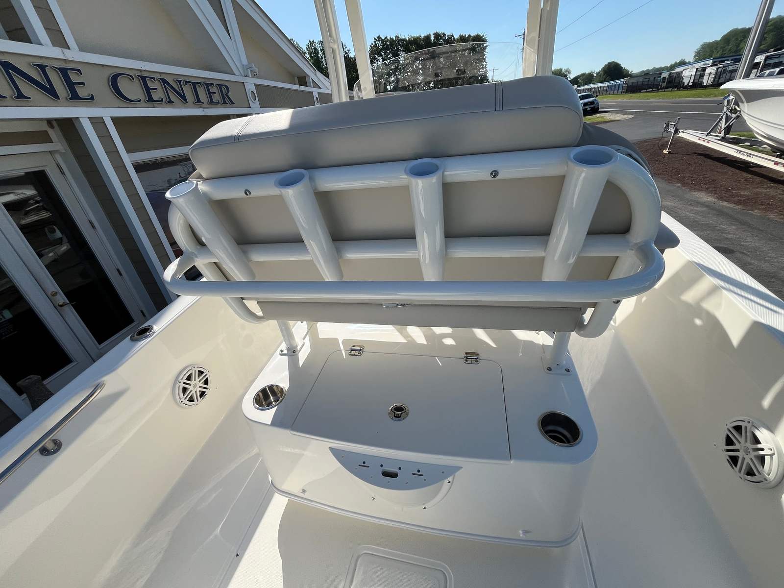The 220 Dauntless is not just about performance; it's also about style and functionality. Featuring a pristine white hull adorned with eye-catching blue graphics, this center console boat radiates elegance and sophistication. The blue canvas adds a vibrant touch while offering durability and protection against the elements, ensuring your boat remains looking sharp season after season.
