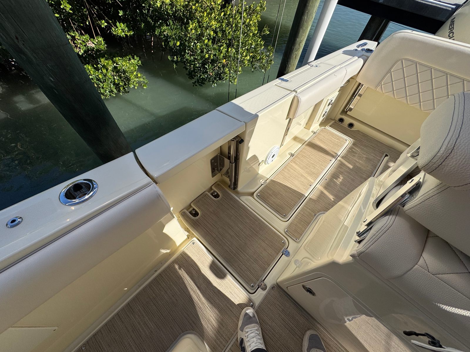 The transom bench and side seats can easily be folded out of the way for additional space on the boat. The open area is perfect for big water toys, other gear, or just for people and pets to move around more freely.