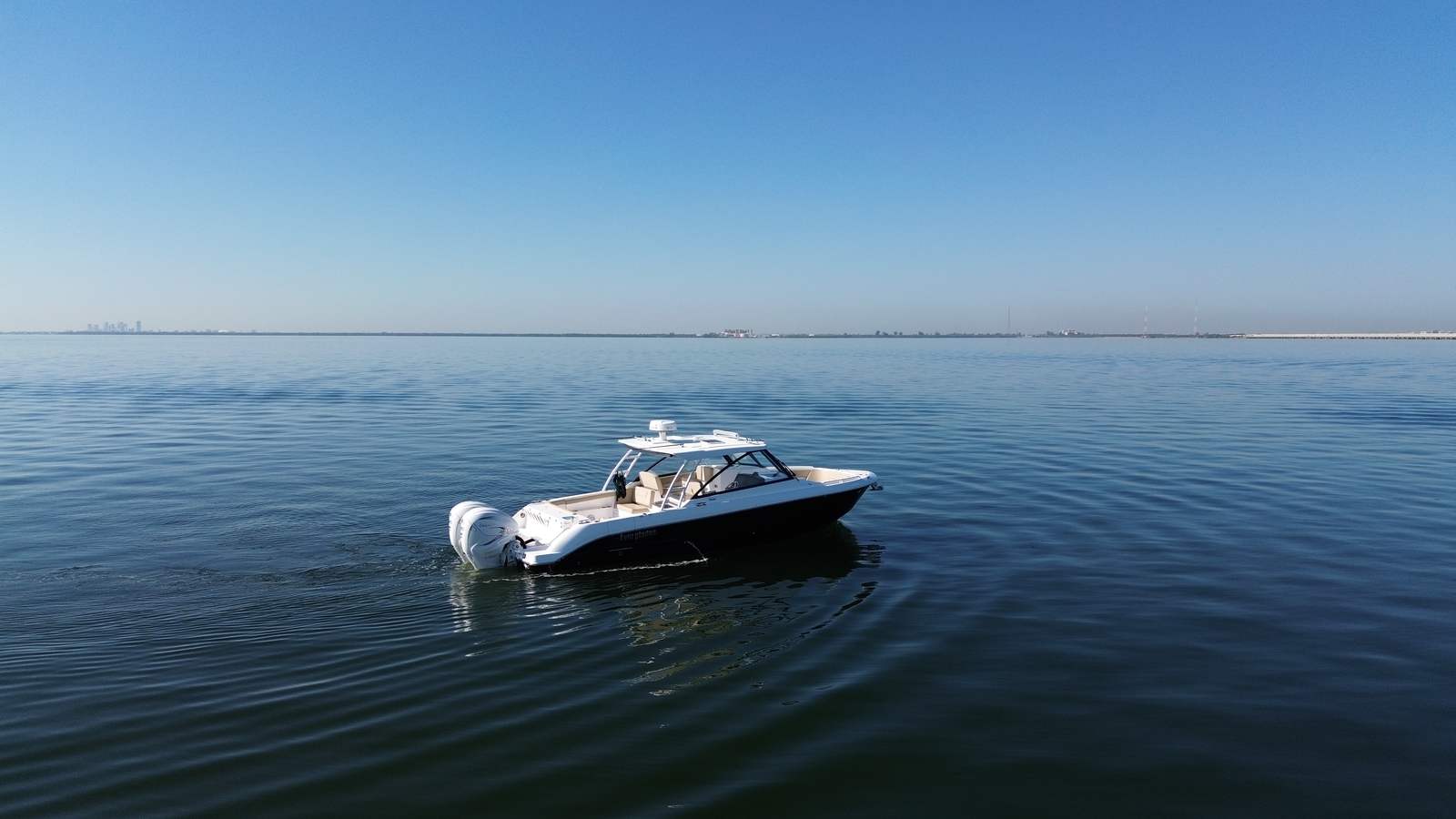 •Bow seating with FWD facing lounge cushions and backrests •Double wide helm seat to stbd