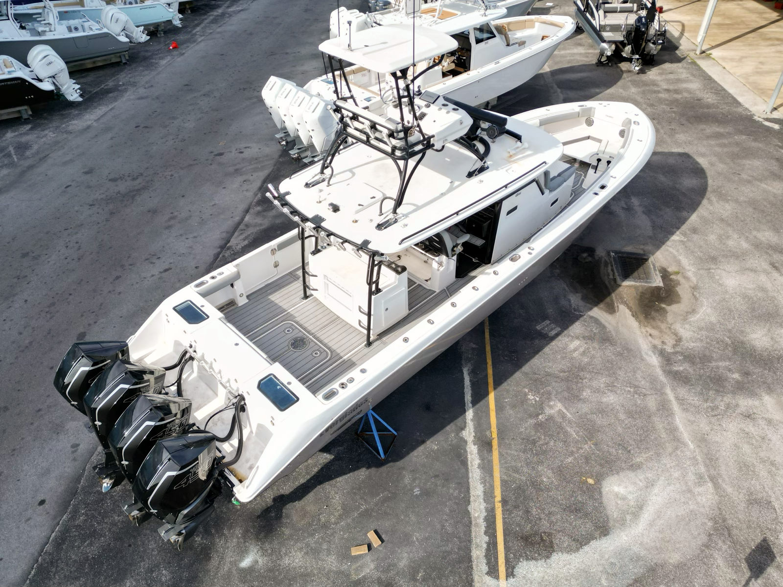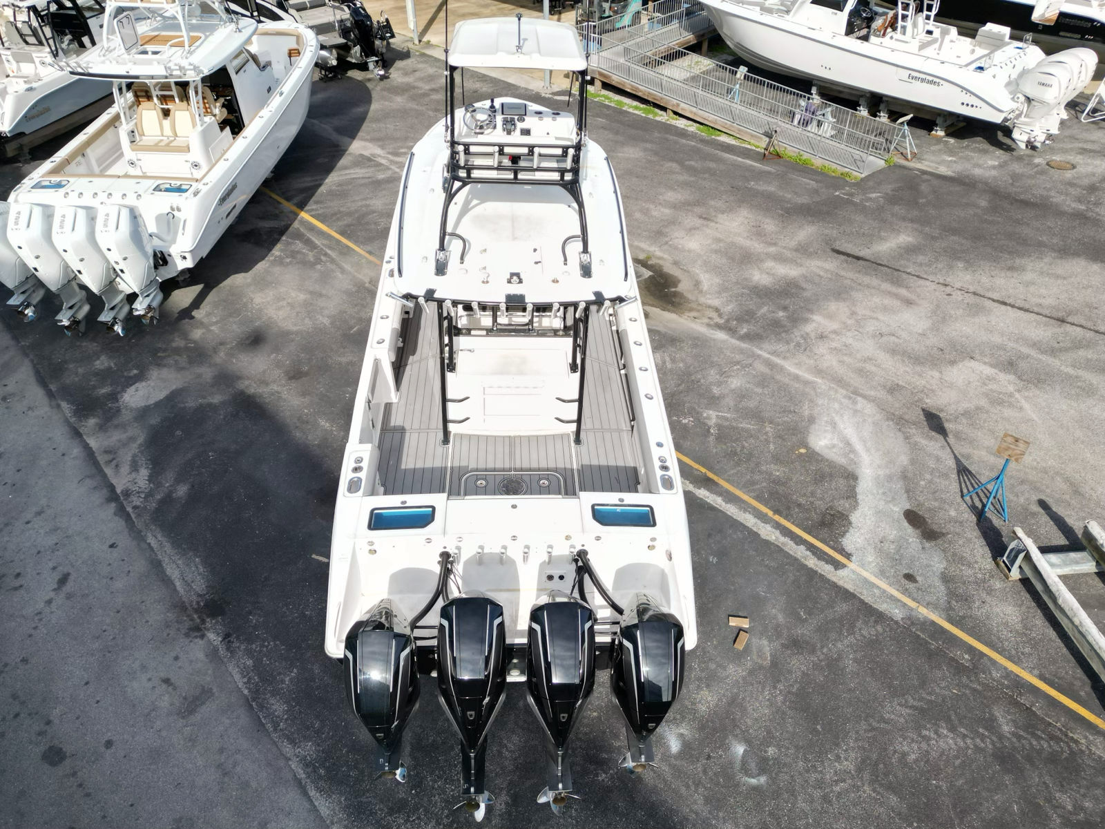 One of the defining features of this boat is its dealer-installed repower with 2020 Mercury 450R outboards. The original Yamaha F350 package produced 1,400 horsepower. The current Mercury setup produces 1,800 total horsepower, giving the boat a substantially more aggressive performance profile and stronger appeal in the current large center console market.