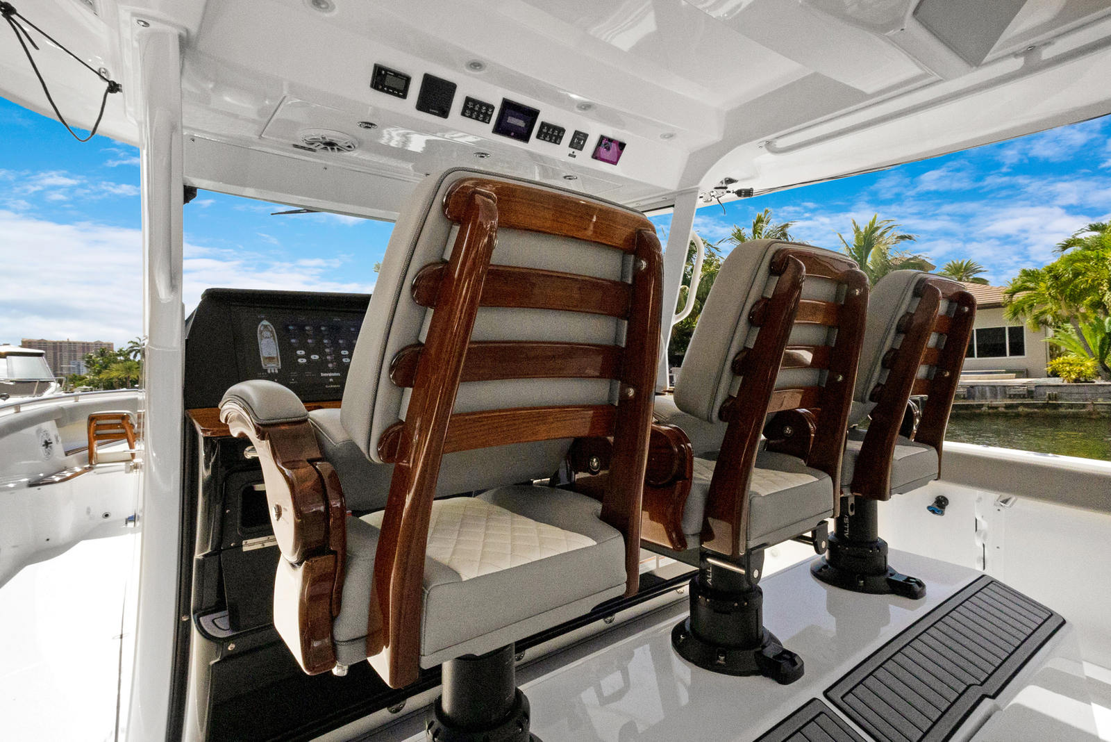 Practicality is at the core of the Everglades 455 CC’s design. The center console layout provides excellent visibility and control, making docking and maneuvering in tight spaces a breeze. Thoughtful storage solutions keep your gear organized and easily accessible, while the spacious deck allows for effortless movement during fishing trips or social gatherings. The triple-engine setup not only delivers outstanding performance but also offers redundancy and peace of mind for longer journeys.Fuel efficiency is enhanced by the advanced hull design, allowing you to spend more time on the water and less time at the fuel dock. The durable construction and high-quality materials ensure that this Everglades boat for sale will stand up to the rigors of frequent use, providing years of reliable service and enjoyment.