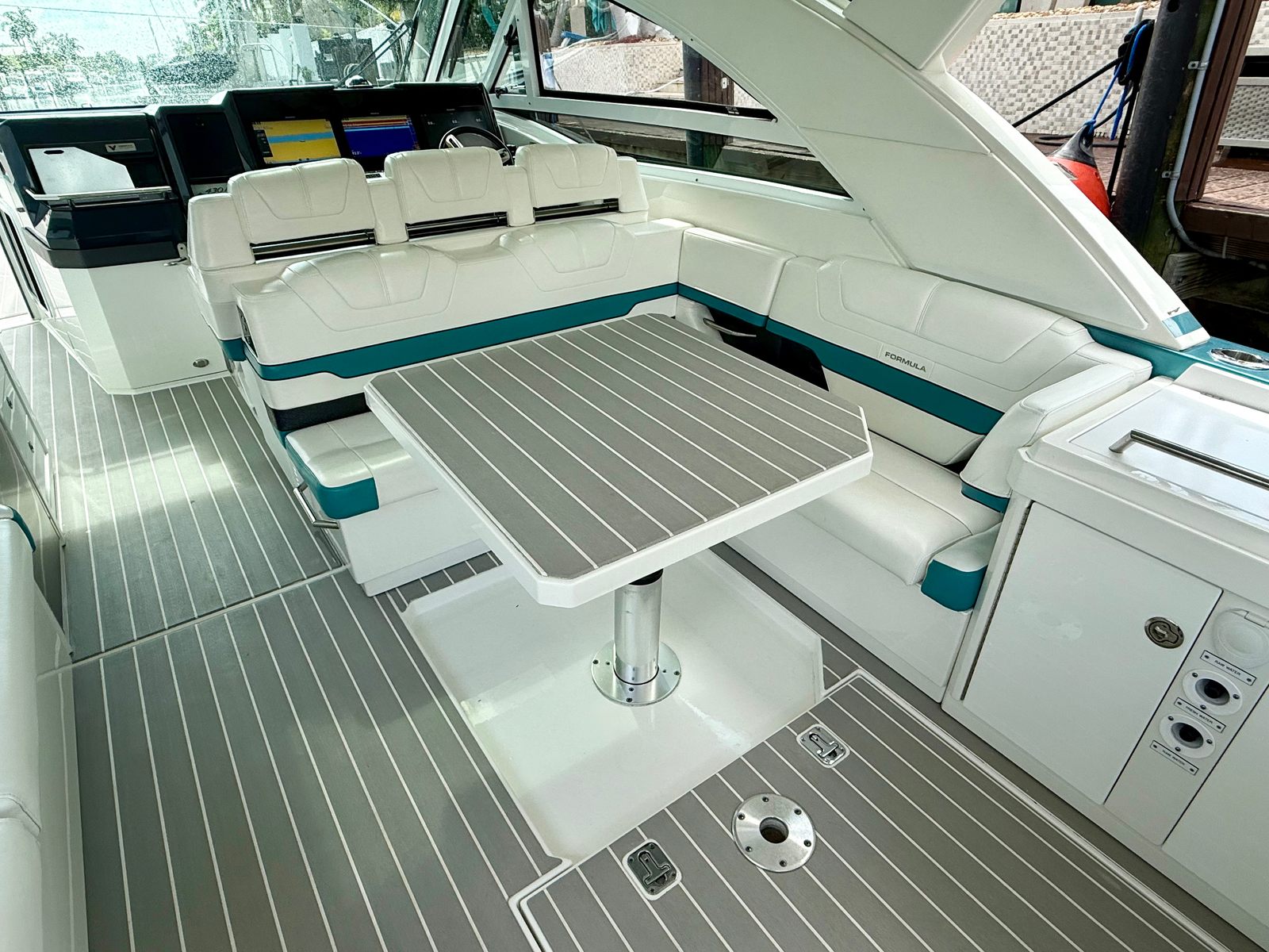 Woodgrain vinyl decking on swim platform and throughout the cockpit