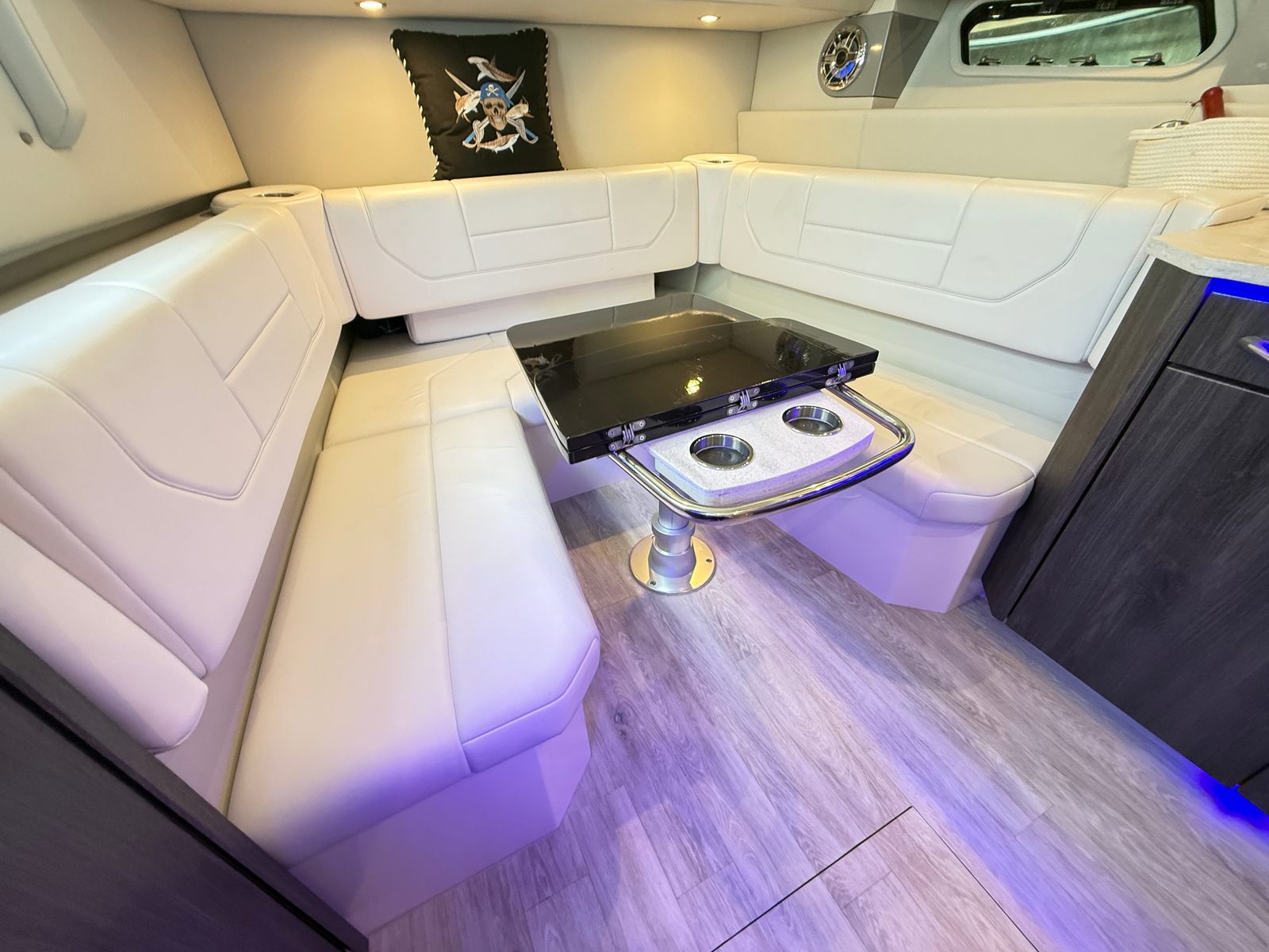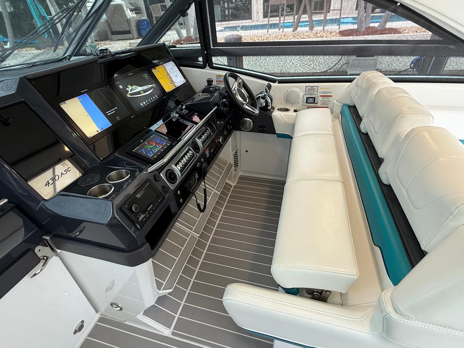 full height tinted windshield with wiper, port walk-thru door side wing glass vents and large, motorized opening coupe-top, glass sunroof with retractable sunshades and soft panels, blue LED accent lighting, dual flagstaff, flush mount LED spreader lights, flag staff and white dual air horn