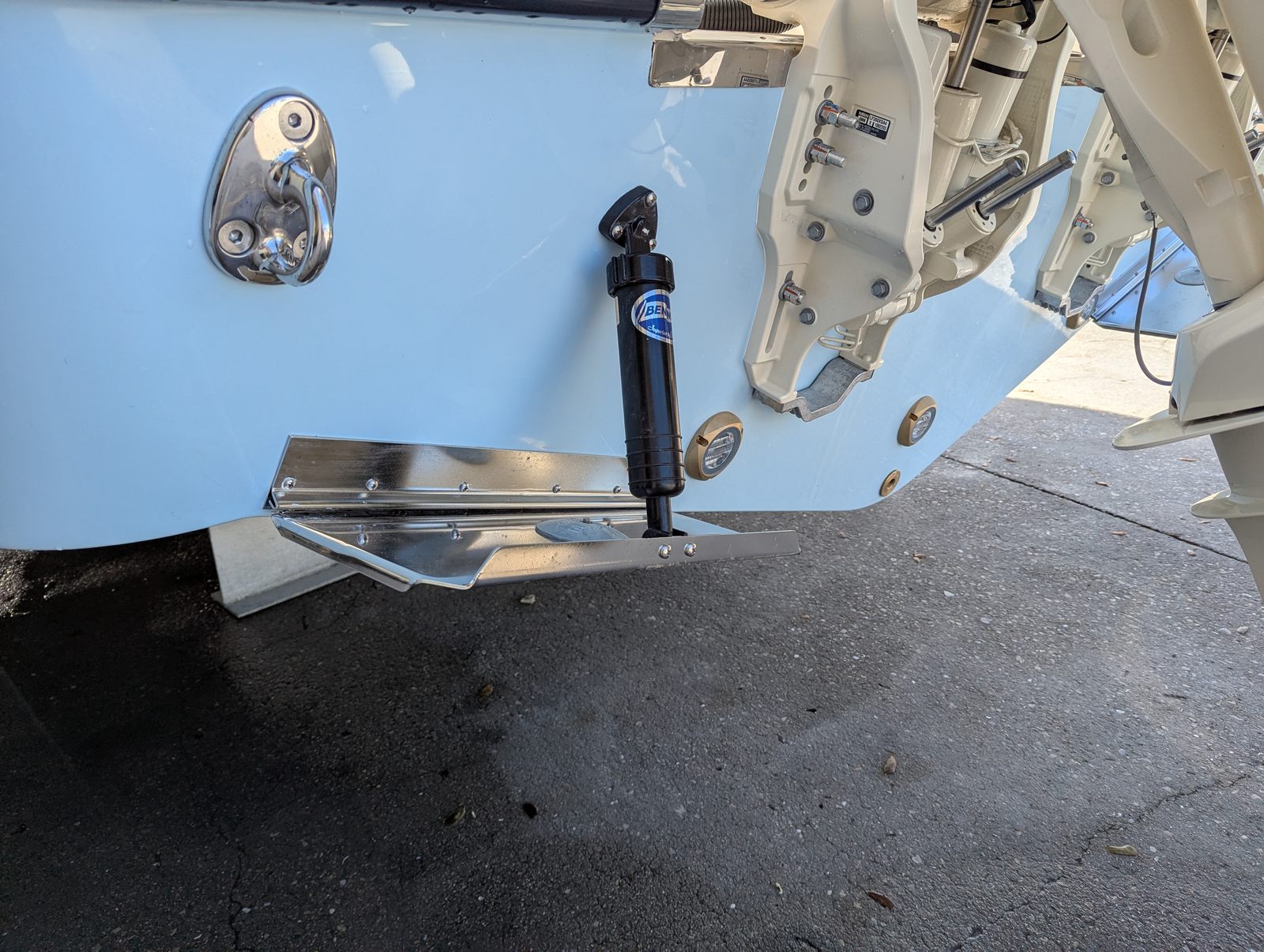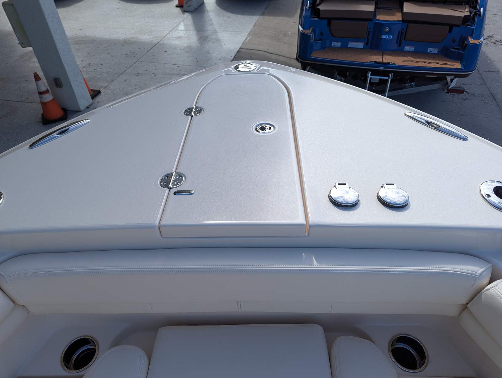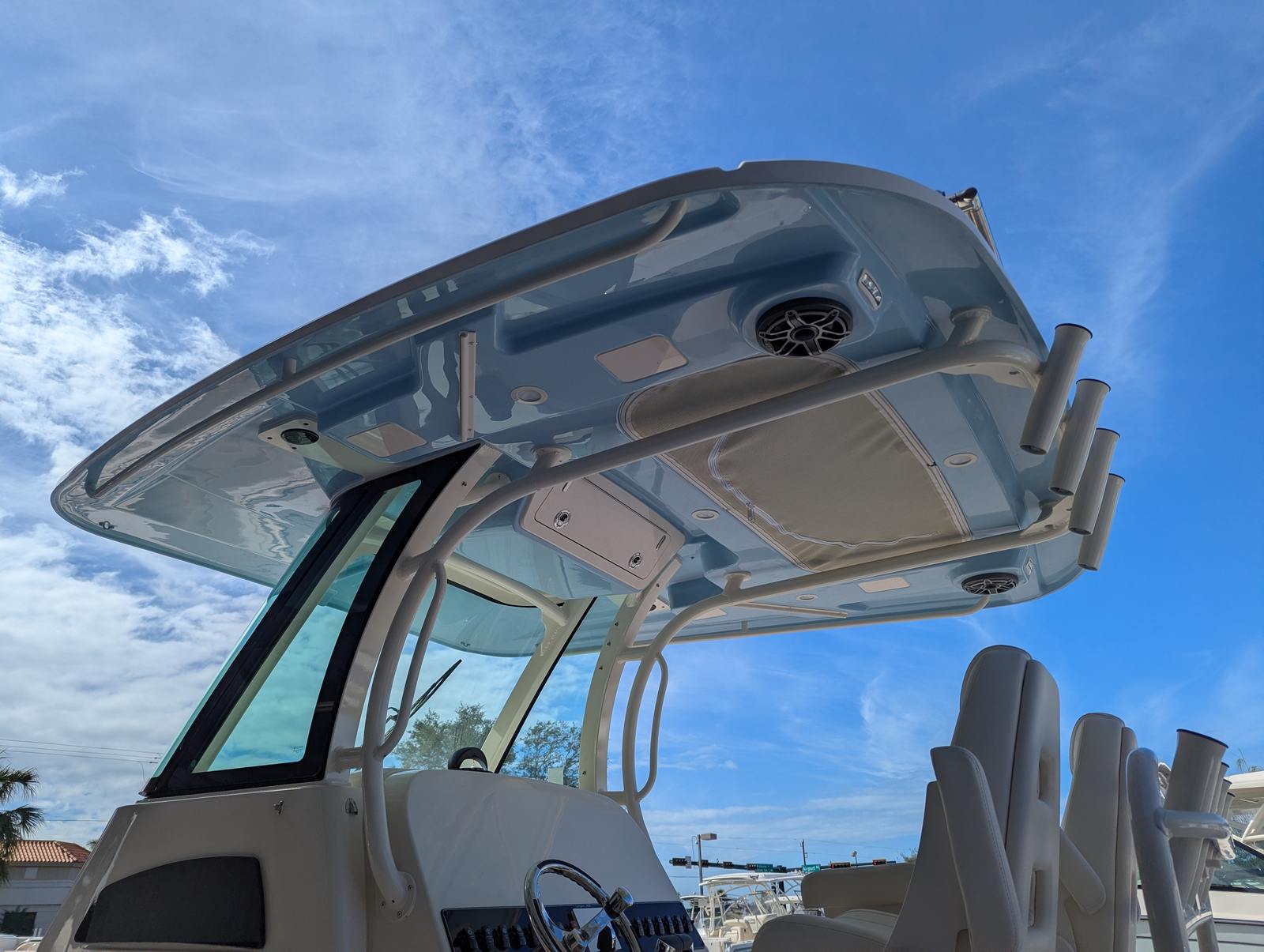 The Grady-White Canyon 306 is packed with special features that elevate your boating experience. The twin Yamaha F350 engines and Yamaha Pre-Rig ensure top-tier performance and reliability. The cast platform insert with cushion provides a comfortable spot for casting, lounging, or simply enjoying the view. Underwater lights add a touch of elegance and safety, illuminating the water for evening cruises or night fishing. The hull’s Celestial Blue color is complemented by the electric Sure Shade top in Oyster, offering shade and protection from the sun. Additional comfort is provided by the ivory bow shade and ivory T-top wings, while the T-top underside, also finished in Celestial Blue, ties the design together for a cohesive and stylish look.