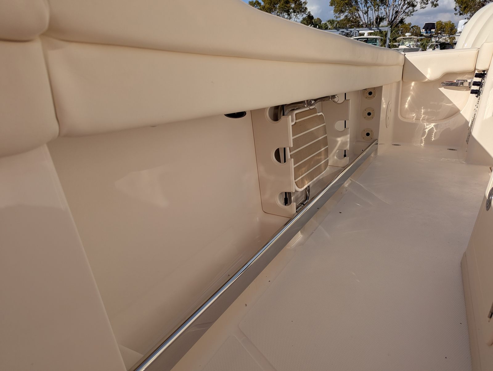 The 2026 Grady-White Canyon 336 is loaded with premium features designed to enhance your boating experience. The cockpit step provides easy access to and from the deck, while the bow table offers a perfect spot for alfresco dining or socializing with friends. For anglers, the casting platform insert with cushion transforms the bow into a versatile fishing or lounging area, and the raw water livewell keeps bait fresh and ready for action.As the sun sets, under water lights create a captivating ambiance, illuminating the water around your boat for evening cruises or night fishing. The whole hull gel color in Celestial Blue not only adds a touch of elegance but also showcases the boat’s modern aesthetic. The Sure Shade Top in Oyster provides ample protection from the sun, while the ivory T-Top wing curtains offer additional shelter from the elements, ensuring comfort in all weather conditions.