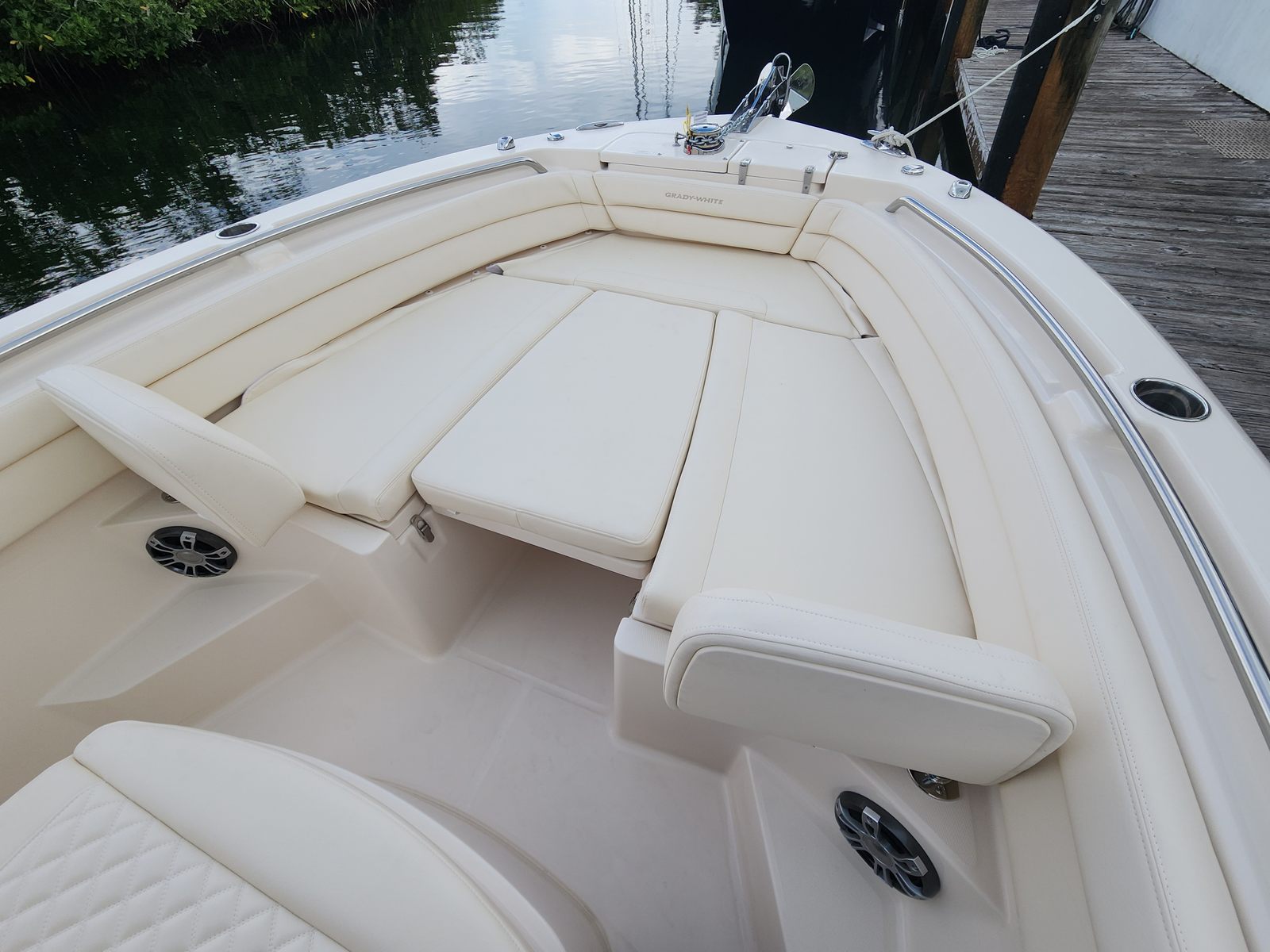 The Grady-White Fisherman 236 is as practical as it is enjoyable. Its center console design maximizes deck space and provides easy access to all areas of the boat, making it simple to move around whether you are casting lines or entertaining guests. The anchor windlass with bow roller streamlines the anchoring process, saving time and effort when you want to stop and enjoy a swim or lunch on the water. The cockpit step on the port side enhances boarding and disembarking, especially when docked or rafted up with other boats. The head macerator ensures that longer trips remain comfortable, while the windshield wiper keeps your view clear in changing weather conditions. The efficient Yamaha F350XSA2 engine not only delivers impressive power but also helps keep fuel costs manageable, making this center console boat a smart choice for frequent outings.